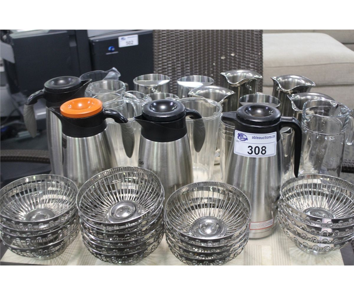 CONTENTS OF TABLE TOP, MISC. COFFEE / TEA SUPPLIES AND BREAD BOWLS