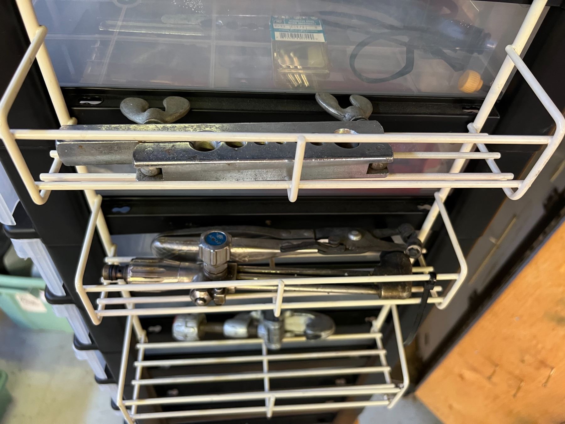 CONTENTS OF TOOL CRIB - BINS MUST BE UNSCREWED FROM SHELF - 3/8" & 1/2" AIR RATCHETS, NIBBLER, ENGRAVER ELECTRICAL COMPONENTS, NUTS & BOLTS, PNEUMATIC DRILLS, SANDER, CHISELS, METAL RODS, SAW BLADES ETC