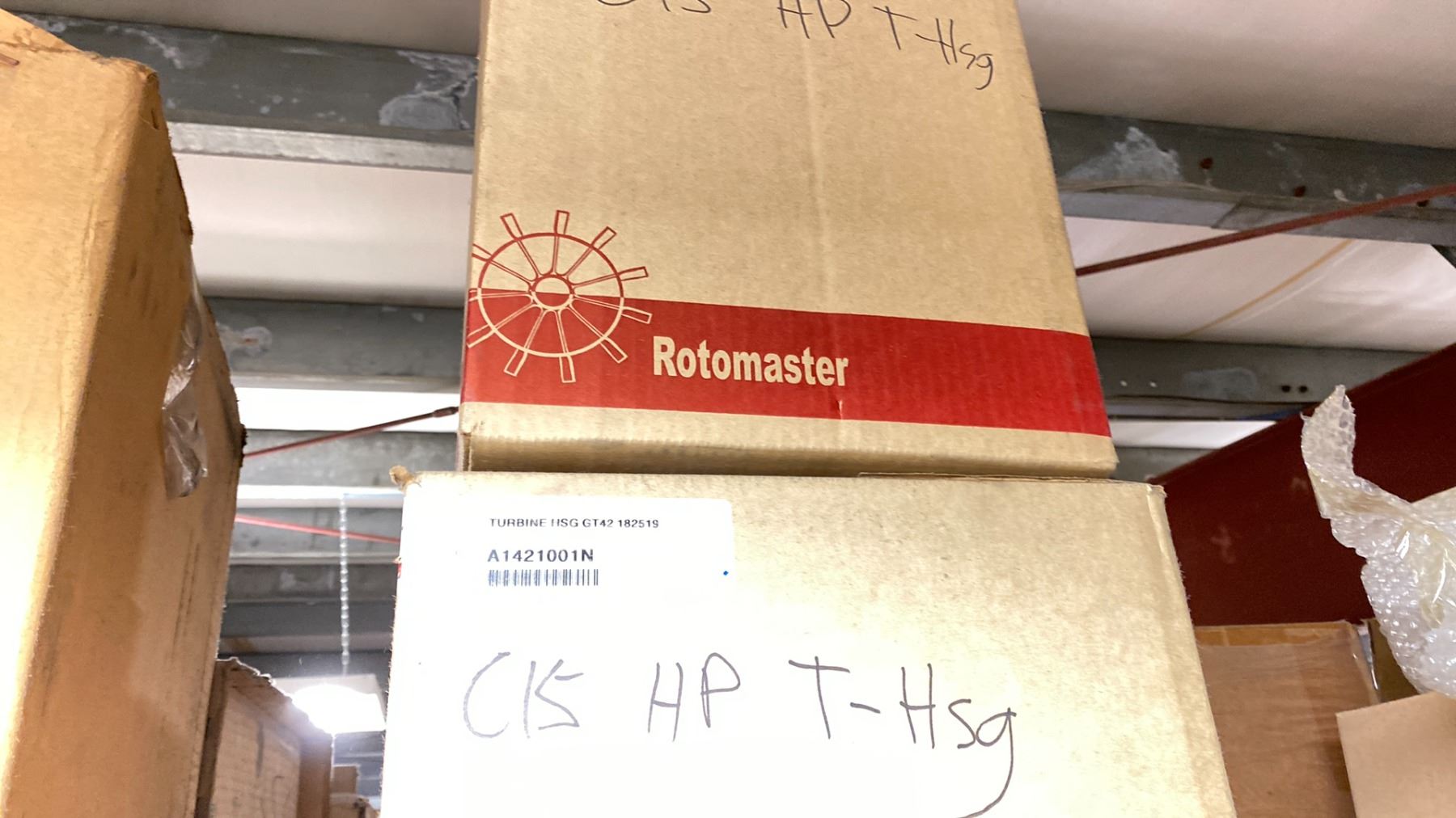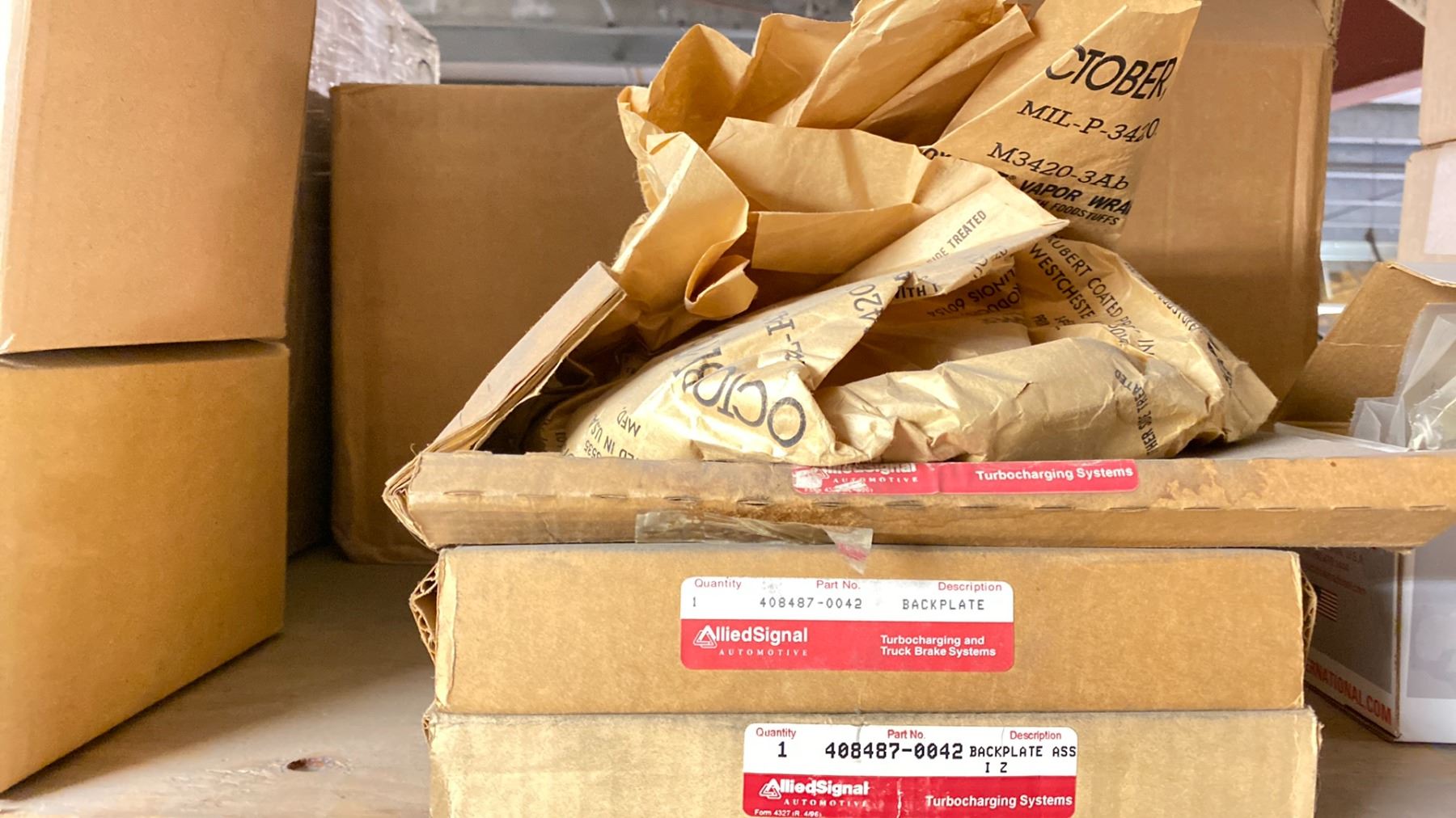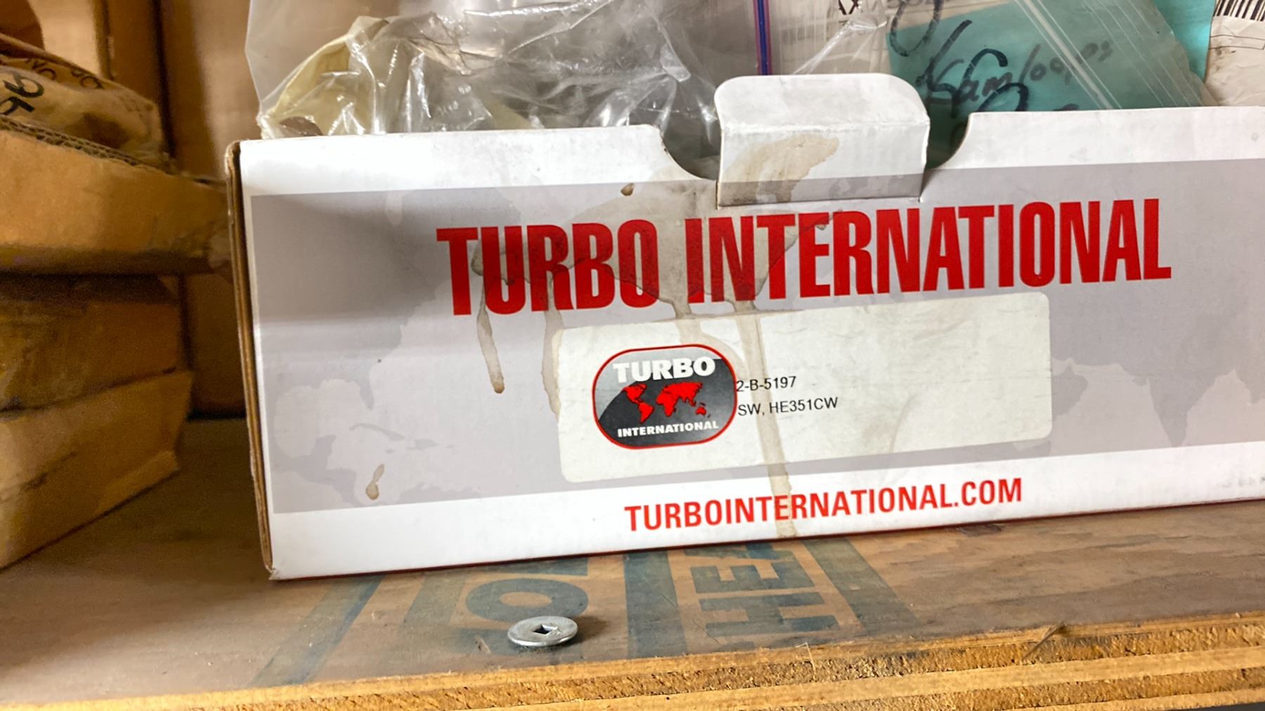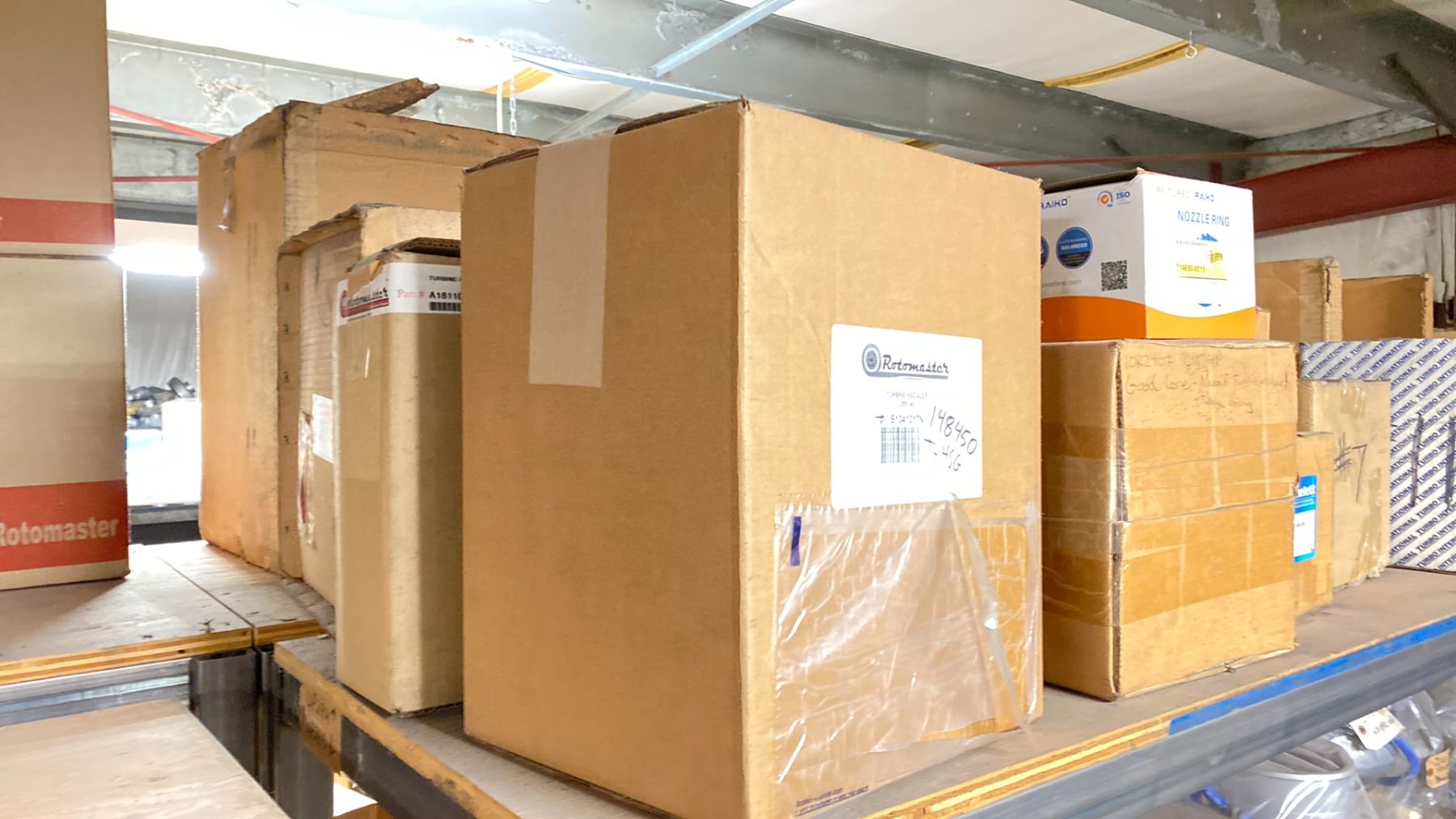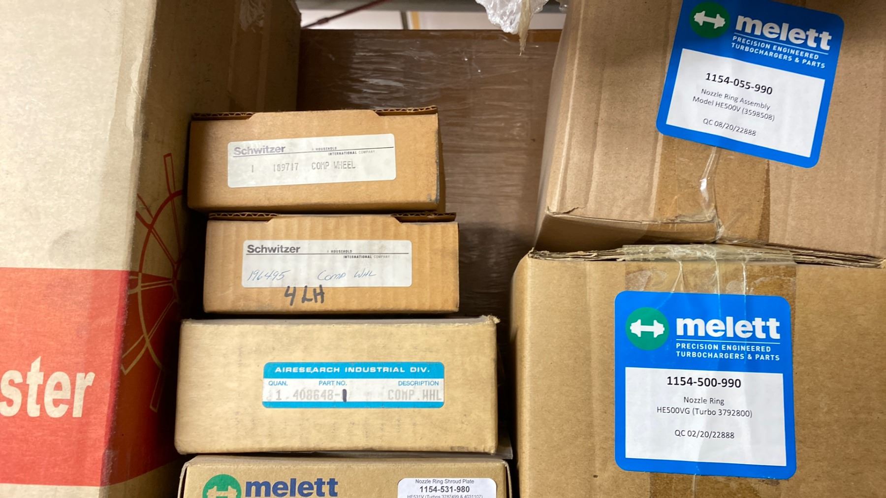 CONTENTS OF TOP SHELF FRONT AND BACK, WITH TURBO CHARGER REBUILD COMPONENTS. PLUGS, COMPRESSOR WHEELS, NOZZLE RINGS, GASKETS, LARGE INVENTORY