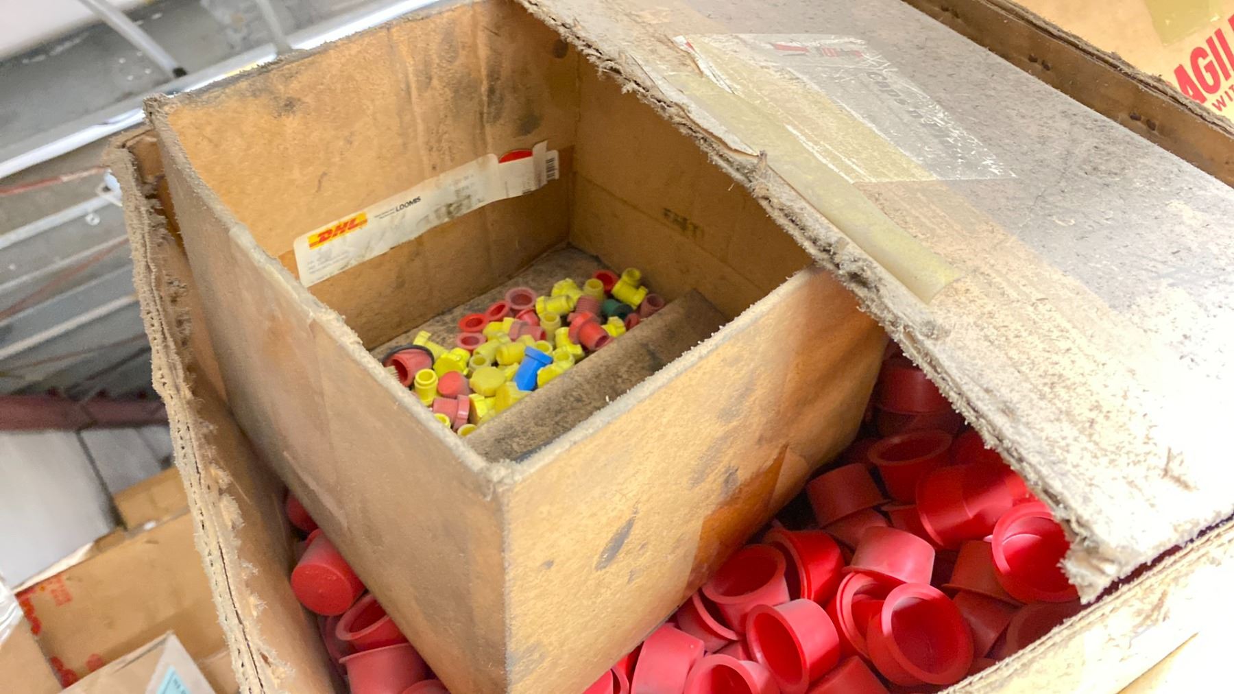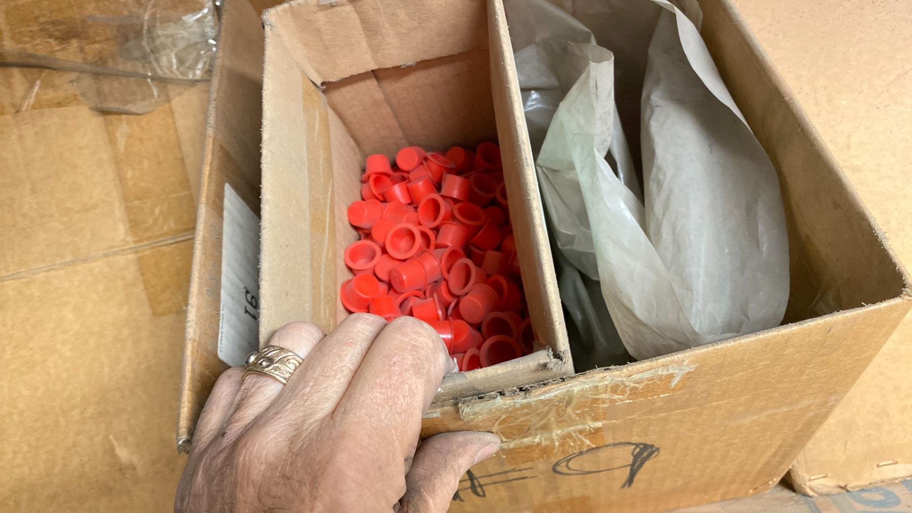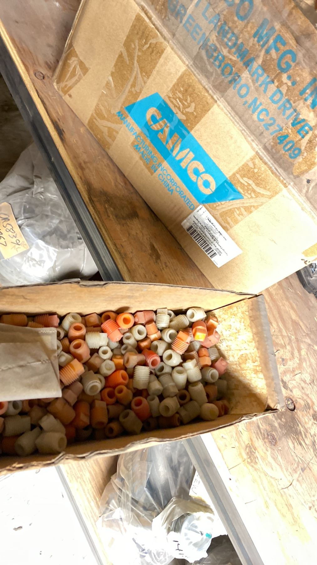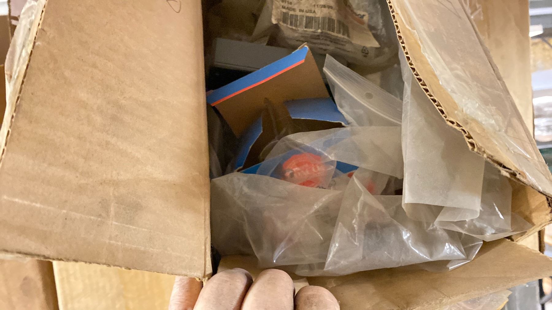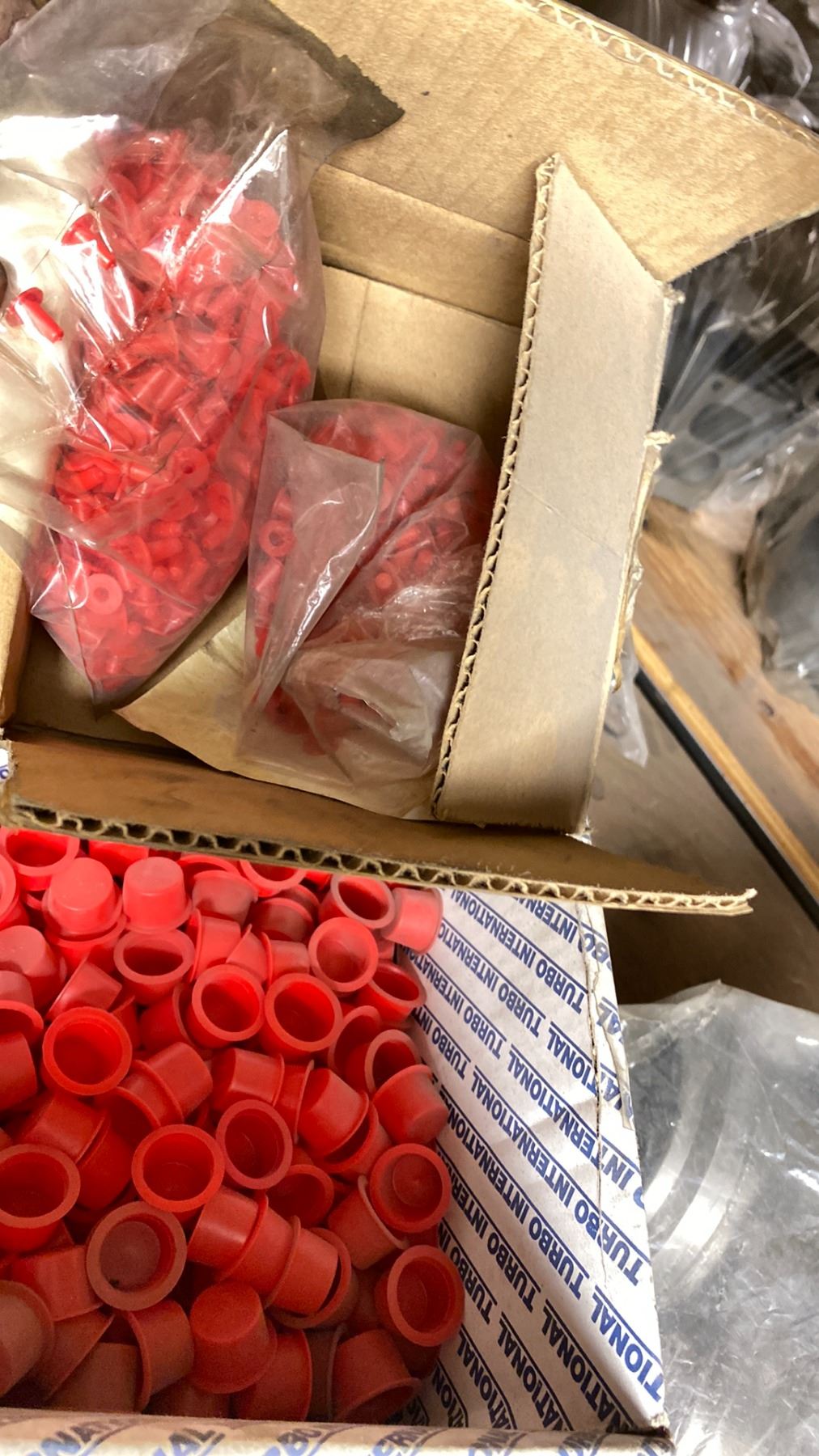 CONTENTS OF TOP SHELF FRONT AND BACK, WITH TURBO CHARGER REBUILD COMPONENTS. PLUGS, COMPRESSOR WHEELS, NOZZLE RINGS, GASKETS, LARGE INVENTORY