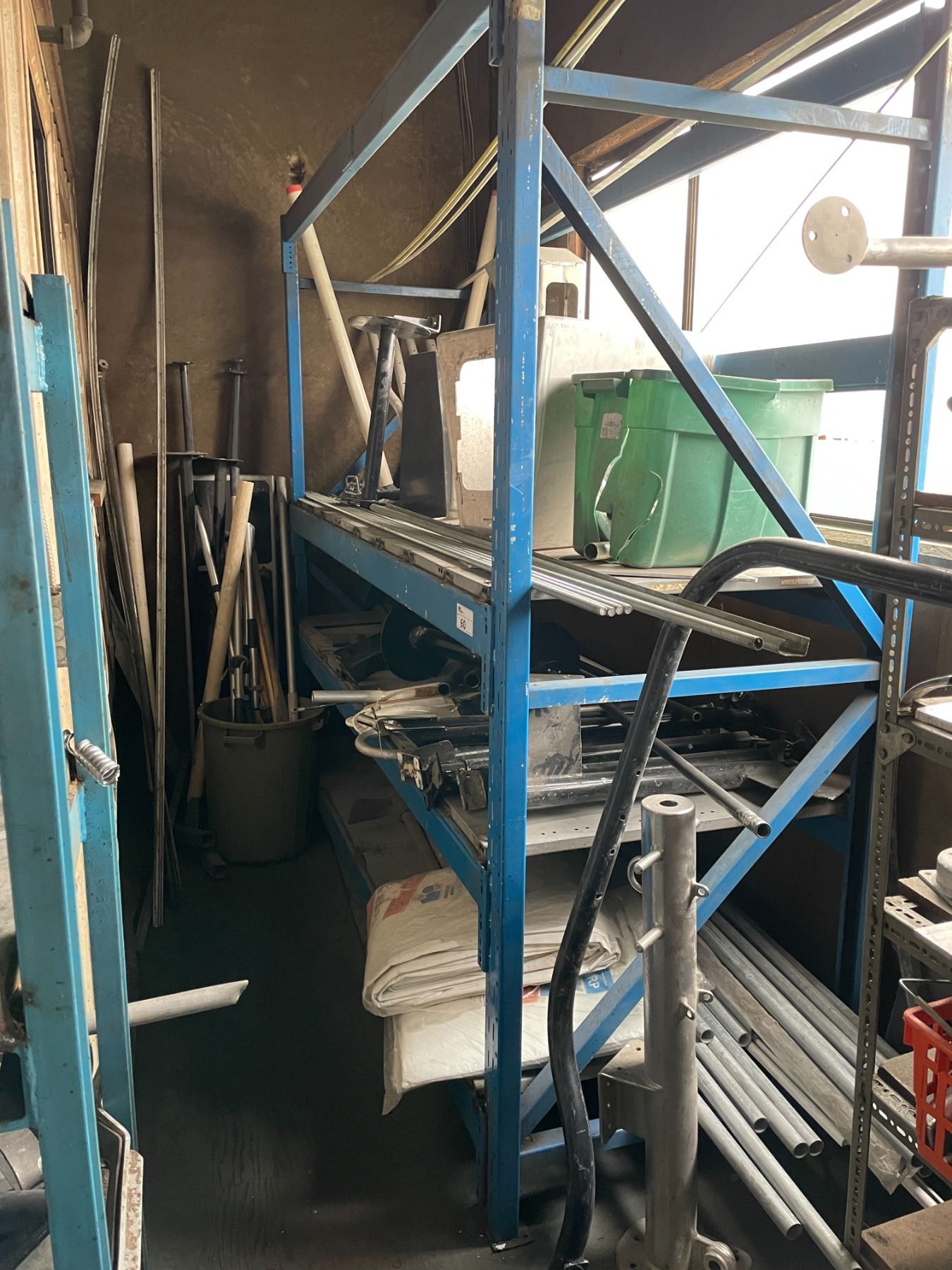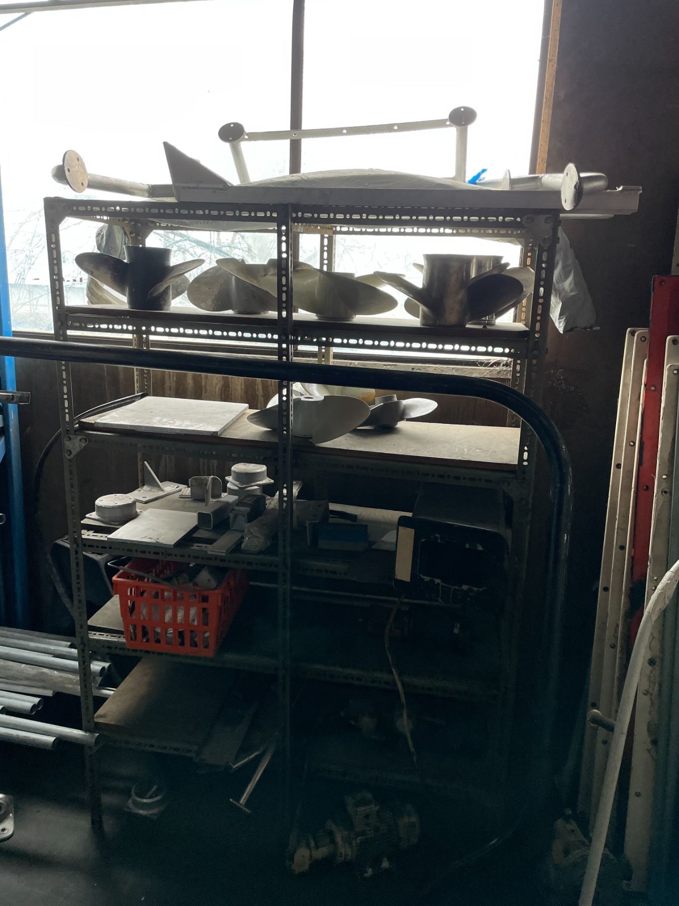 CONTENTS OF UPPER MEZZANINE CORNER INCLUDING: ASSORTED METAL, PROPELLERS, BOAT PARTS, 2 SHELVES & CONTENTS OF UPPER LUNCHROOM (SHELVES NOT INCLUDED)