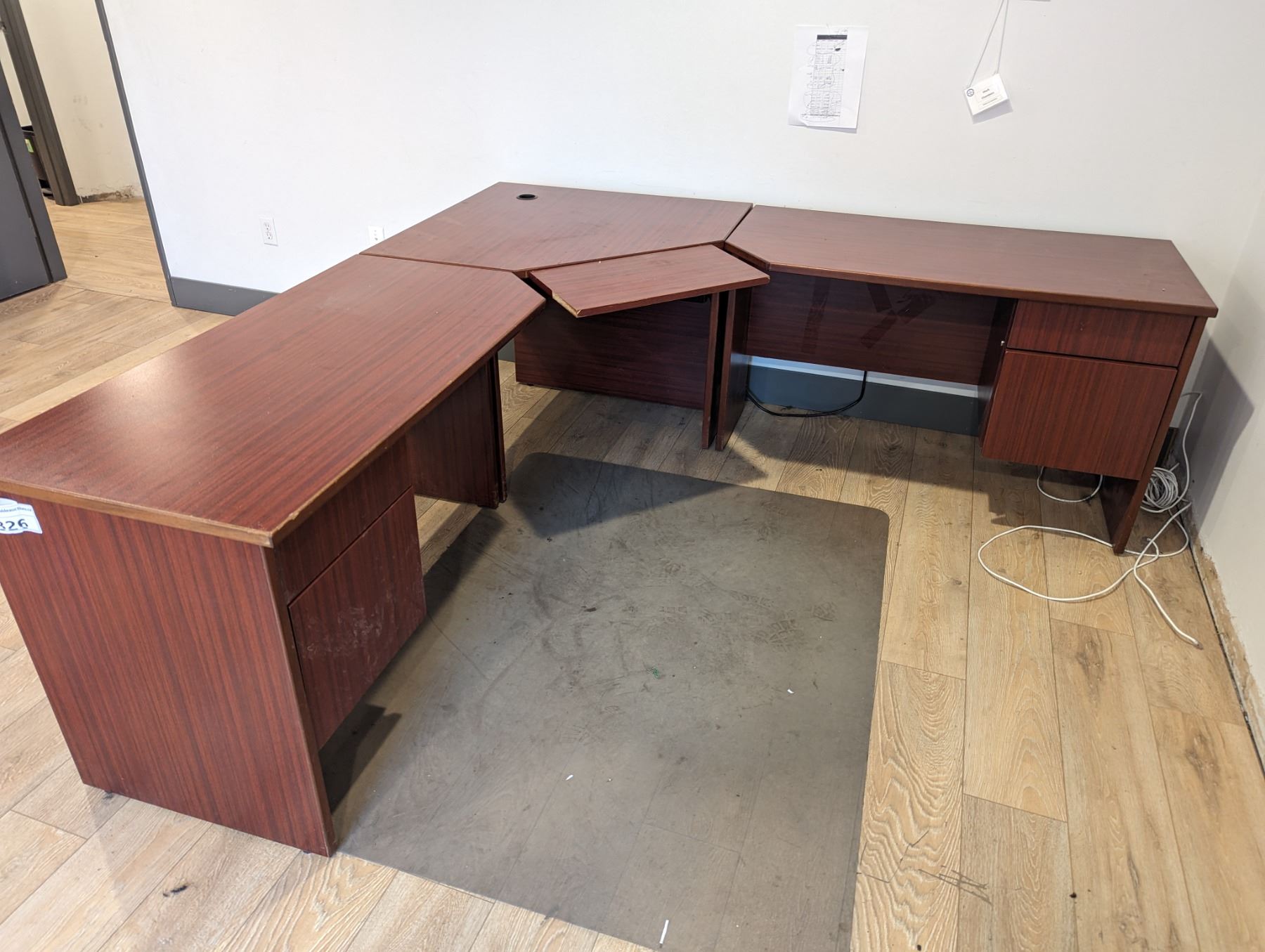CONTENTS OF UPPER MIDDLE OFFICE. CHERRY COLOURED CORNER DESK 7'X7', 6' CREDENZA, 5 ASST CHAIRS