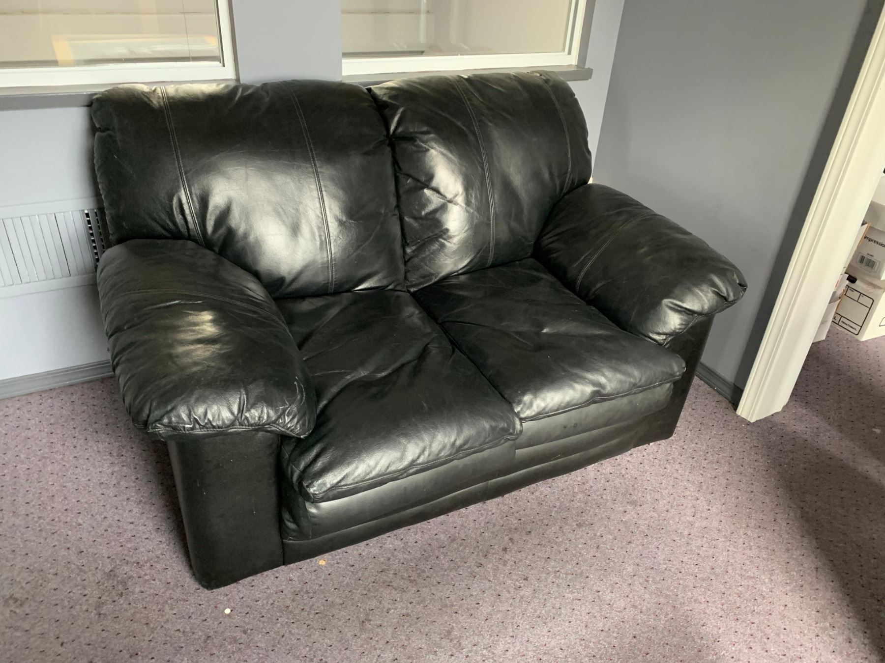 CONTENTS OF UPPER REPAIR OFFICE INCLUDING ; DANBY BARFRIDGE, LEATHER LOVE SEAT, MAPLE COCKTAIL TABLE & ASSORTED ART WORK