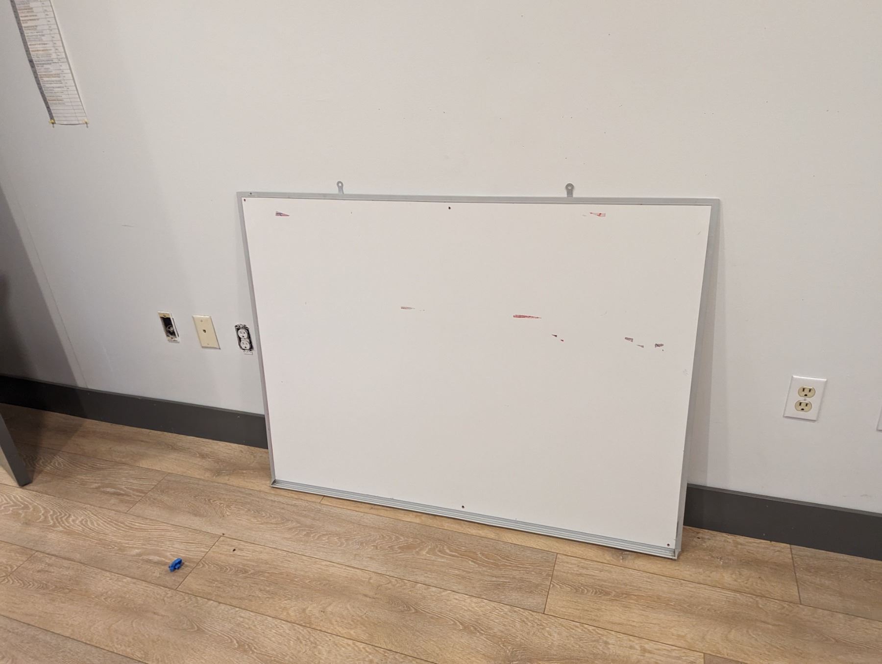 CONTENTS OF UPSTAIRS END OFFICE. 48" WHITE BOARD, 5' CREDENZA, ASST CHAIRS, 4 ASST DESKS, STAPLER
