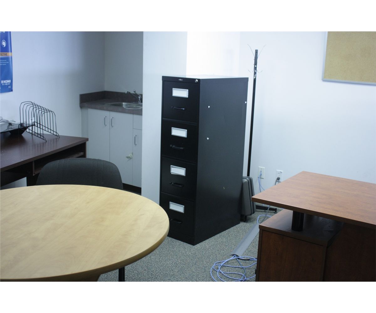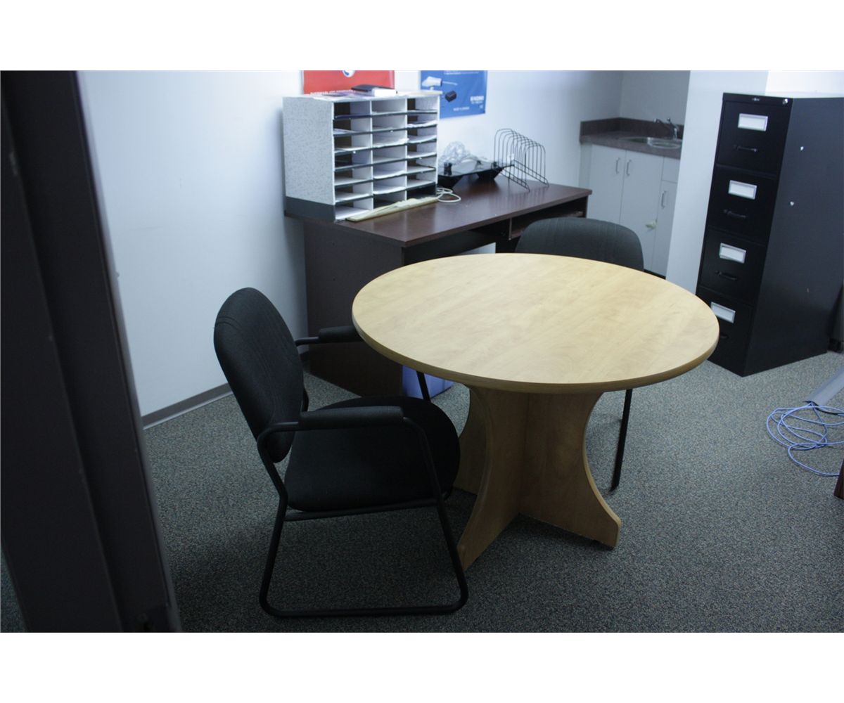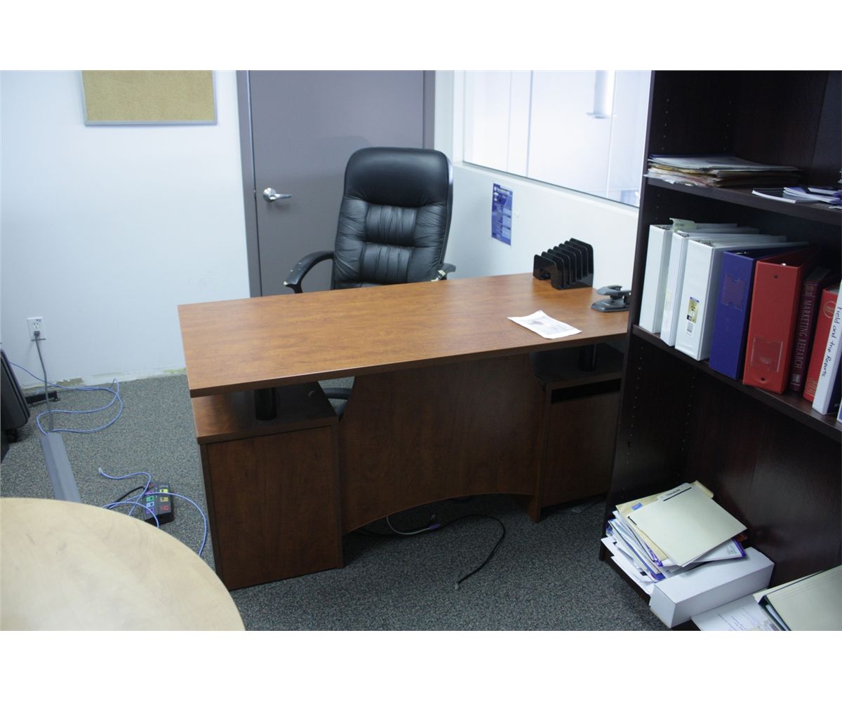 CONTENTS OF UPSTAIRS OFFICE INCL: 2 DESKS, BOOK CASE, ROUND TABLE, OFFICE CHAIR, 2 CLIENT CHAIRS AND FILE CABINET