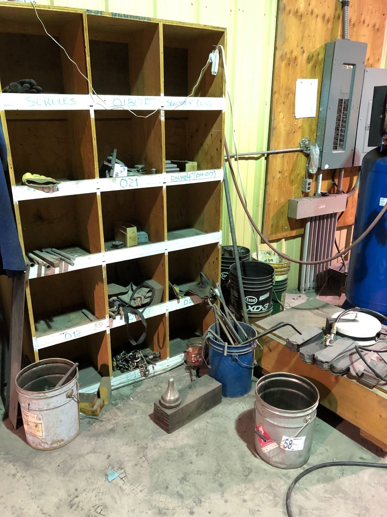 CONTENTS OF WOOD PARTS BIN AND ASSORTED PARTS IN AREA, BIN INCLUDED
