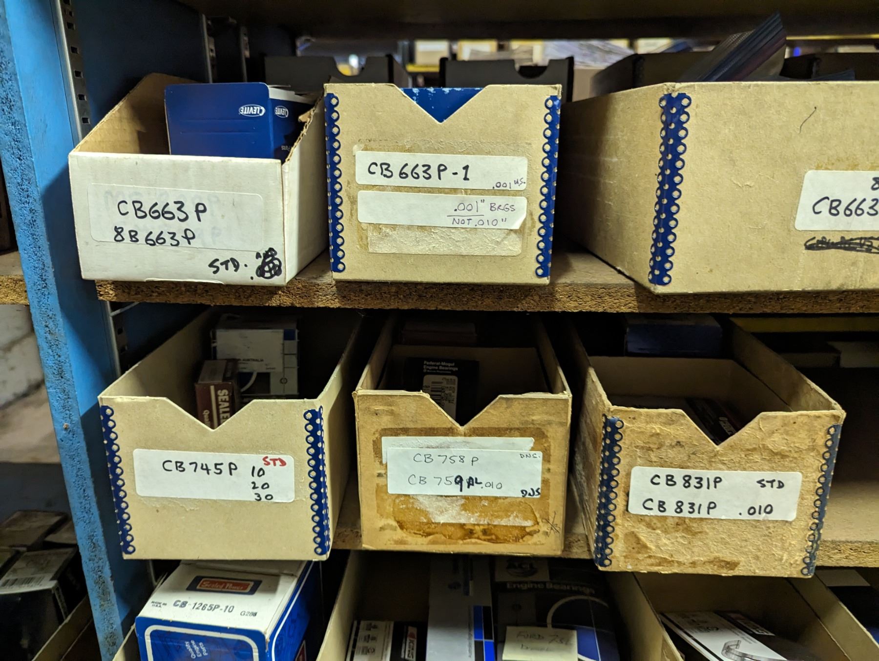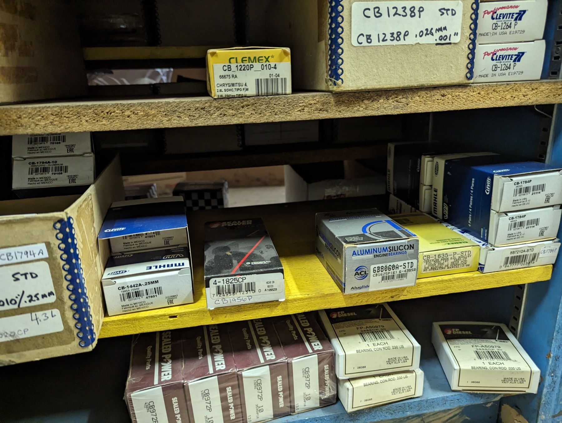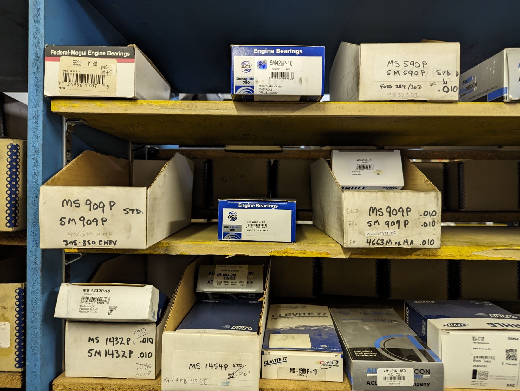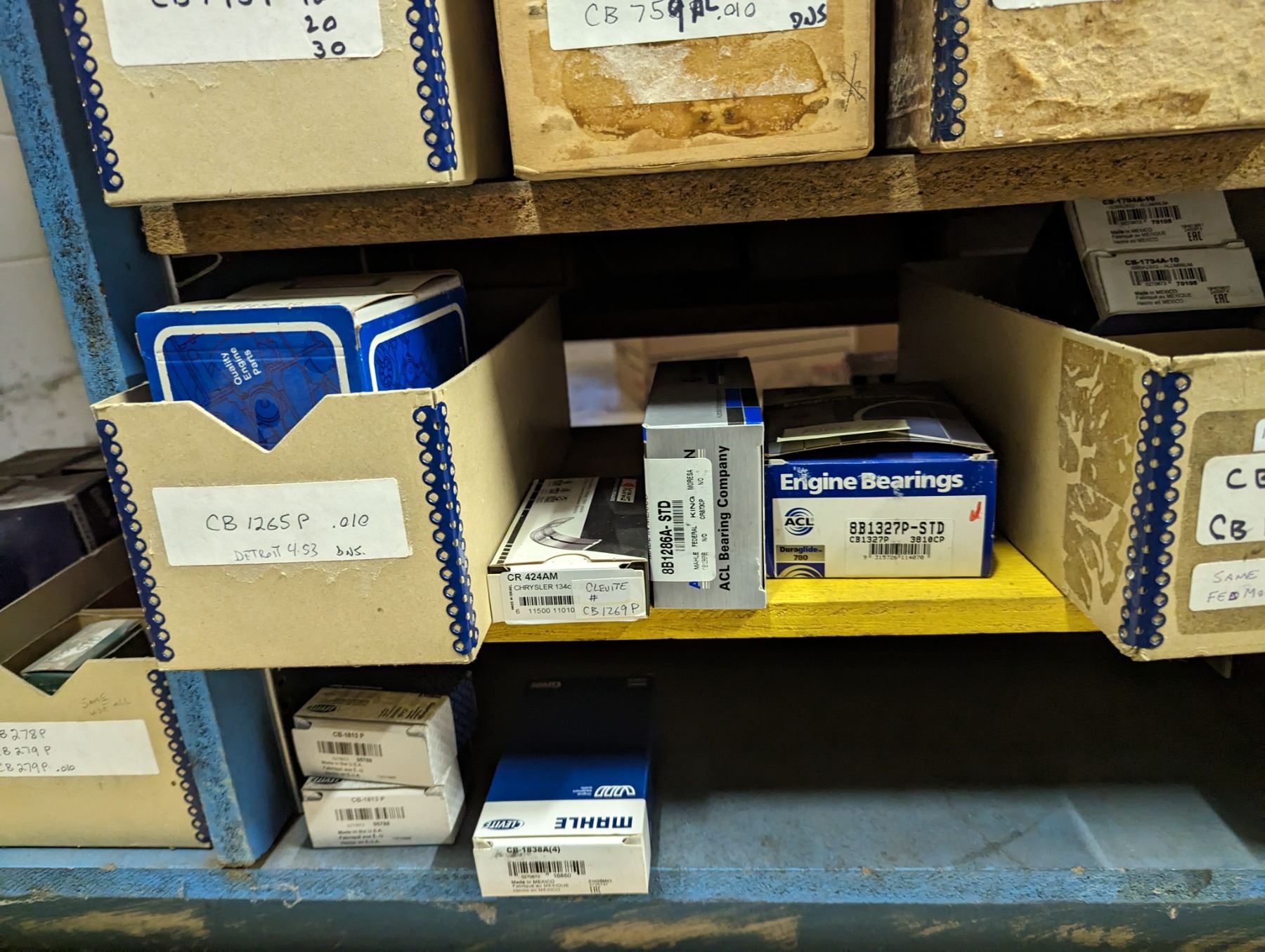 CONTENTS TOP TO BOTTOM OF ONE SHELF; ENGINE BEARINGS FOR ASSORTED MAKES AND MODELS, THESE ARE MAIN BEARING SETS PLUS ASSORTED ENGINE BEARINGS ETC