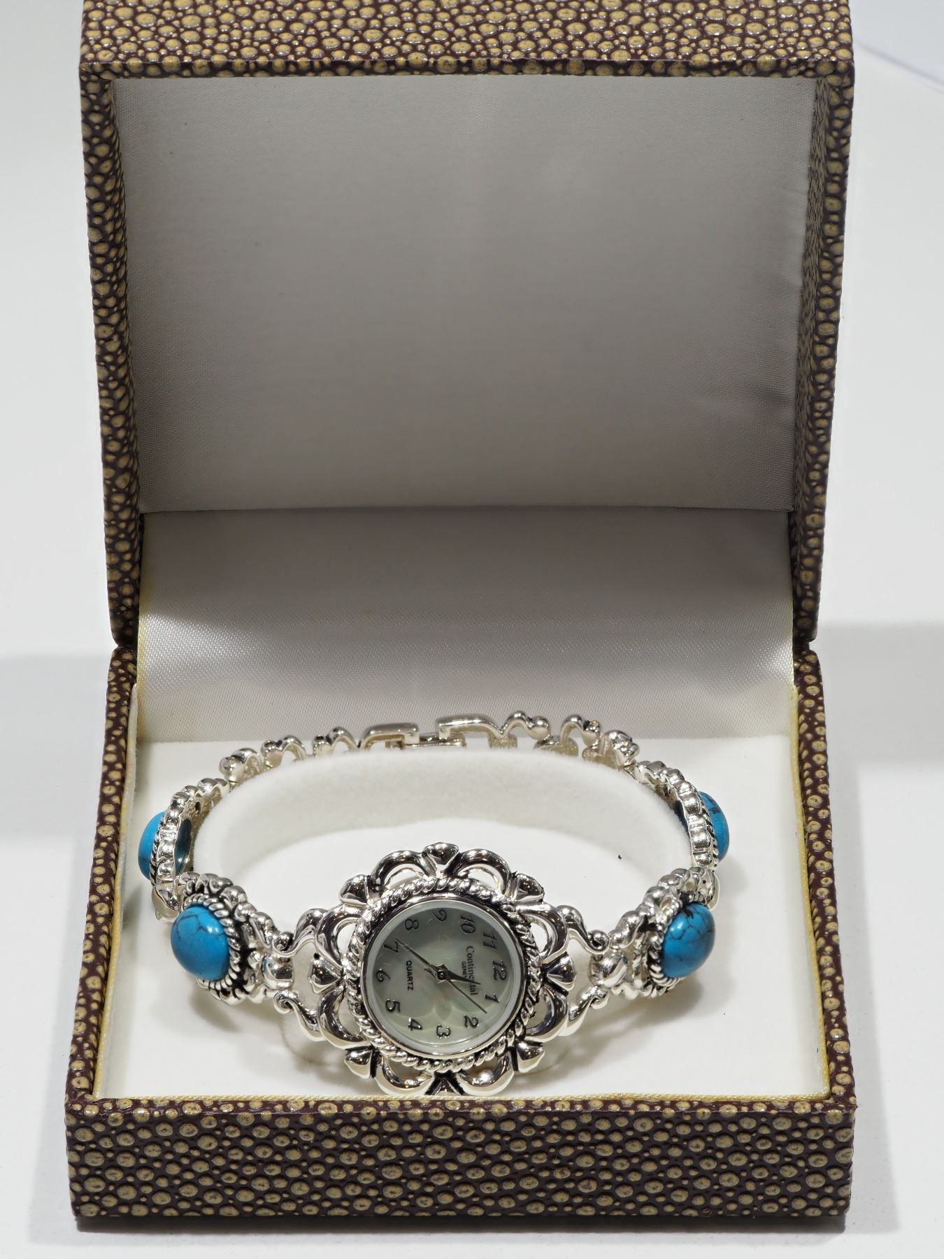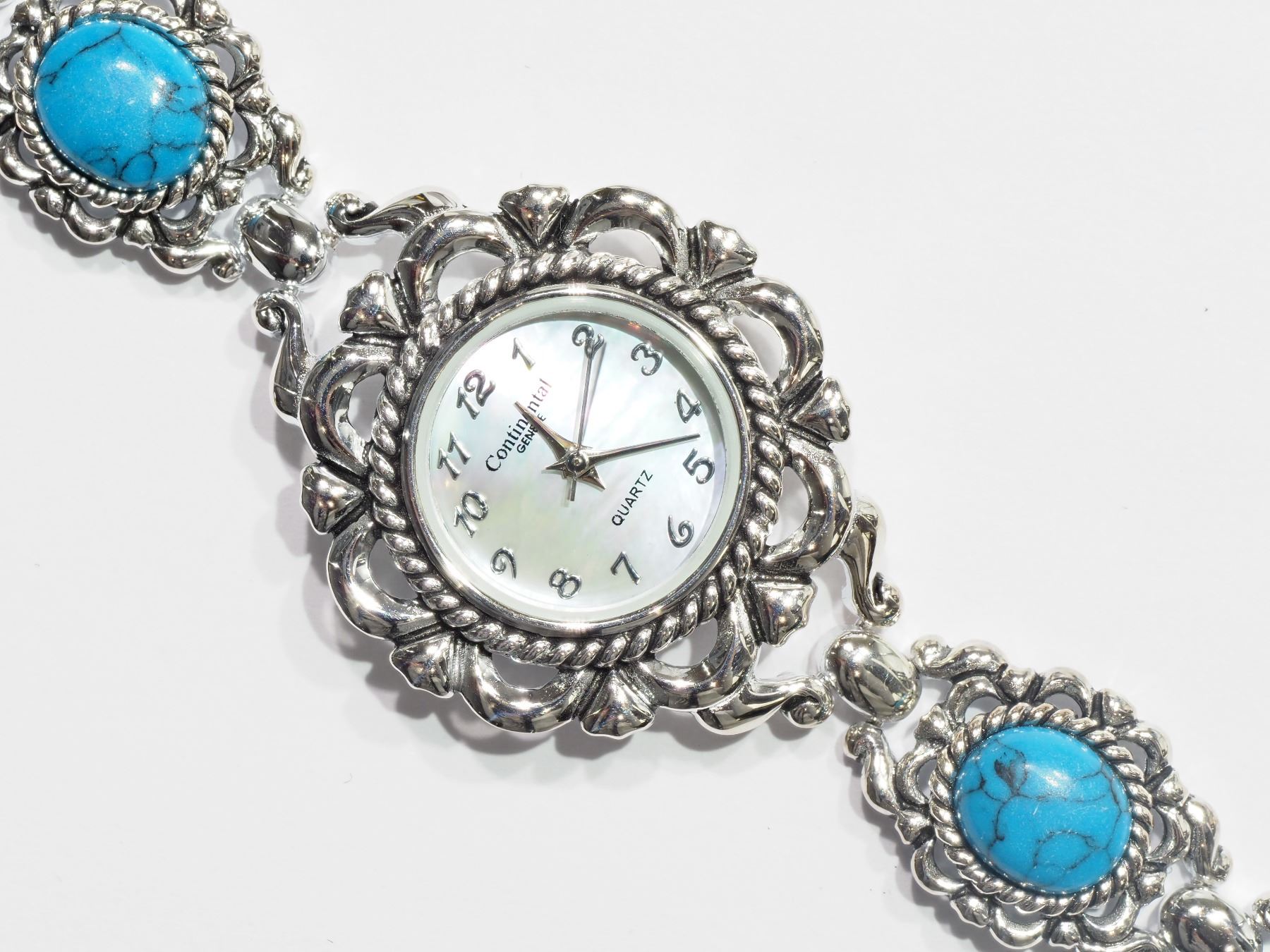 CONTINENTAL STERLING SILVER TURQUOISE MOTHER OF PEARL DIAL ANTIQUE STYLE WATCH