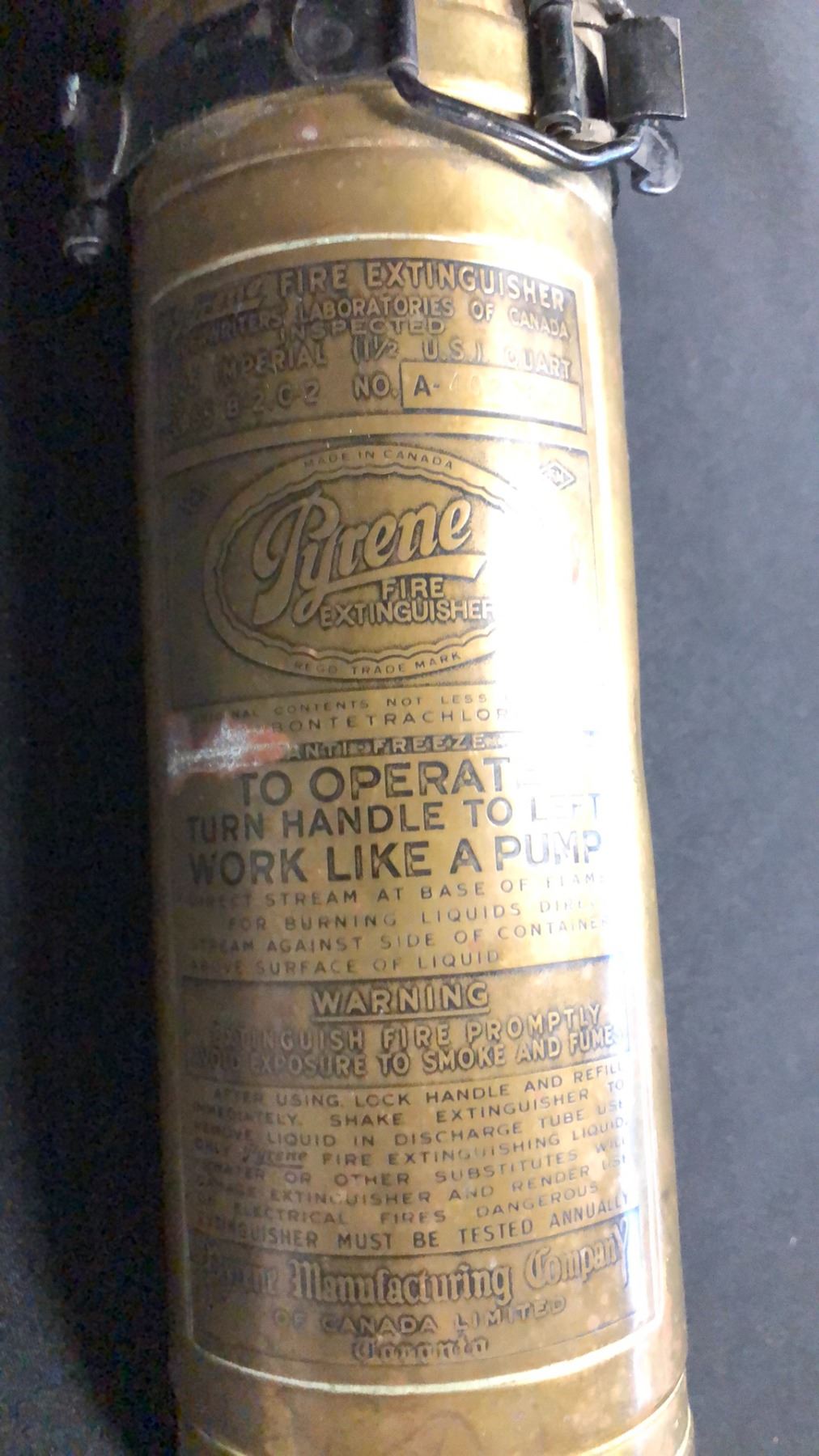 COPPER/BRASS PYRENE 1 1/2 US GAL FIRE EXTINGUISHER 17" H