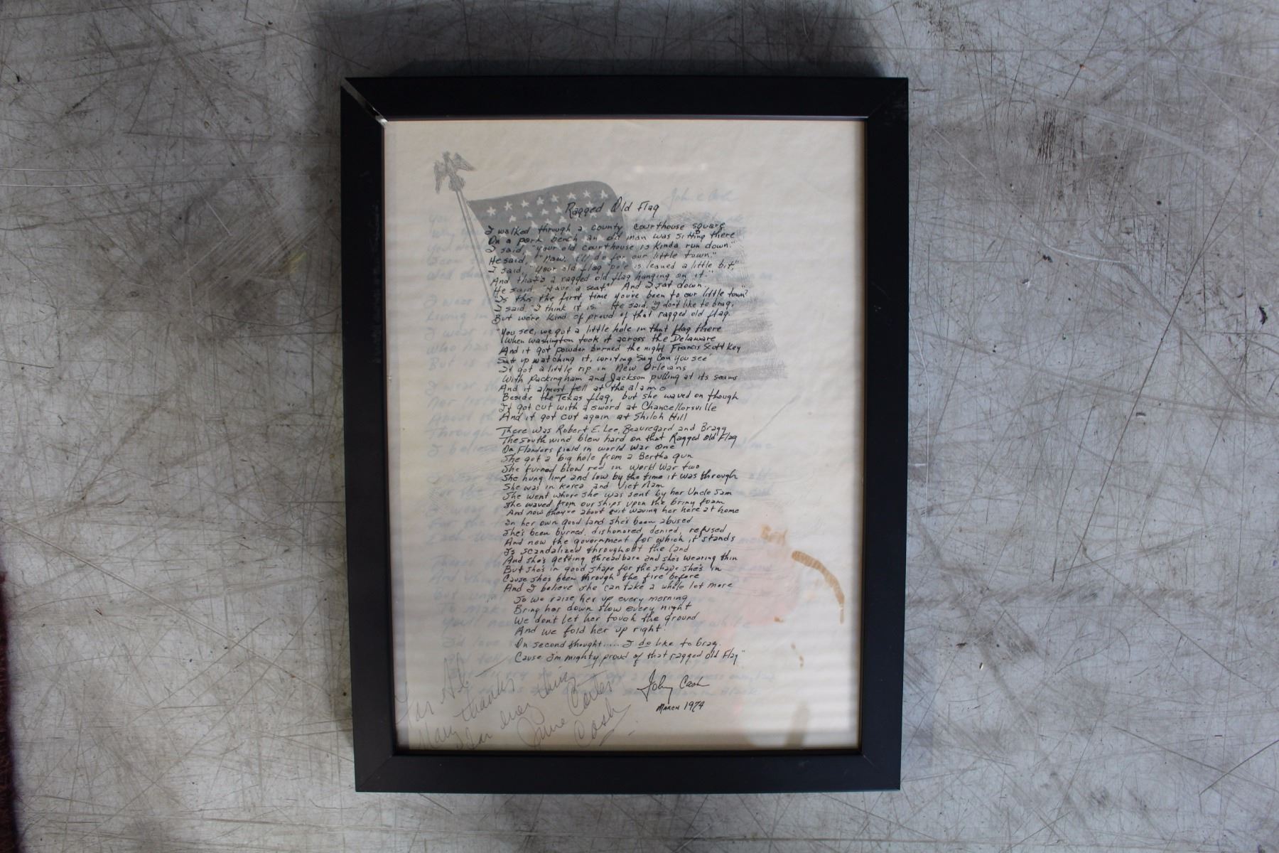COPY OF HANDWRITTEN LYRICS TO RAGGED OLD FLAG WRITTEN IN MARCH 1974, SONG WAS RECORDED IN APRIL 1974. PERSONALIZED SIGNATURE FROM JUNE CARTER CASH