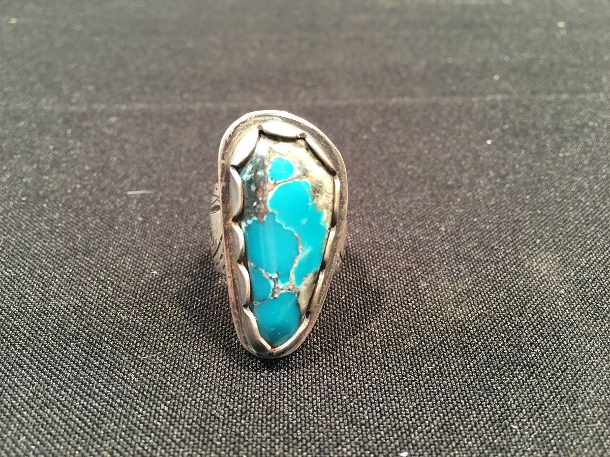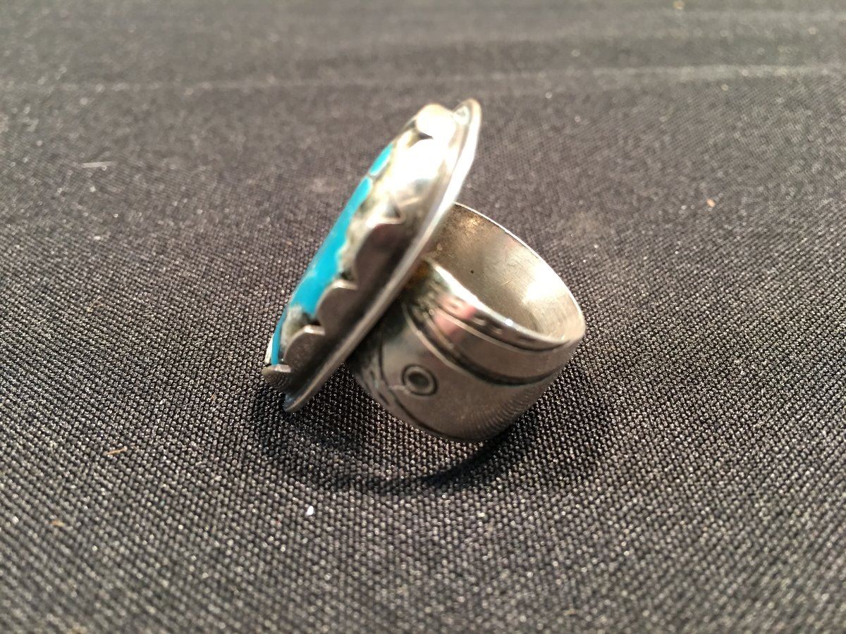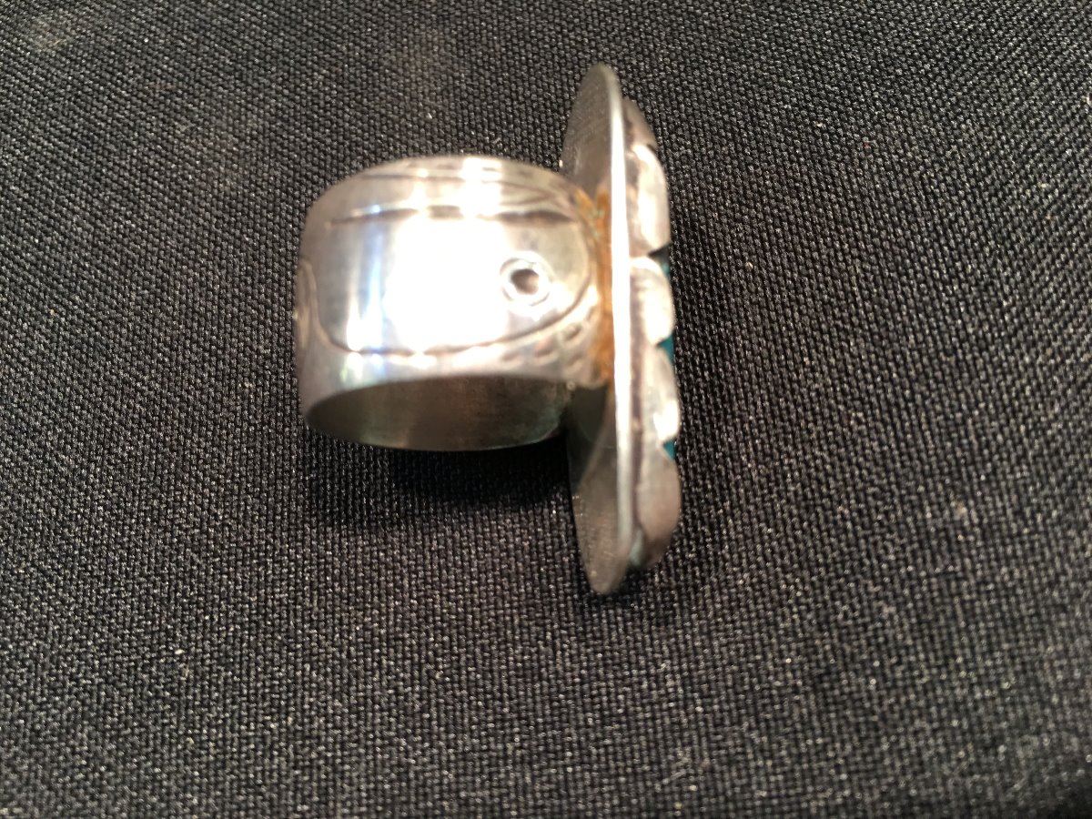 COREY LAROCQUE, 'SPLIT RAVEN' HAIDA DESIGN RING WITH MORENCI TURQUOISE CUSTOM CUT BEZEL, WITH SPLIT RAVEN HAIDA MOTIF ON BACK (APPROX. 12 KT OF MORENCI TURQUOISE)