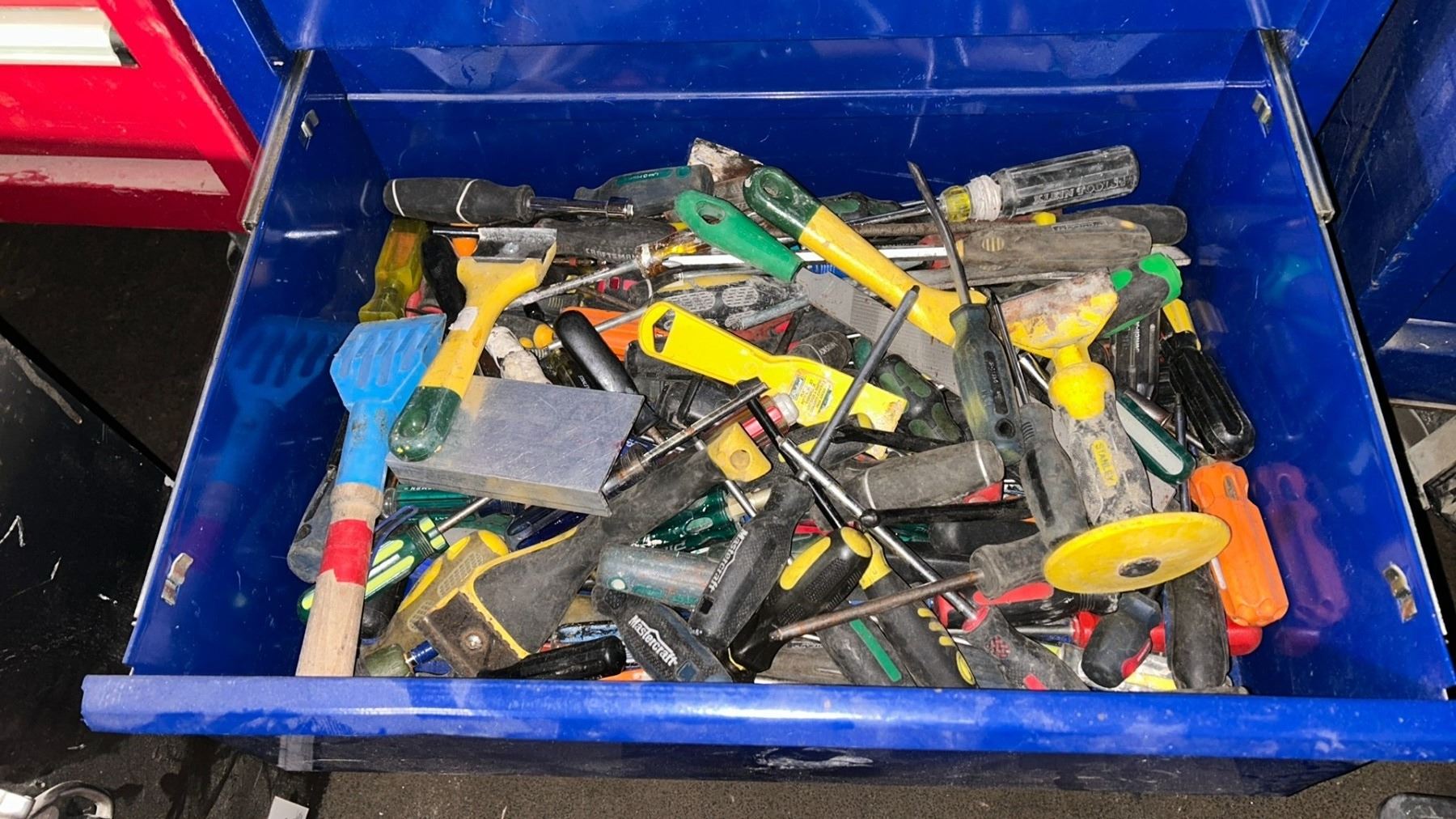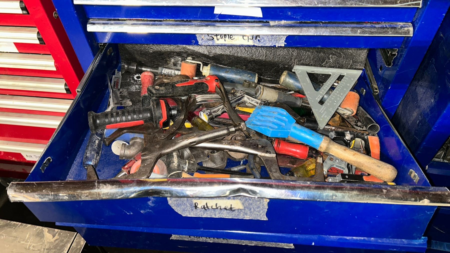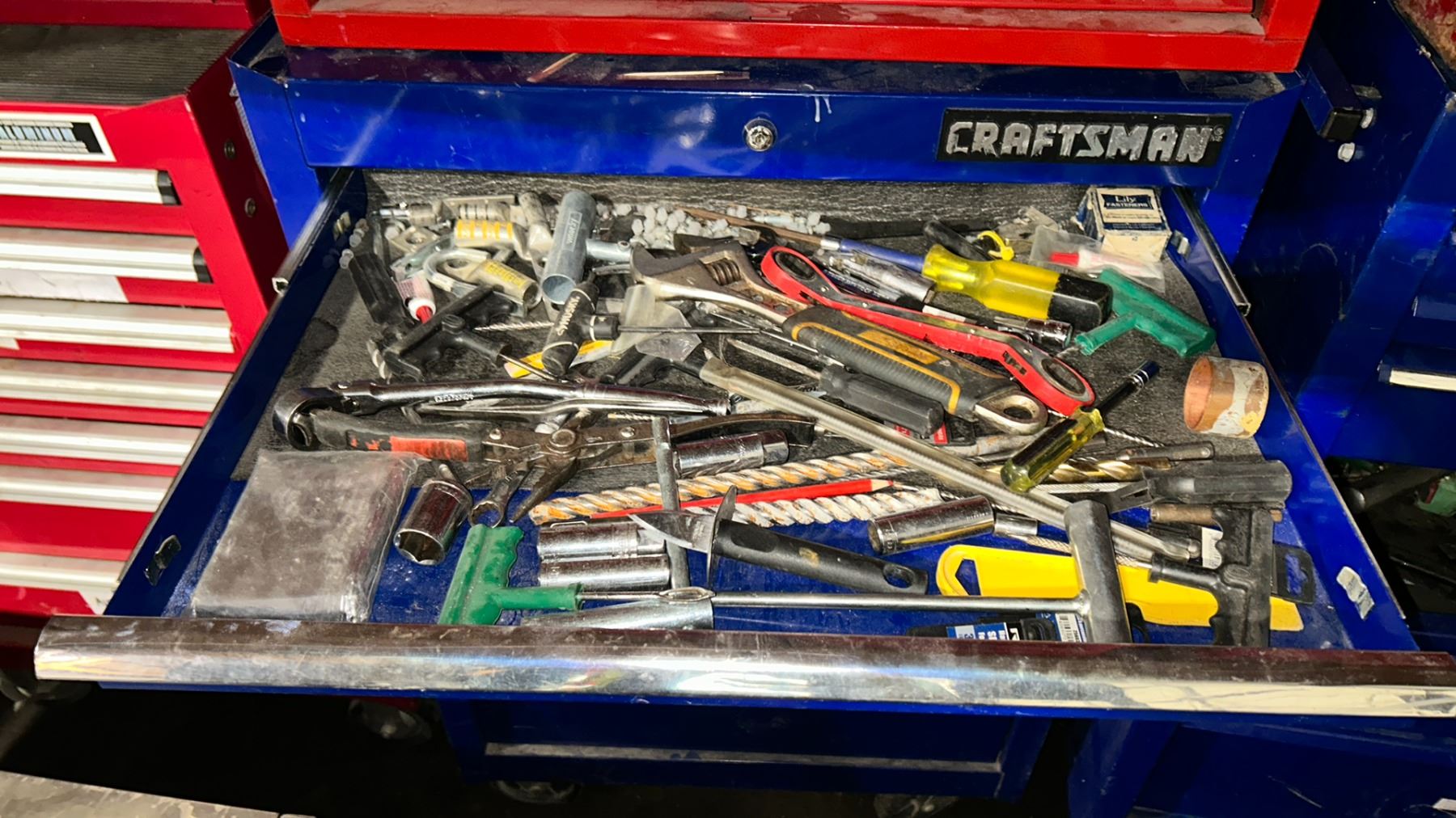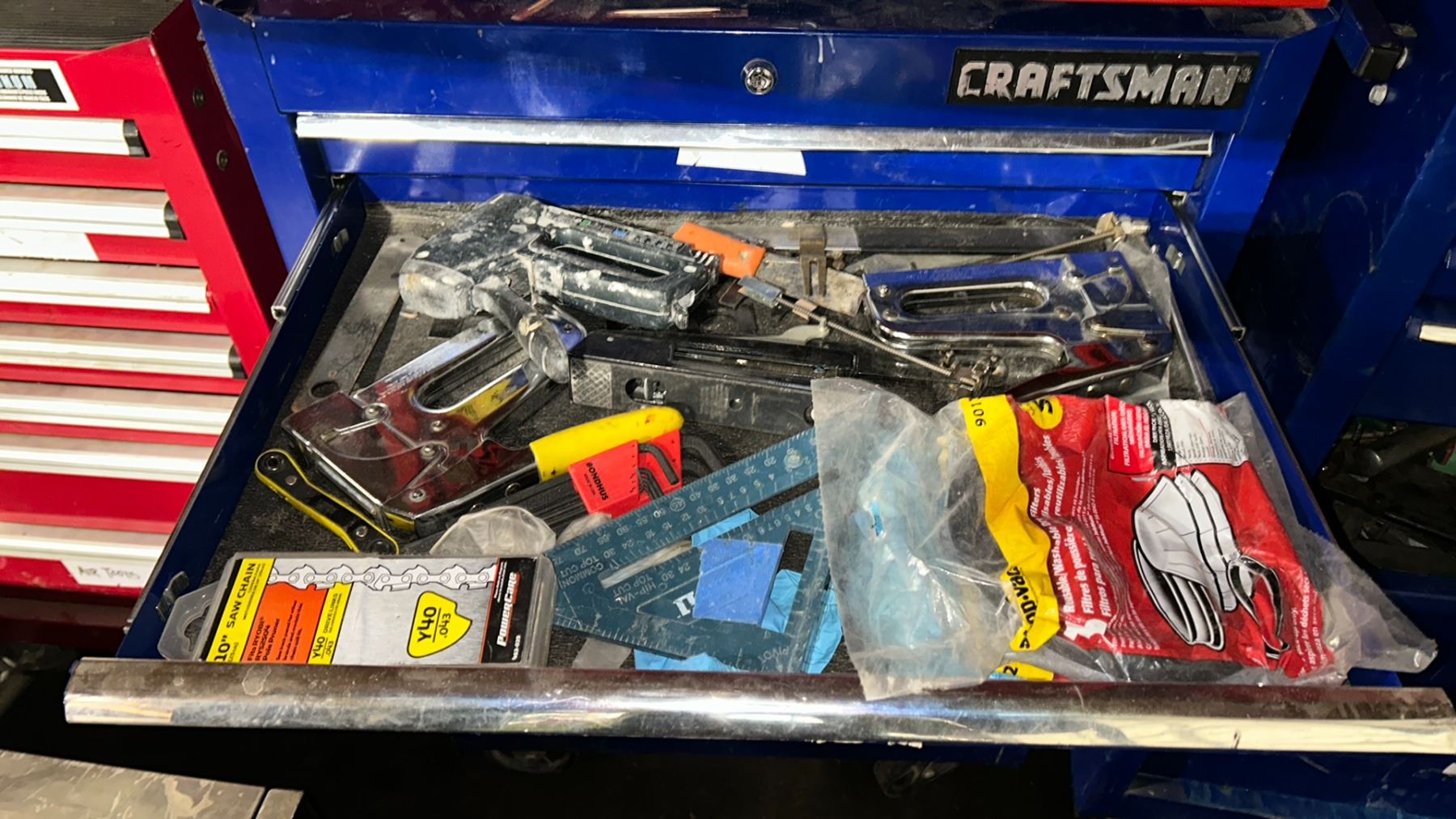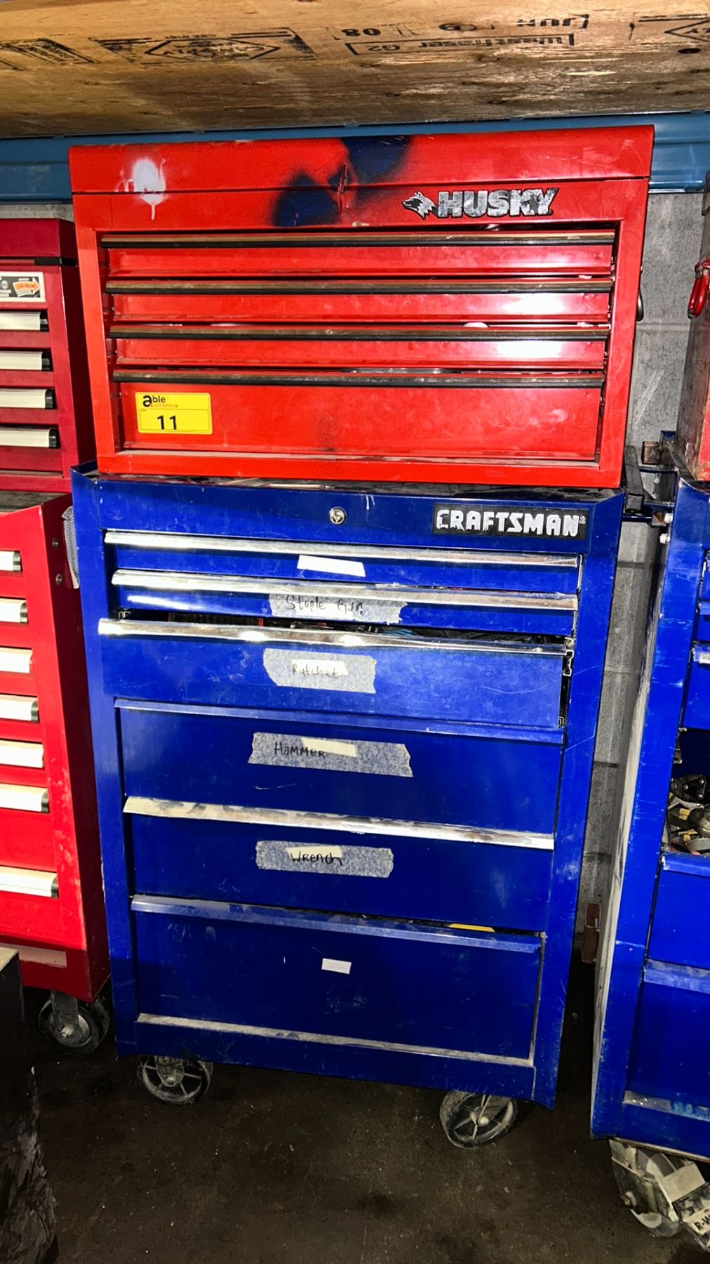 CRAFTSMAN BLUE MOBILE INDUSTRIAL 6 DRAWER TOOL BOX (27"W X 18"D X 43"H) & HUSKY RED 4 DRAWER INDUSTRIAL TOOL BOX (26.5"W X 12.5"D X 15"H) *CONTENTS INCLUDED*