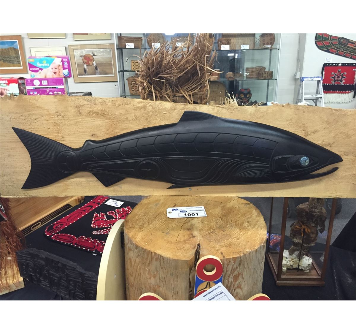 CRAIG VOISIN, SALMON CARVING WITH ABALONE INLAY 47" L X 11" H