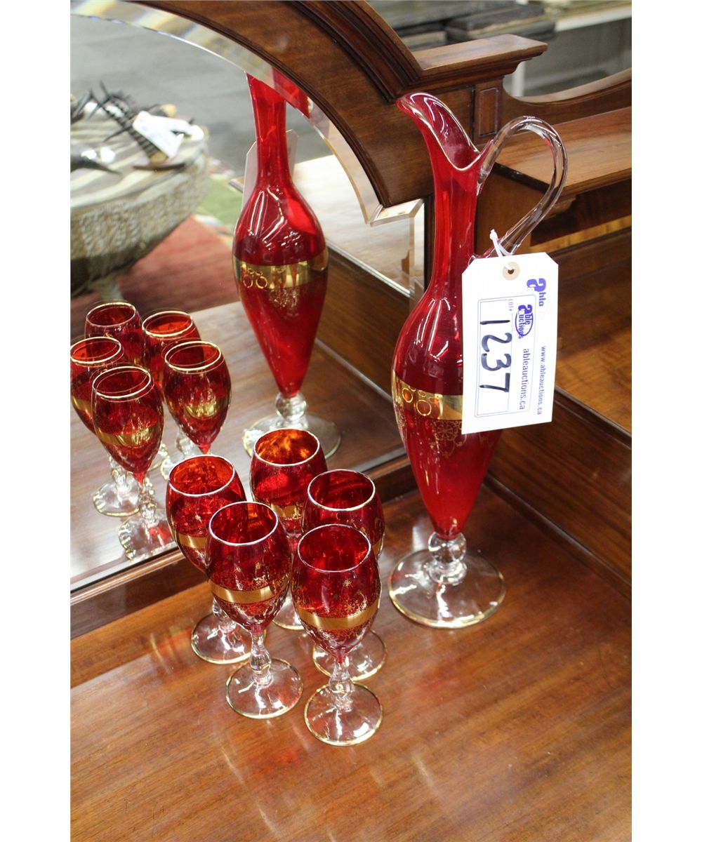 CRANBERRY BOHEMIAN GLASS PITCHER, WITH GOLD ACCENT AND 5 GLASSES