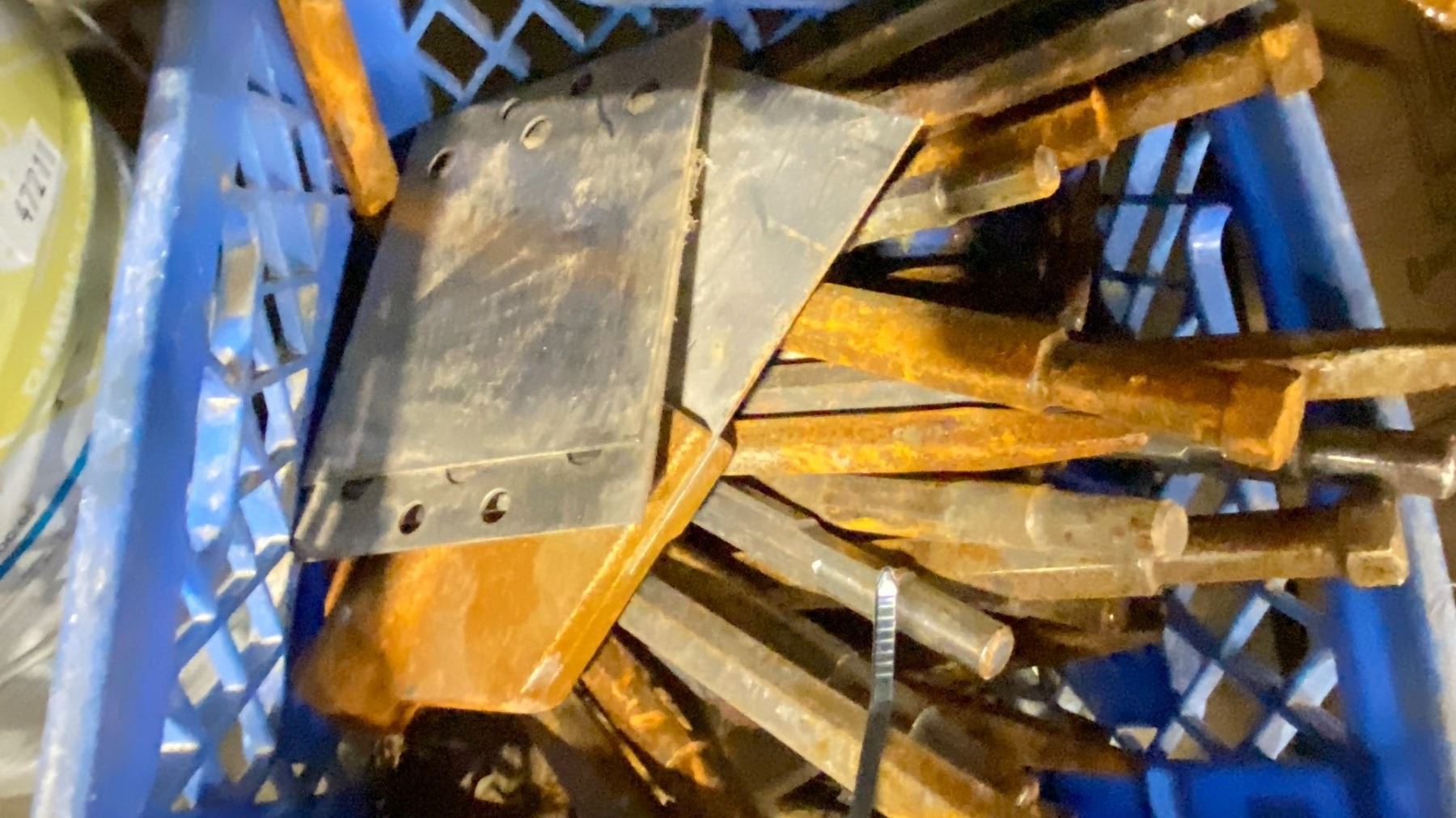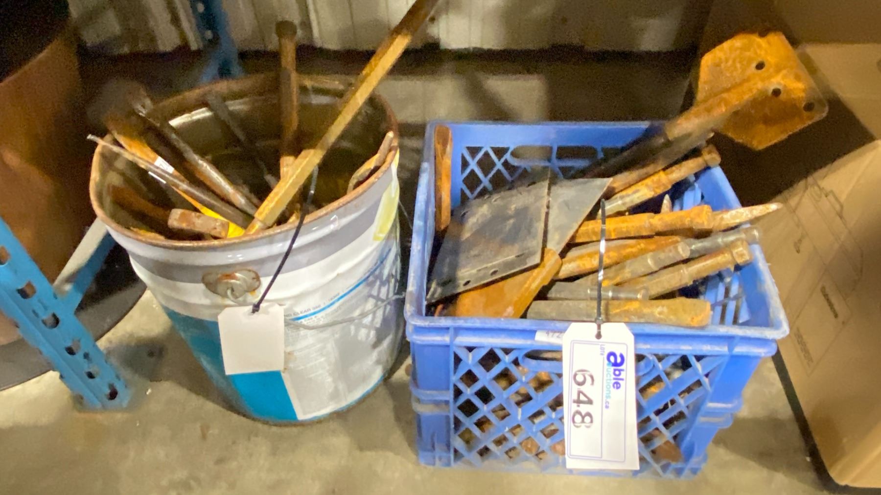 CRATE AND BUCKET OF ASSORTED INDUSTRIAL CHISEL ATTACHMENTS