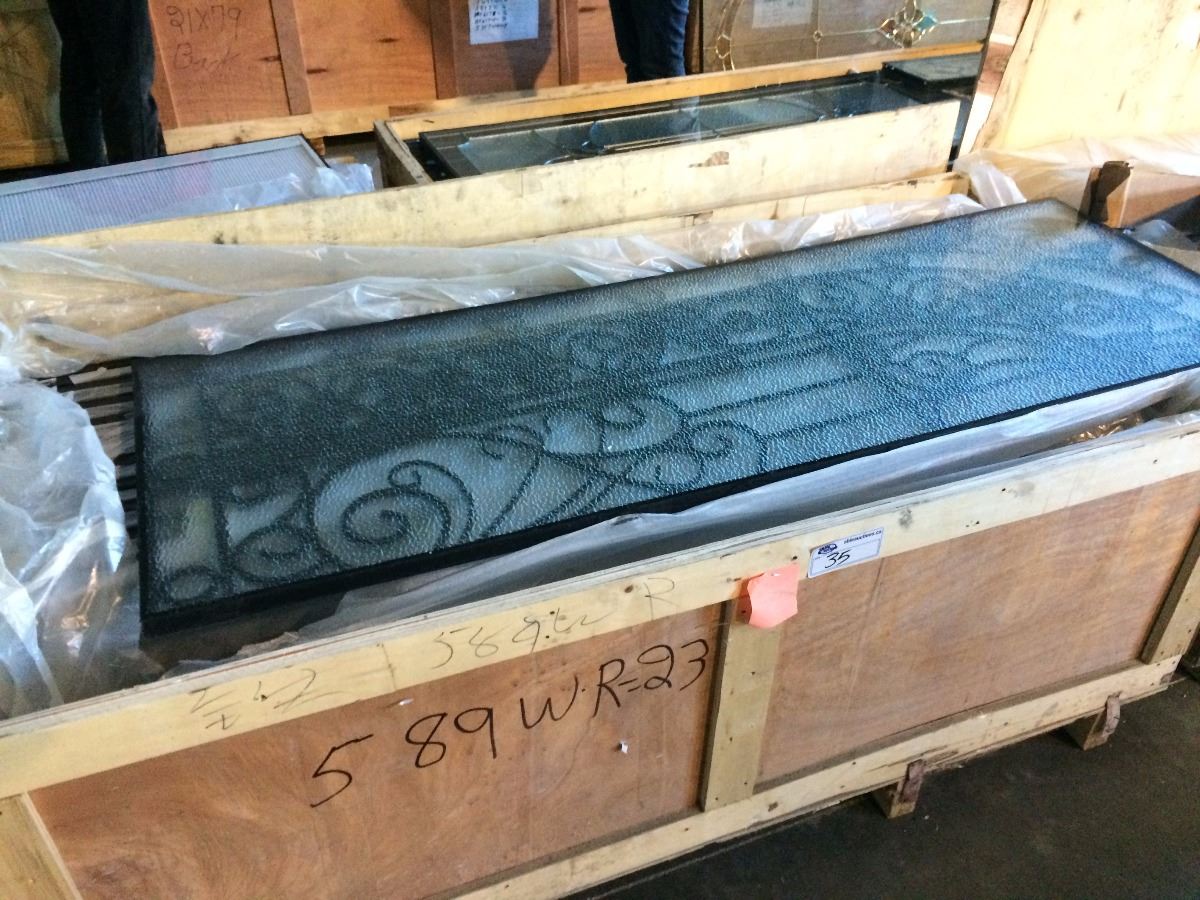 CRATE OF 64"X22" FROSTED GLASS IRON INLAY WINDOWS