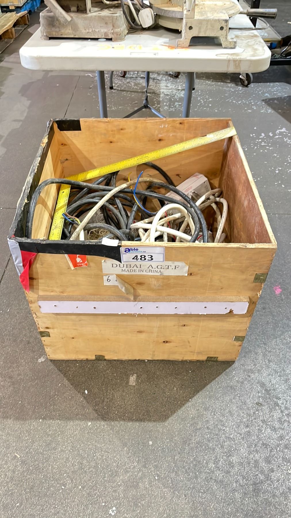 CRATE OF ASSORTED ITEMS INCLUDING; POWER CABLES, SQUARE, STRING LENGTHS & MORE