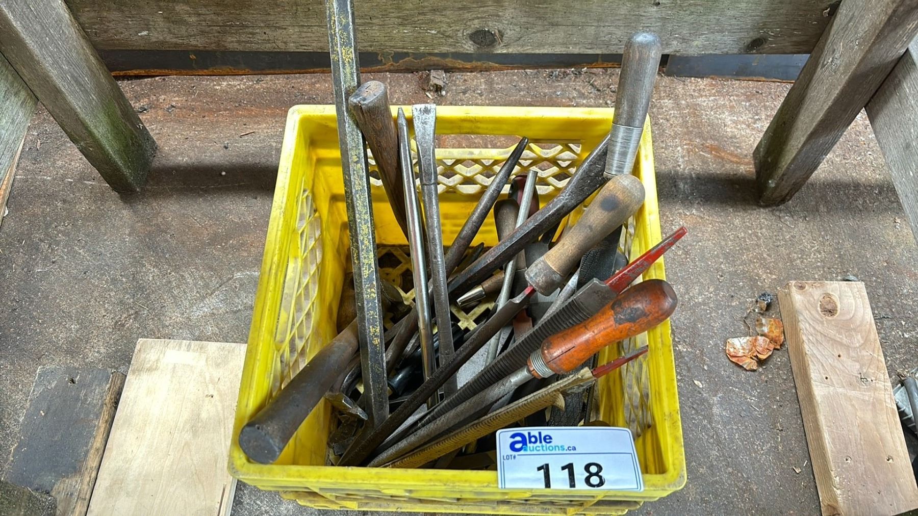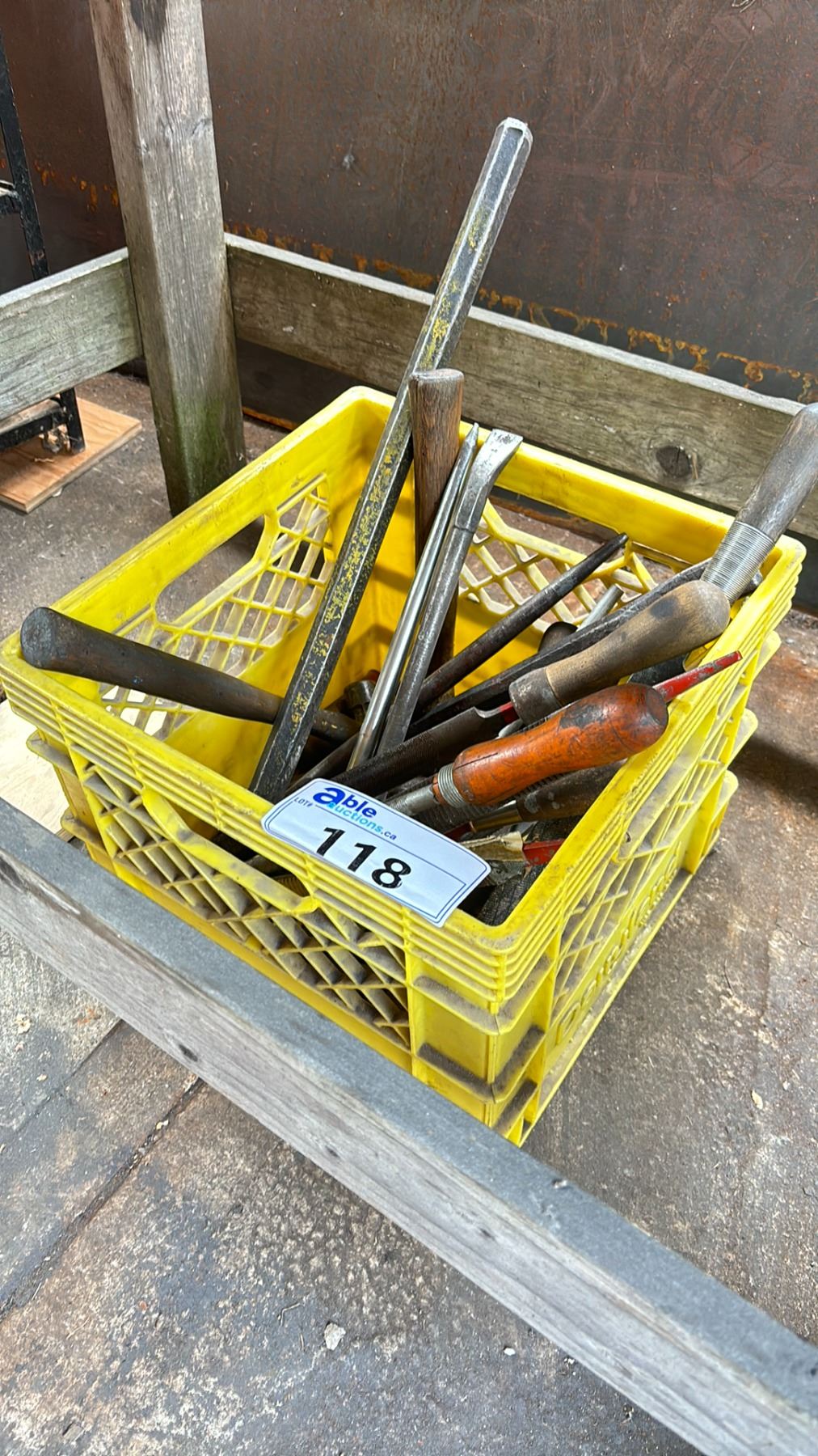 CRATE OF ASSORTED METAL FILES, PRY BARS & HAMMERS
