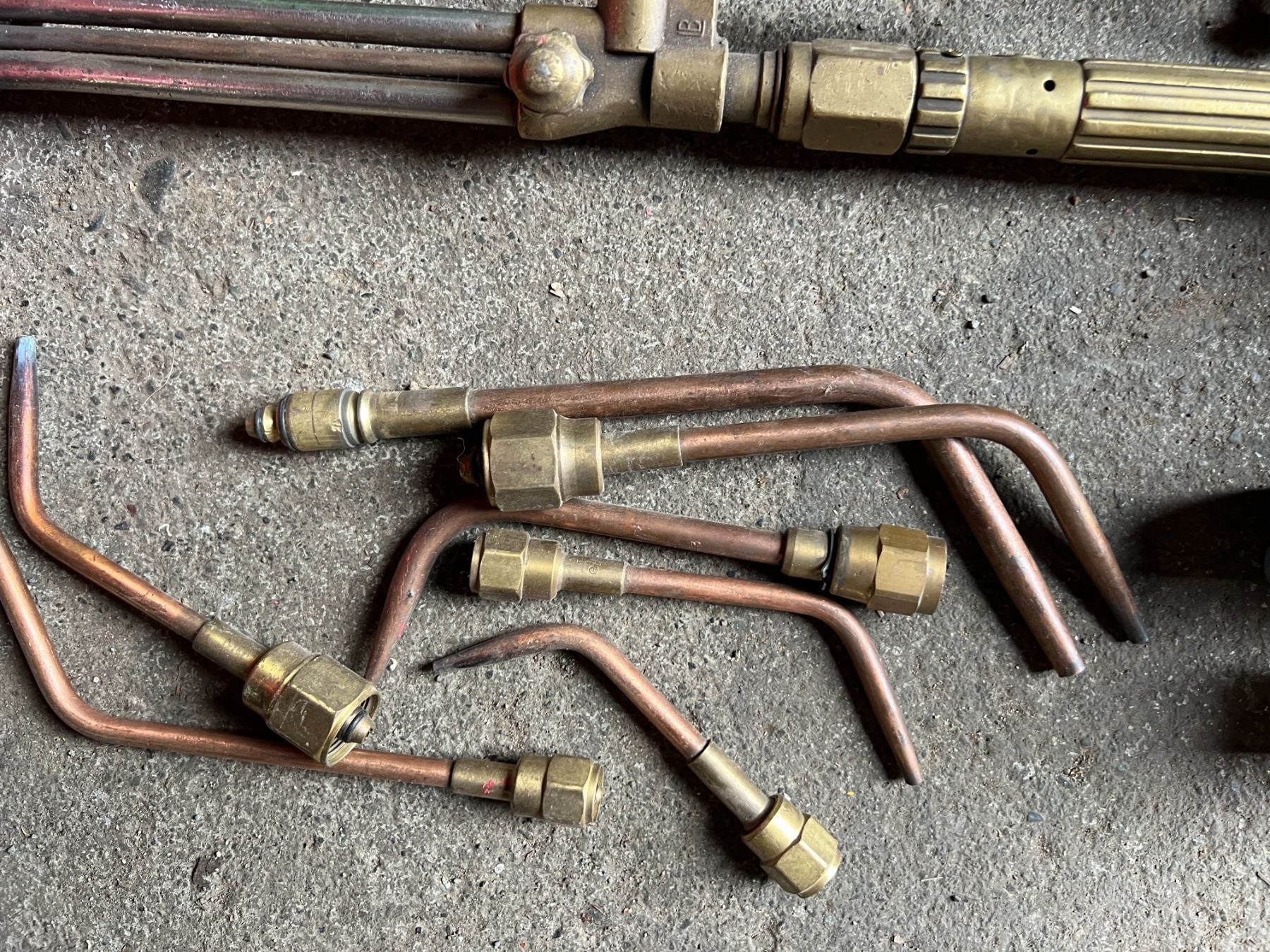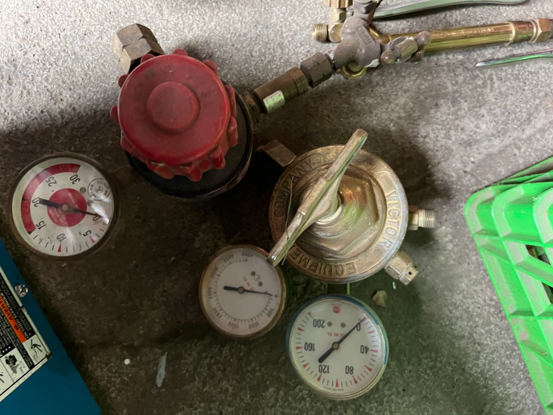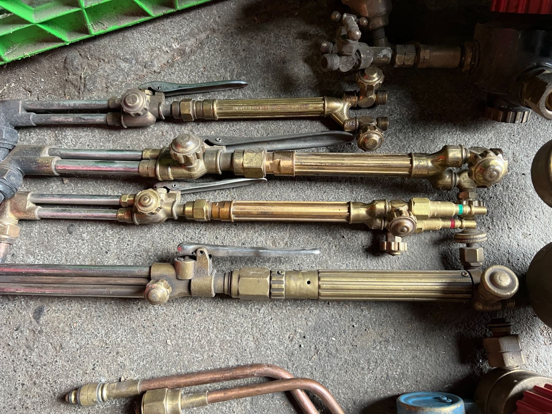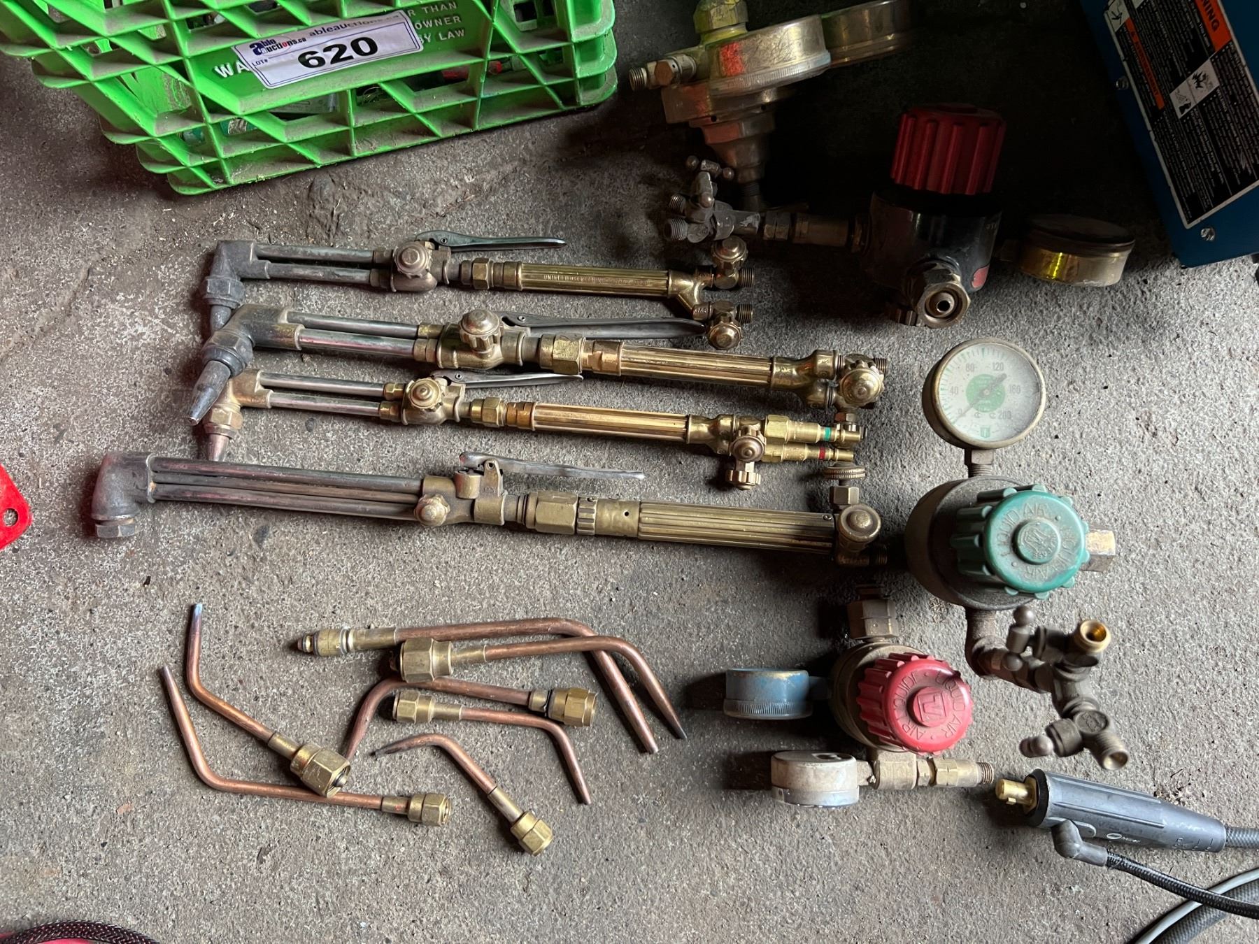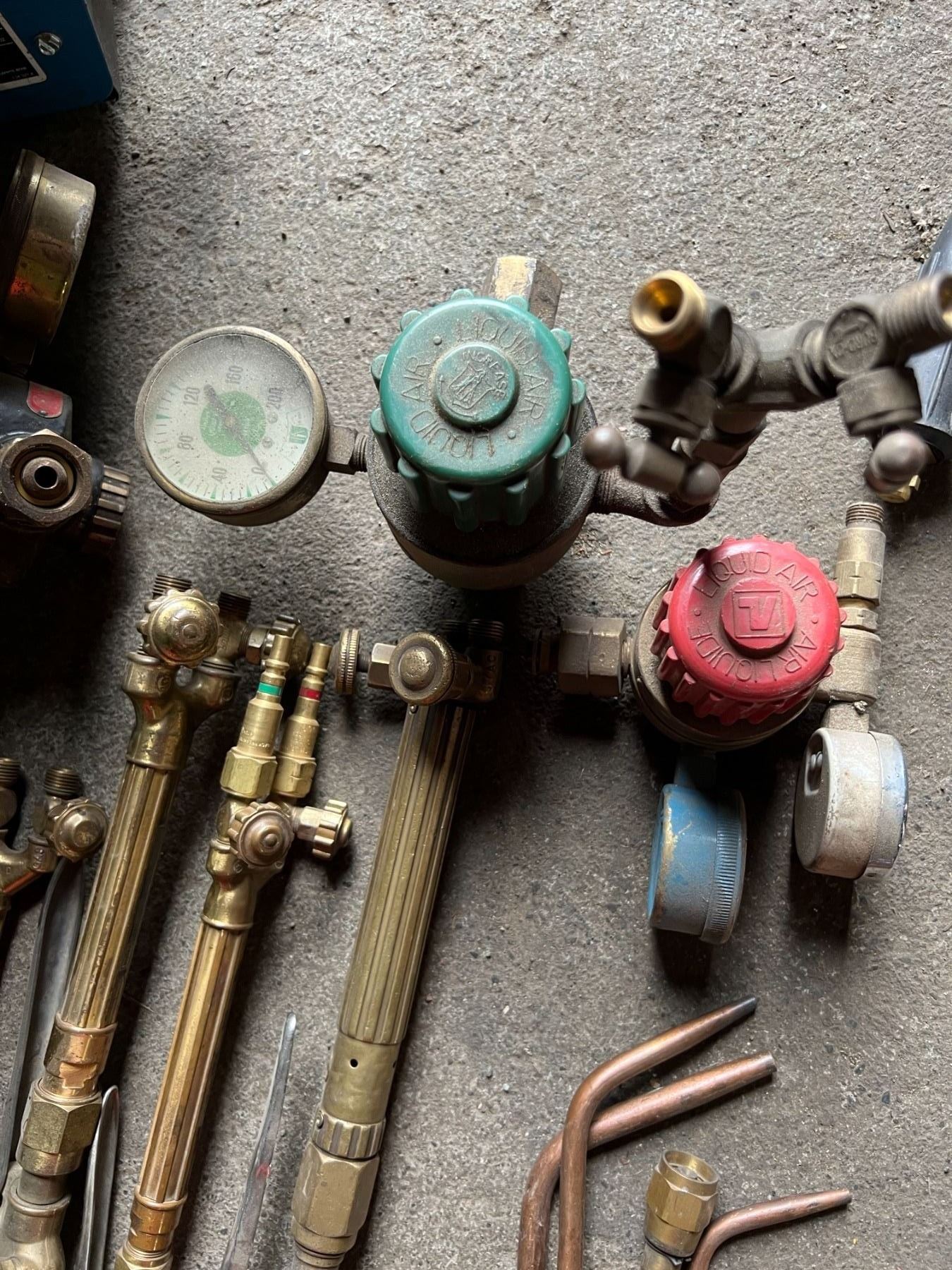 CRATE OF GAS TORCH ACCESSORIES. 4 TORCHES- UNIWELD, VICTOR, 6 BRAISING TIPS, 4 REGULATORS