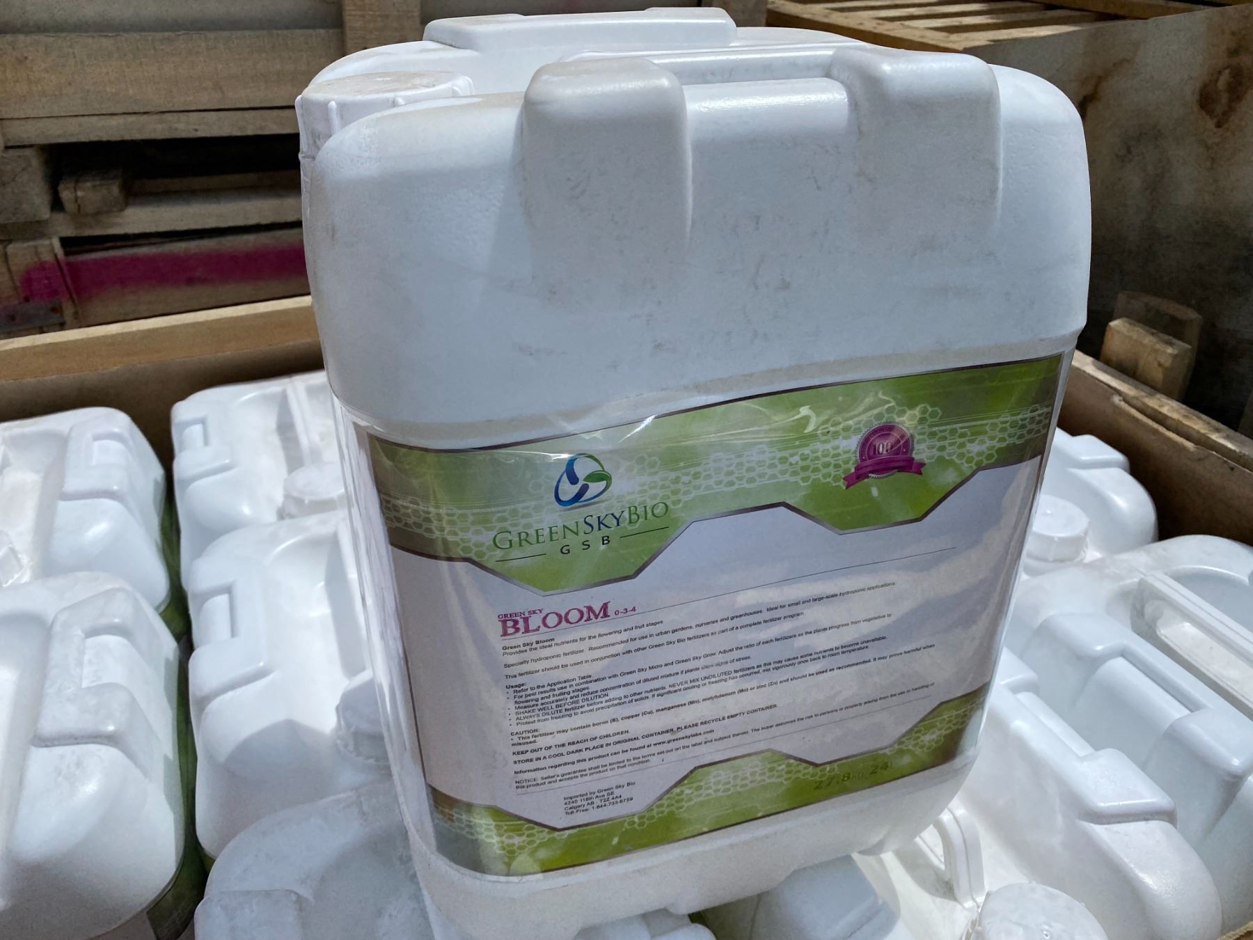 CRATE OF GREEN SKY BIO 'BLOOM' FERTILIZER, 24 X 24 LITRE JUGS, TOTAL OF 576 LITRES 'BLOOM' PROVIDES PHOSPHORUS AND POTASSIUM PLANTS NEED TO BRING ON FLOWERING WHEN YOU'RE READY FOR FLOWERS, THIS SYSTEM ADJUSTS THE MIX, ADDING MORE BLOOM TO MAKE YOUR PLANTS FLOURISH