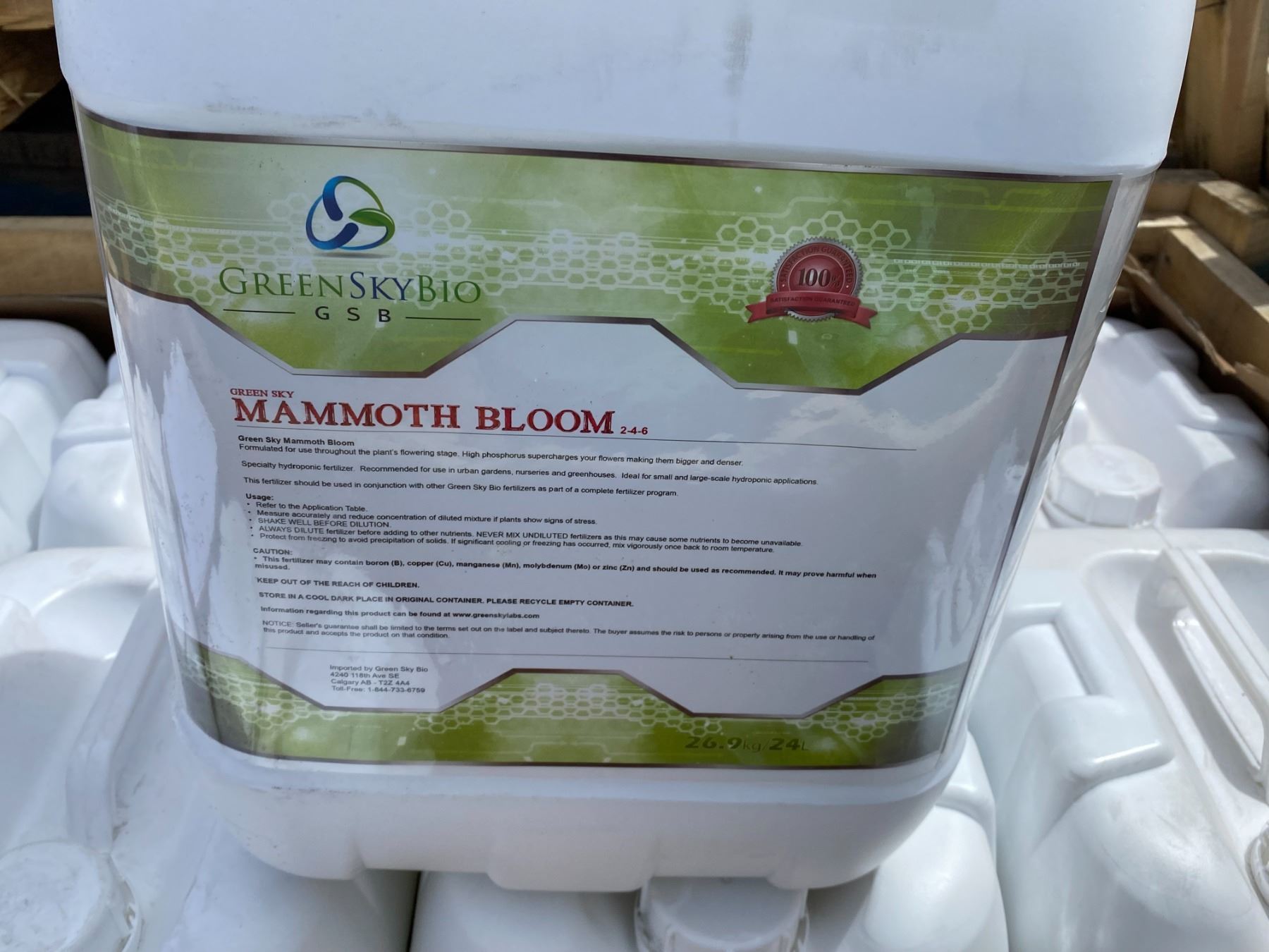 CRATE OF GREEN SKY BIO 'MAMMOTH BLOOM' FERTILIZER, 24 X 24 LITRE JUGS, TOTAL OF 576 LITRES SUPER CHARGE YOUR FLOWERS WITH 'MAMMOTH BLOOM'. HIGH PHOSPHORUS AND POTASSIUM ARE THE SPECIAL INGREDIENTS THAT PLANTS NEED TO PROMOTE BUD FORMATION AND FLOWERING
