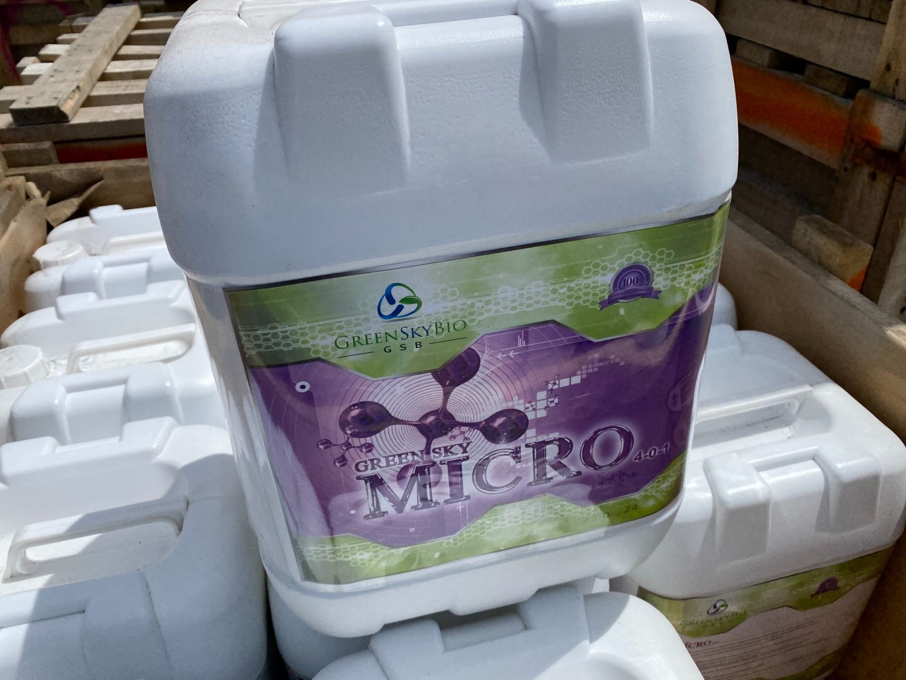 CRATE OF GREEN SKY BIO 'MICRO' FERTILIZER, 24 X 24 LITRE JUGS, TOTAL OF 576 LITRES