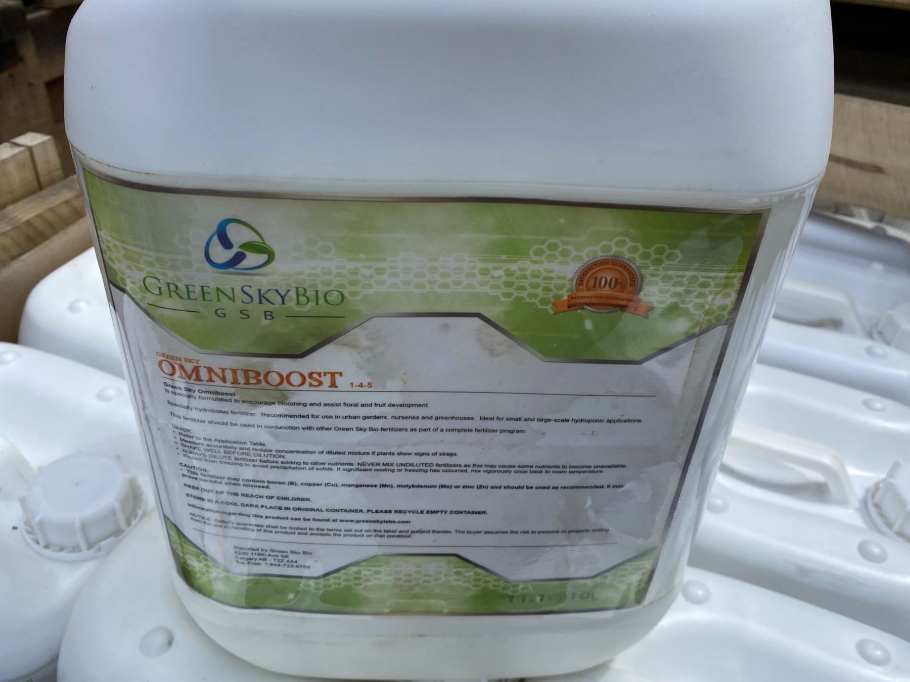 CRATE OF GREEN SKY BIO 'OMNIBOOST' FERTILIZER, 60 X 10 LITRE JUGS, TOTAL OF 600 LITRES. OMNIBOOST IS A MULTI-NUTRIENT FOR PLANTS. 'OMNIBOOST' DELIVERS A SPECIALIZED COMBINATION OF MICRONUTRIENTS THAT SUPPORTS BLOOMING, HEALTHY FRUITS AND BIG FLOWERS.