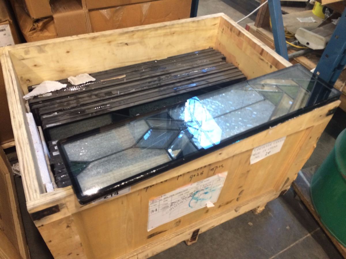 CRATE OF SMALL DECORATIVE INLAY GLASS WINDOWS