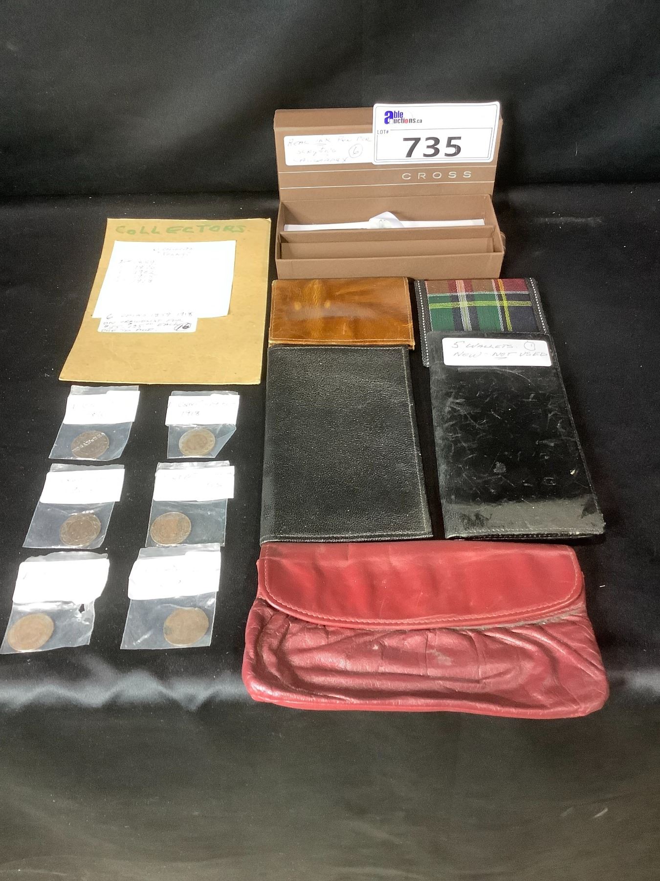 CROSS CALLIGRAPHY PEN, 5 NEW WALLETS, & 5 ASSORTED DATED 1 CENT CANADIAN COINS