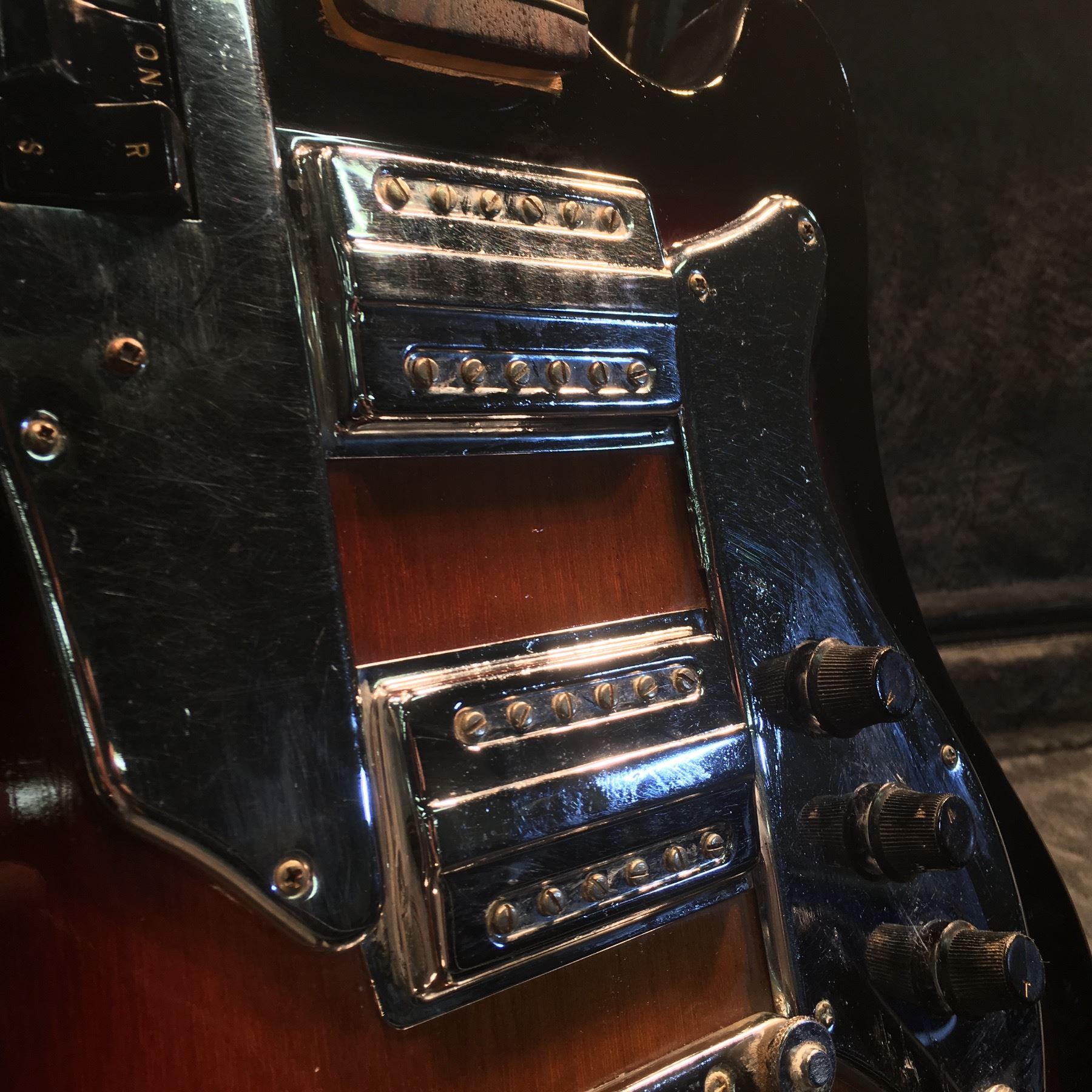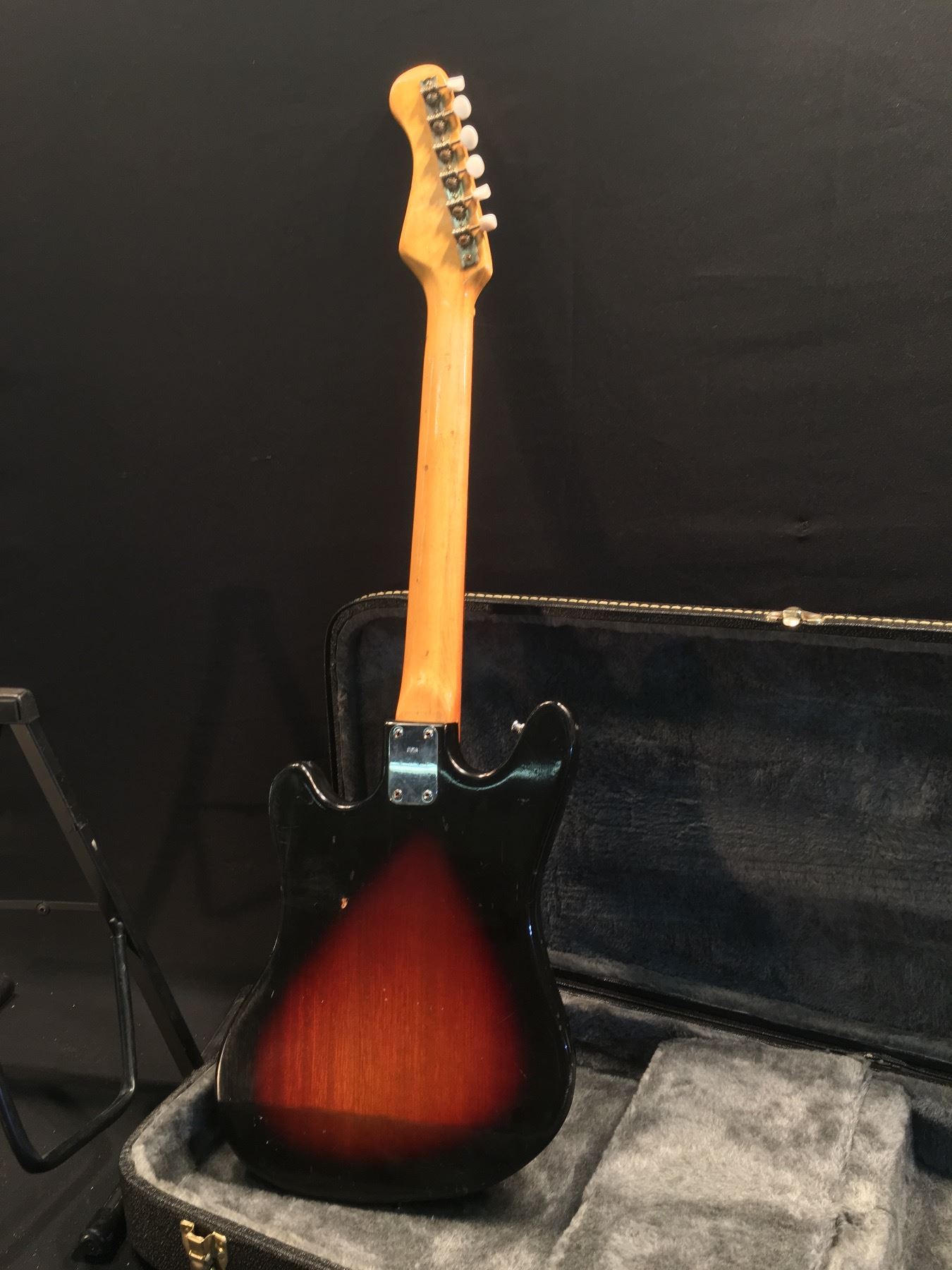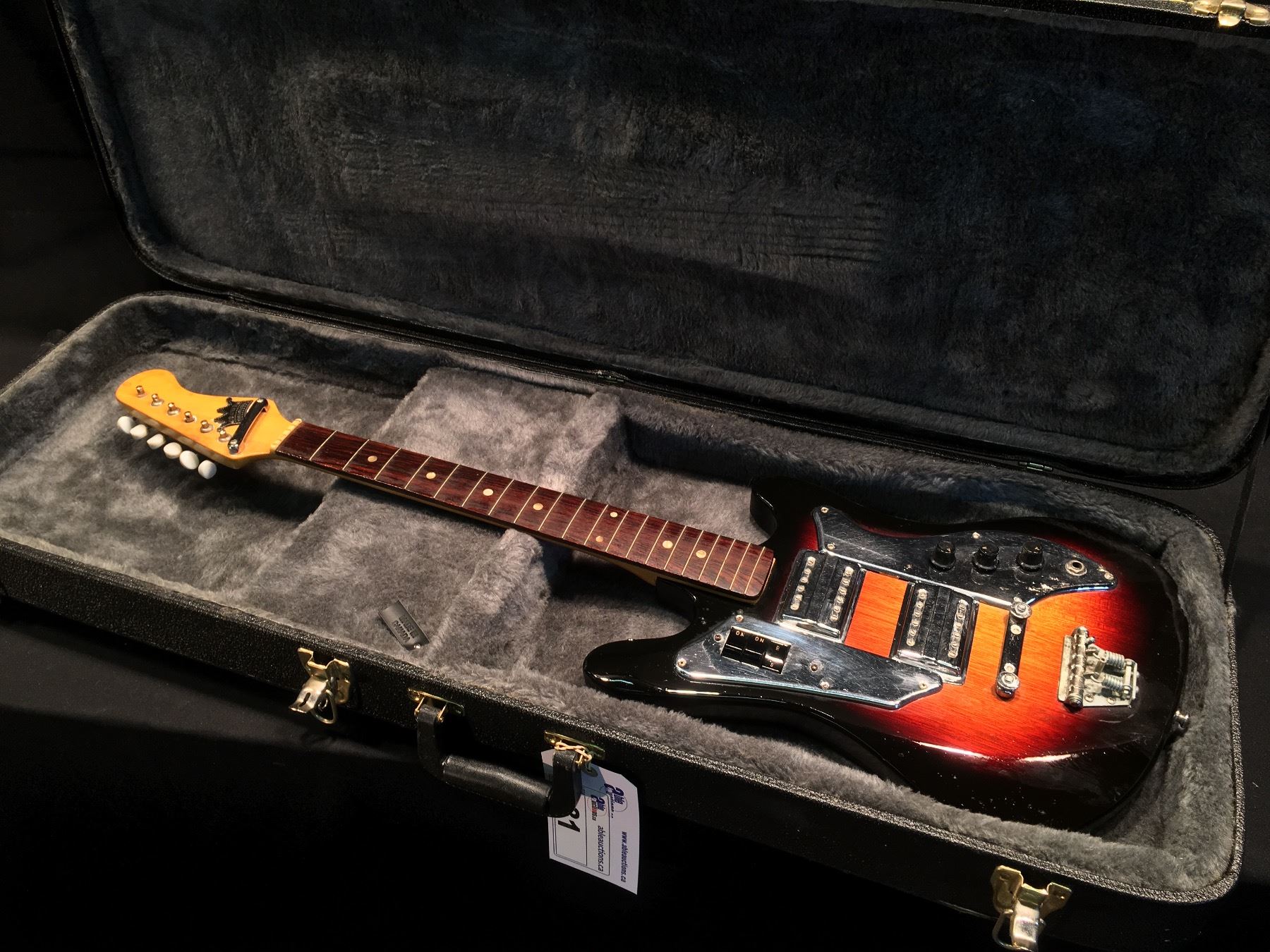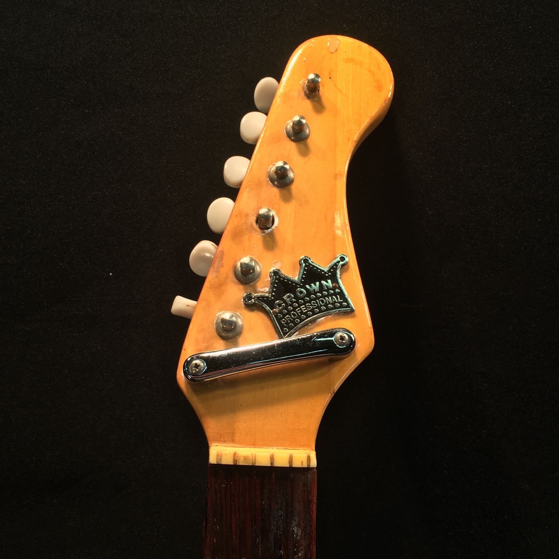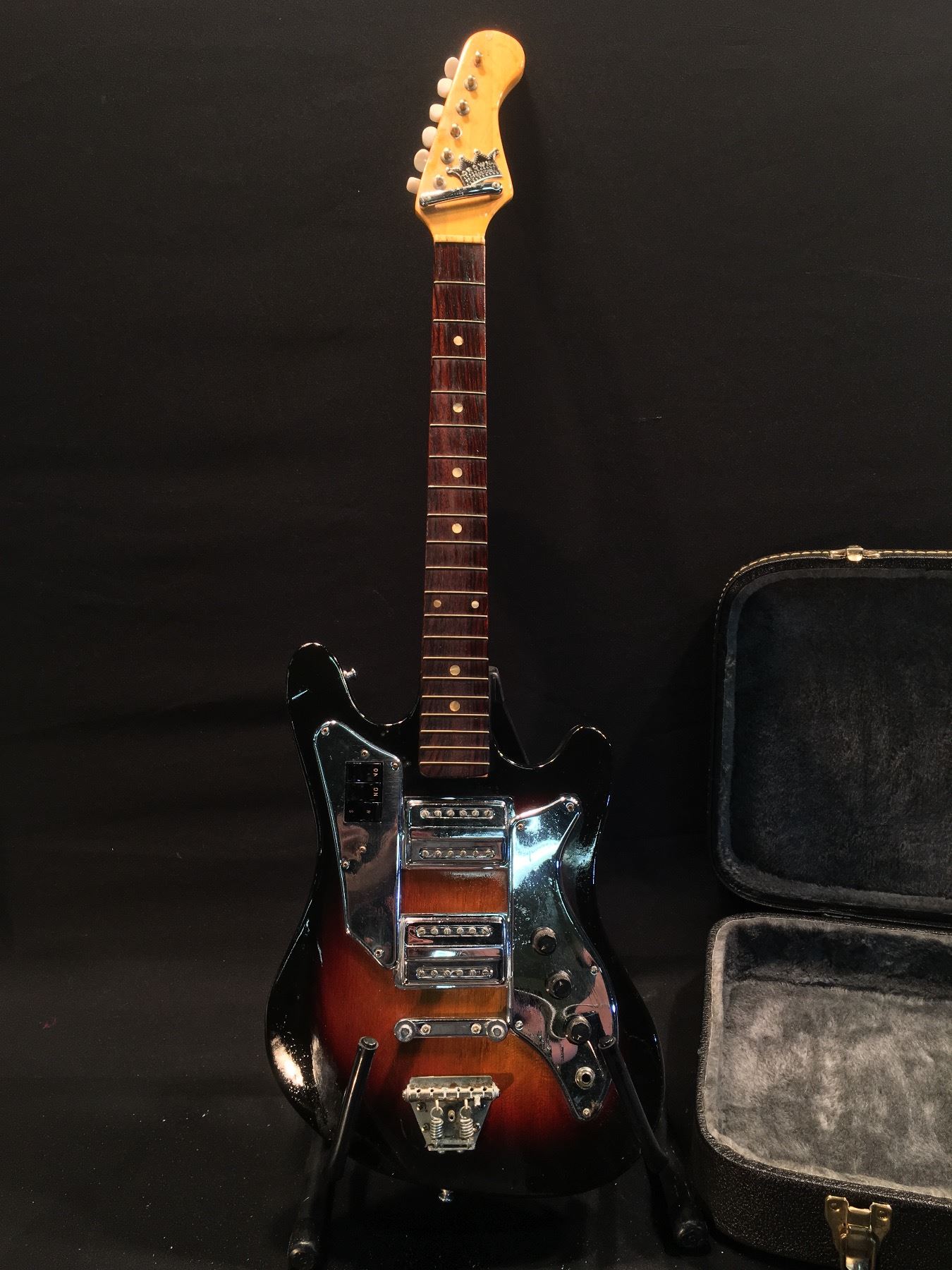 CROWN PROFESSIONAL ELECTRIC GUITAR, MADE IN JAPAN WITH DUAL DEGA STYLE PICKUPS, 2 VOLUME AND 1 TONE KNOB, VIBRATO BRIDGE (MISSING ARM), TWO 'ON' PICKUP SELECTOR SWITCHES AS WELL AS 'S/R' SWITCH, COMES WITH HARD SHELL CASE