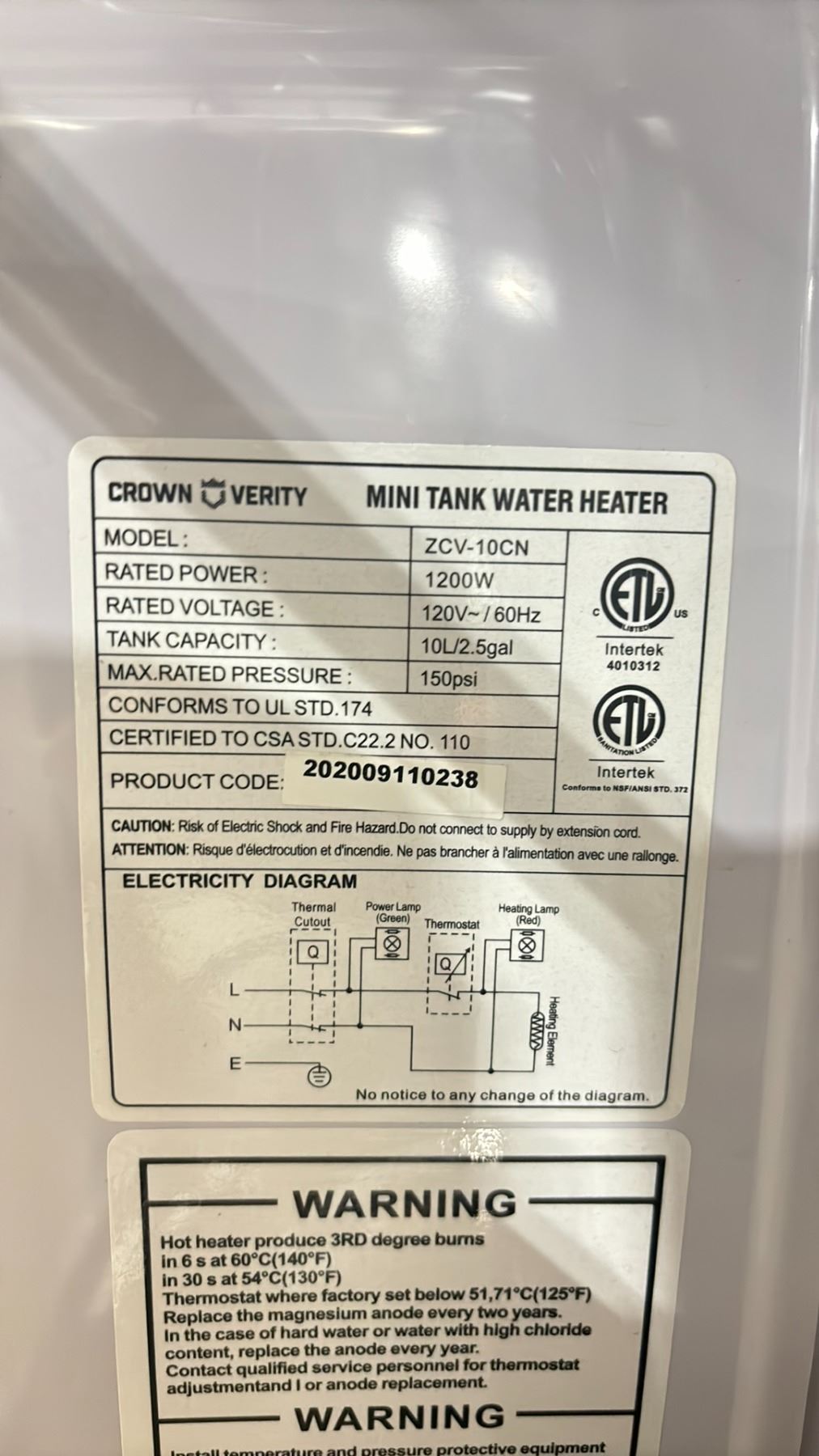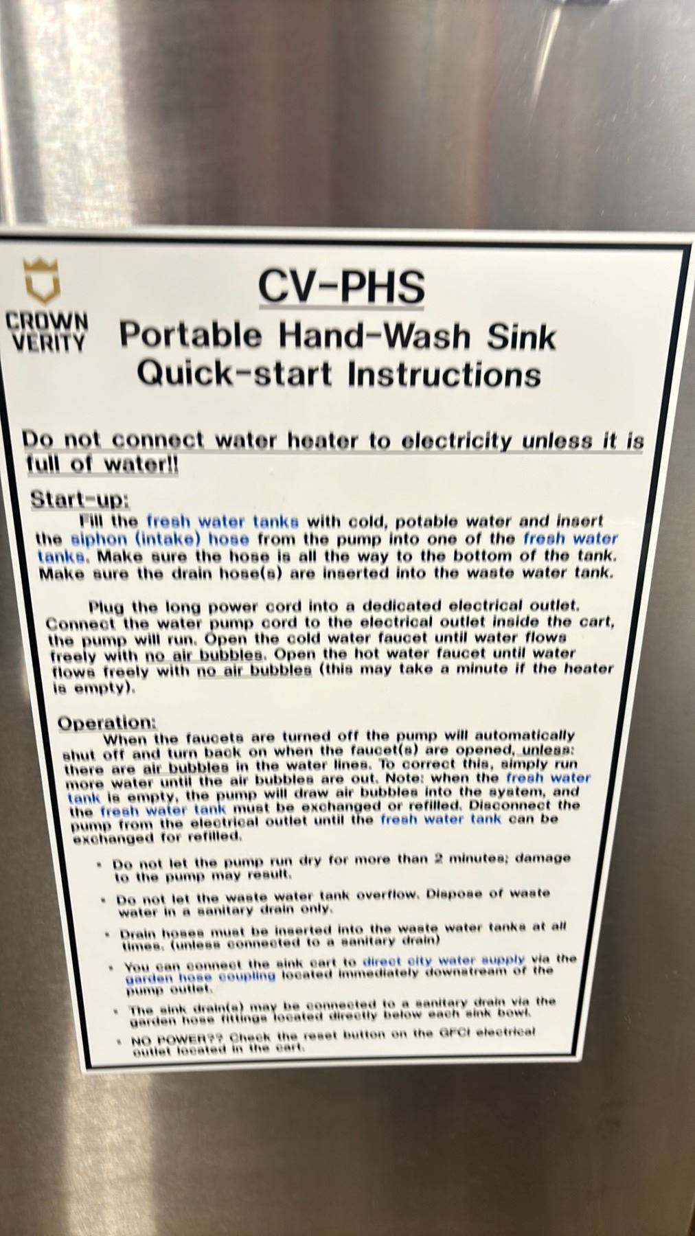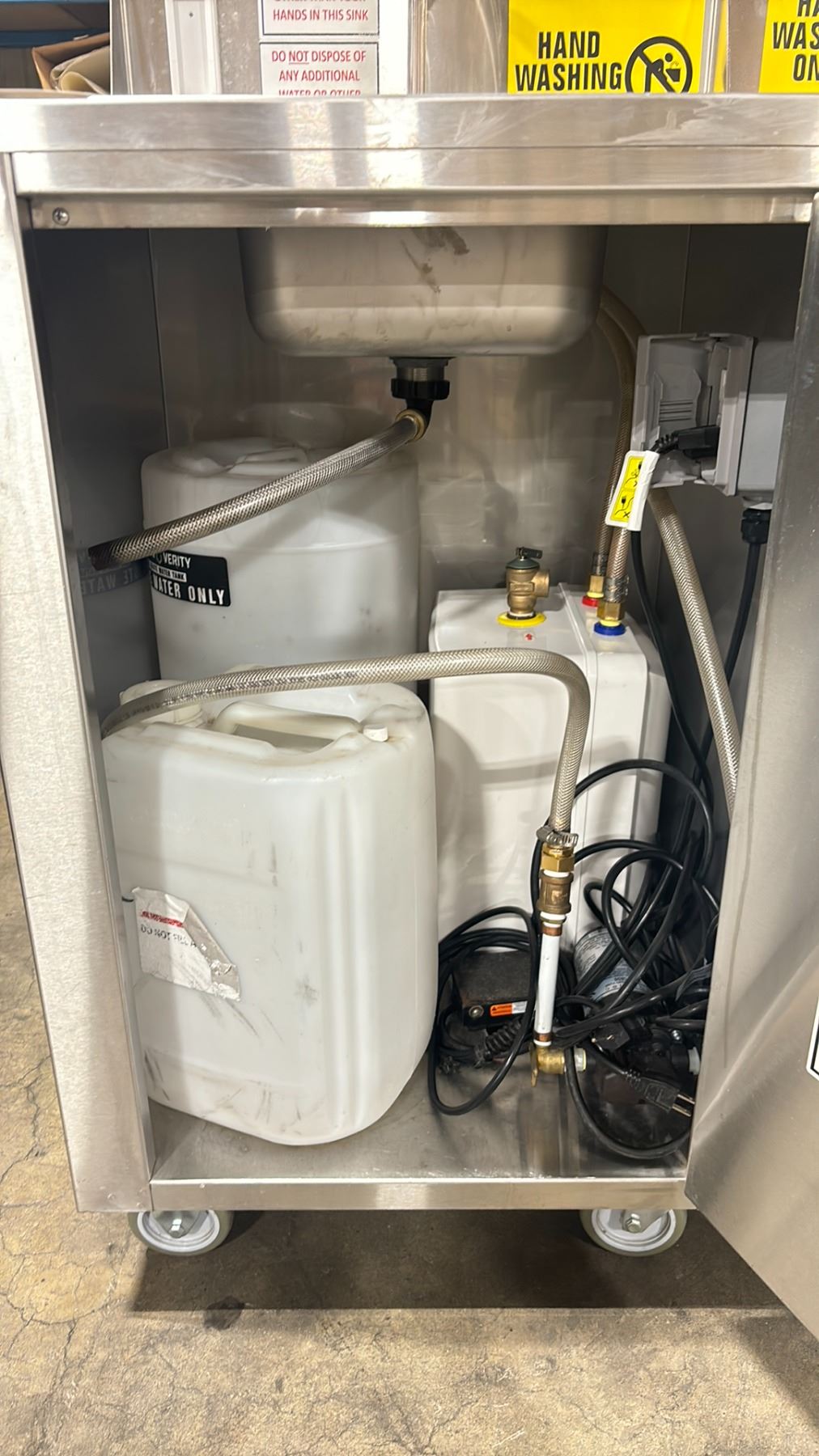 CROWN VERITY CV-PHS STAINLESS STEEL COMMERCIAL ELECTRIC MOBILE PORTABLE HAND WASH STATION WITH MINI TANK WATER HEATER, KEY, & WATER STORAGE JUGS