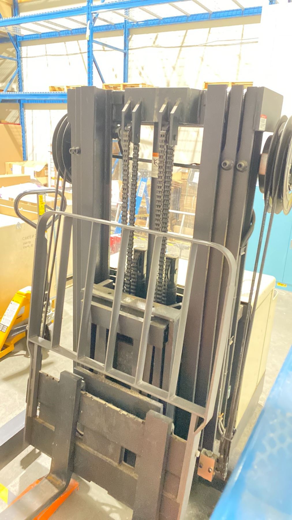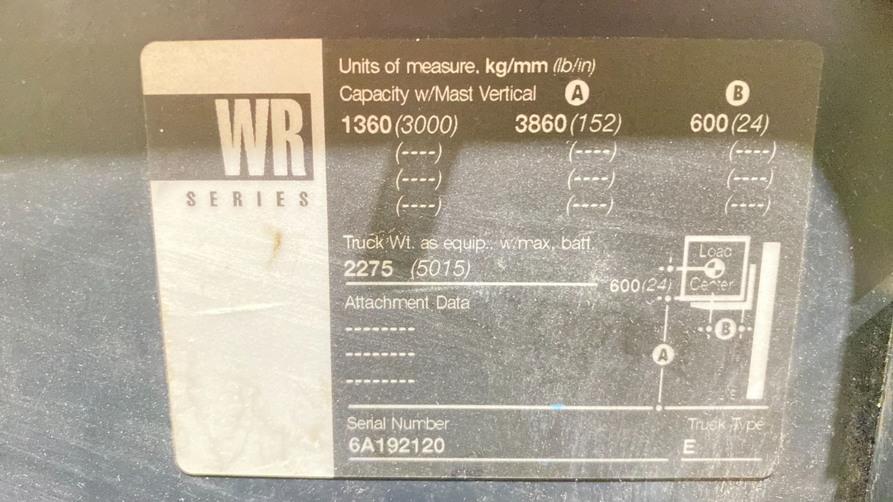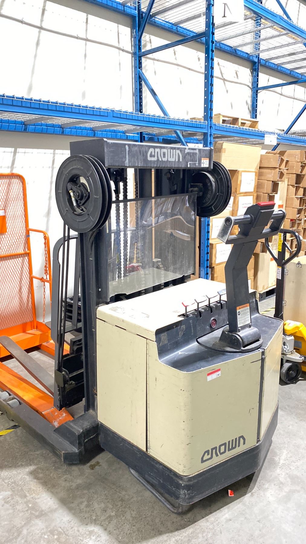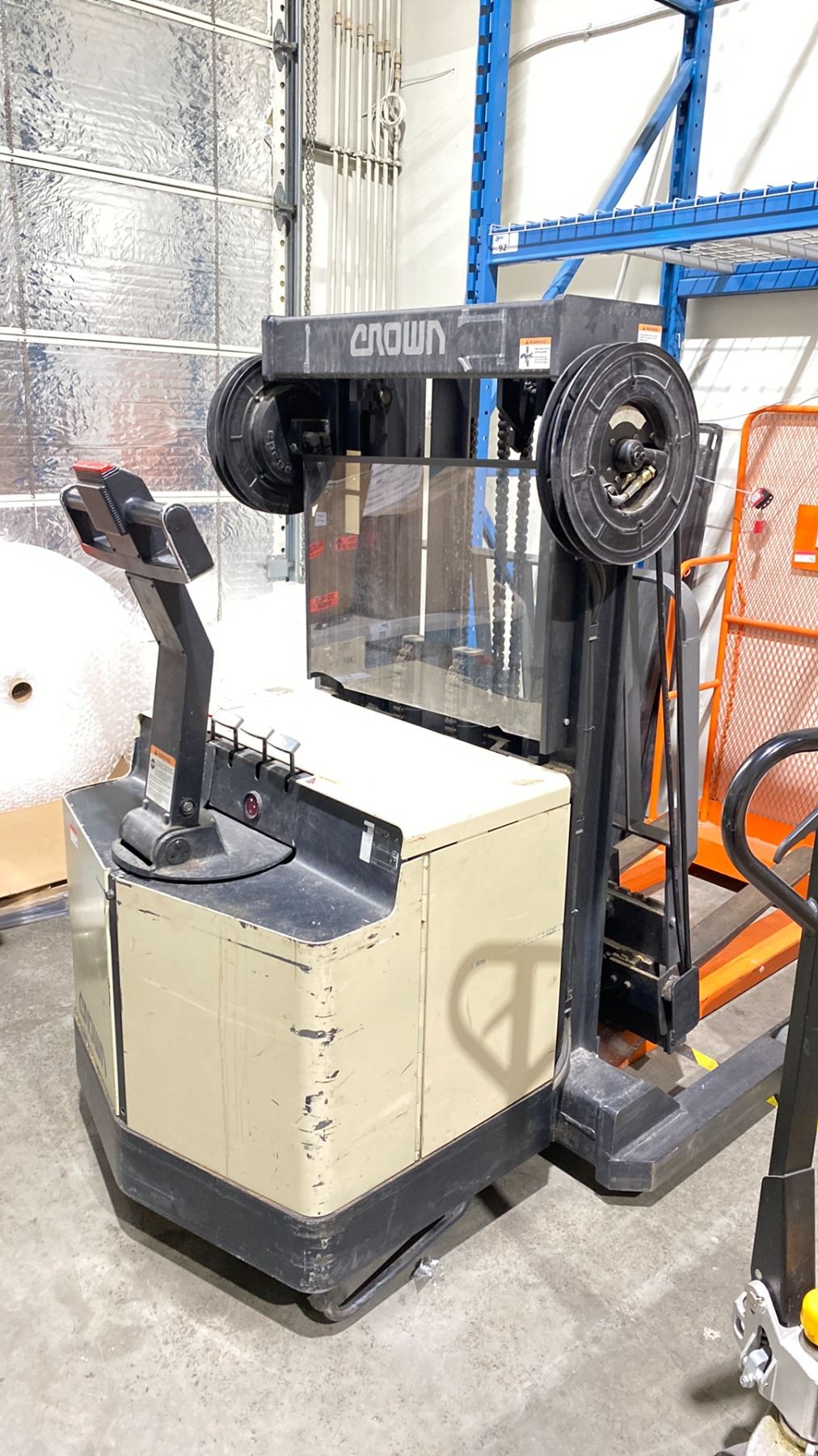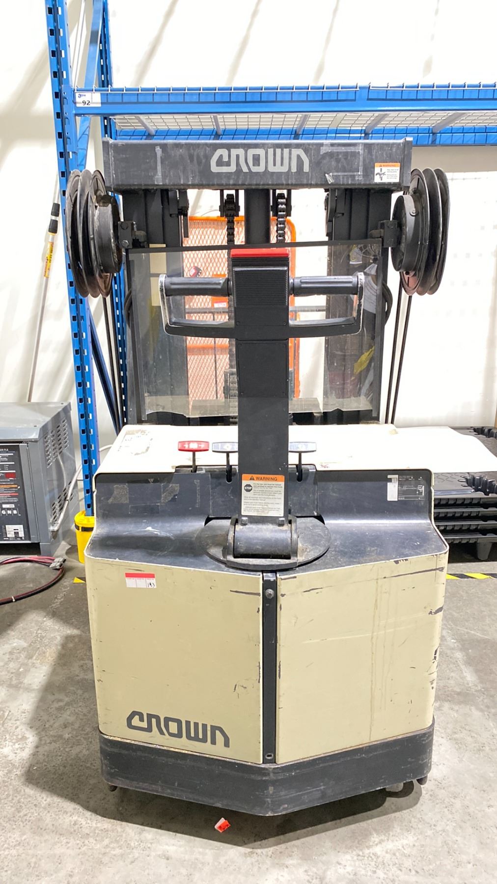 CROWN WR SERIES ELECTRIC WALK BEHIND FORKLIFT MODEL 30WRTT SERIAL #6A192120 WITH CHARGER AND FORK EXTENSIONS, TESTED WORKING, WILL NEED NEW KEY KEY IS BROKEN OFF IN IGNITION (CAN CURRENTLY TURN ON WITH INCLUDED PLIERS)