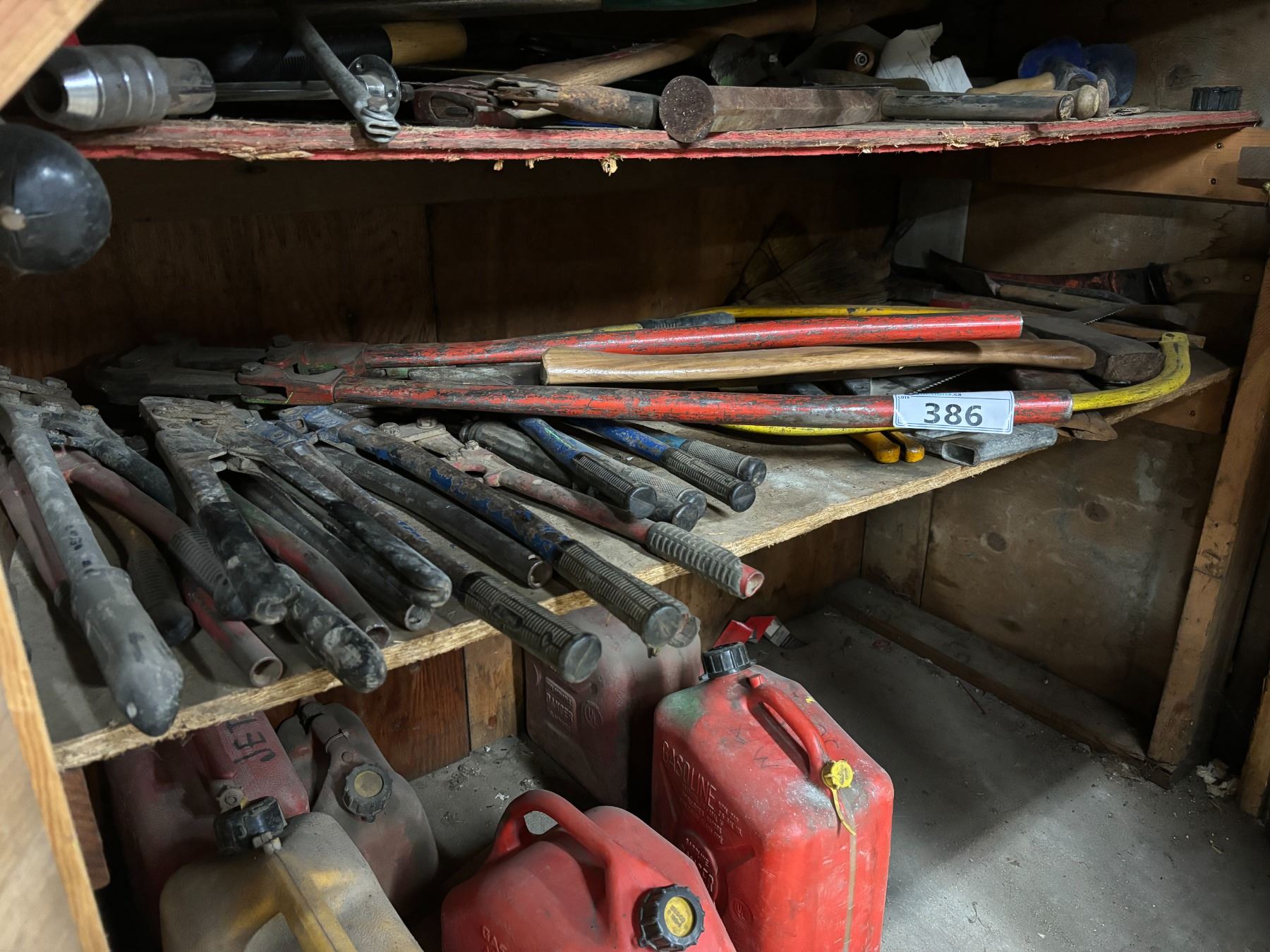 CUPBOARD FULL OF ASSORTED TOOLS-BOLT CUTTERS/HAND SAWS/AXES/ETC