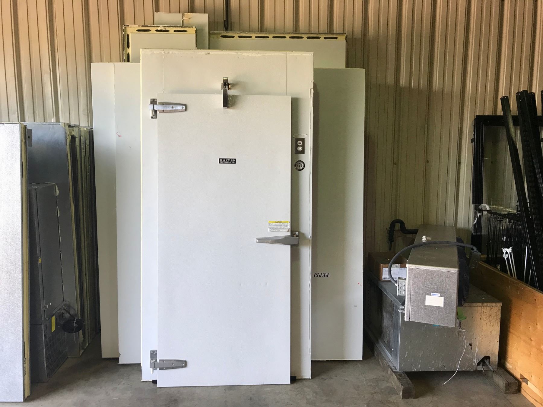 CURTIS REFRIGERATOR 4 DOOR GLASS FRONT WALK IN BEVERAGE COOLER 92"X104"X139" WITH HEATCRAFT COOLING FAN & KEEPRITE ROOFTOP REFRIGERATION UNIT COMPLETE WITH BOTTLE RACKING SYSTEM