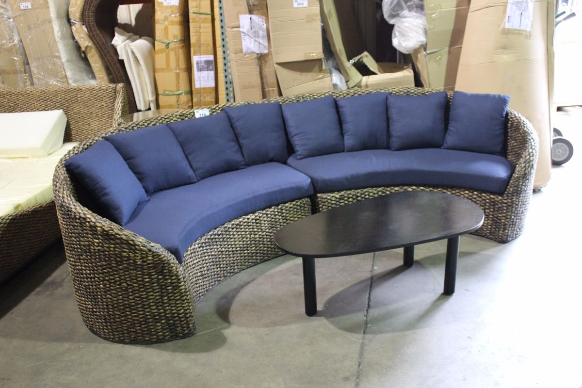 CURVED WOVEN RATTAN & BLUE 2 PIECE SECTIONAL SOFA WITH DARK WOOD COFFEE TABLE