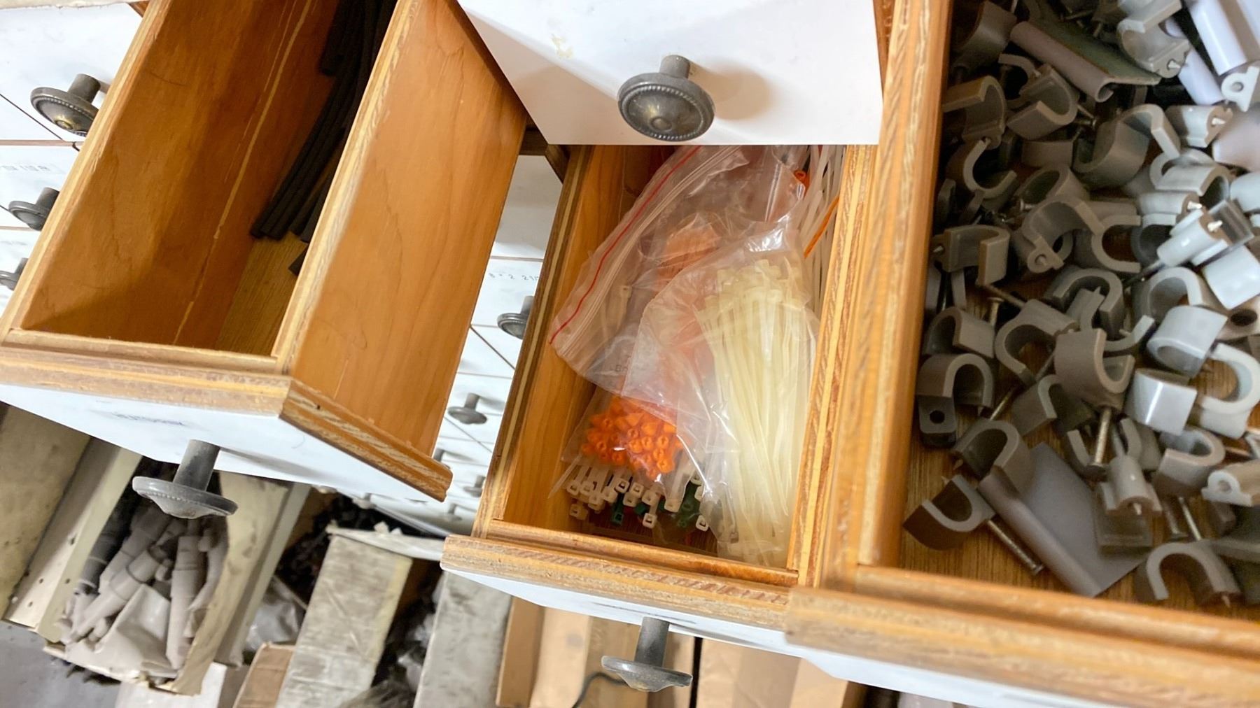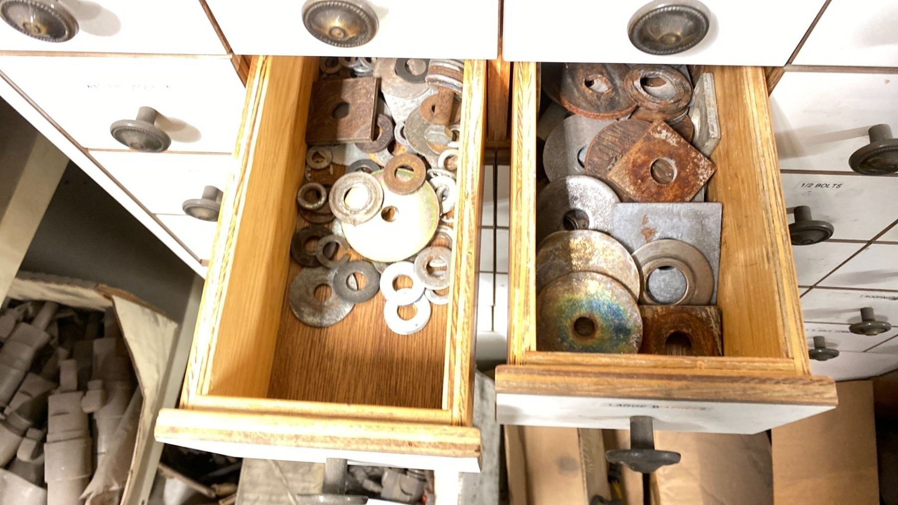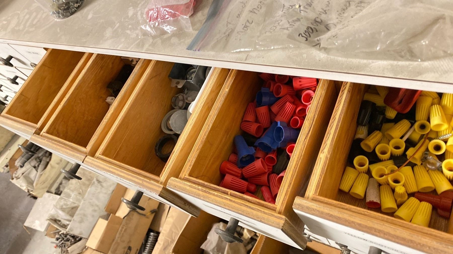 CUSTOM DRAWER UNIT WITH 150 DRAWERS. CONTENTS INCLUDED.