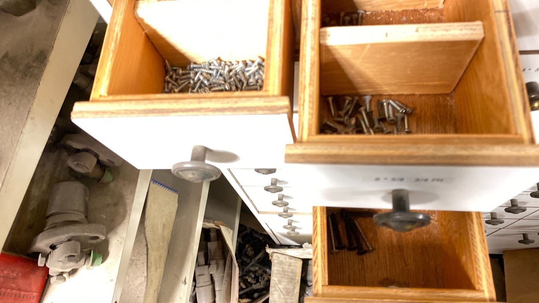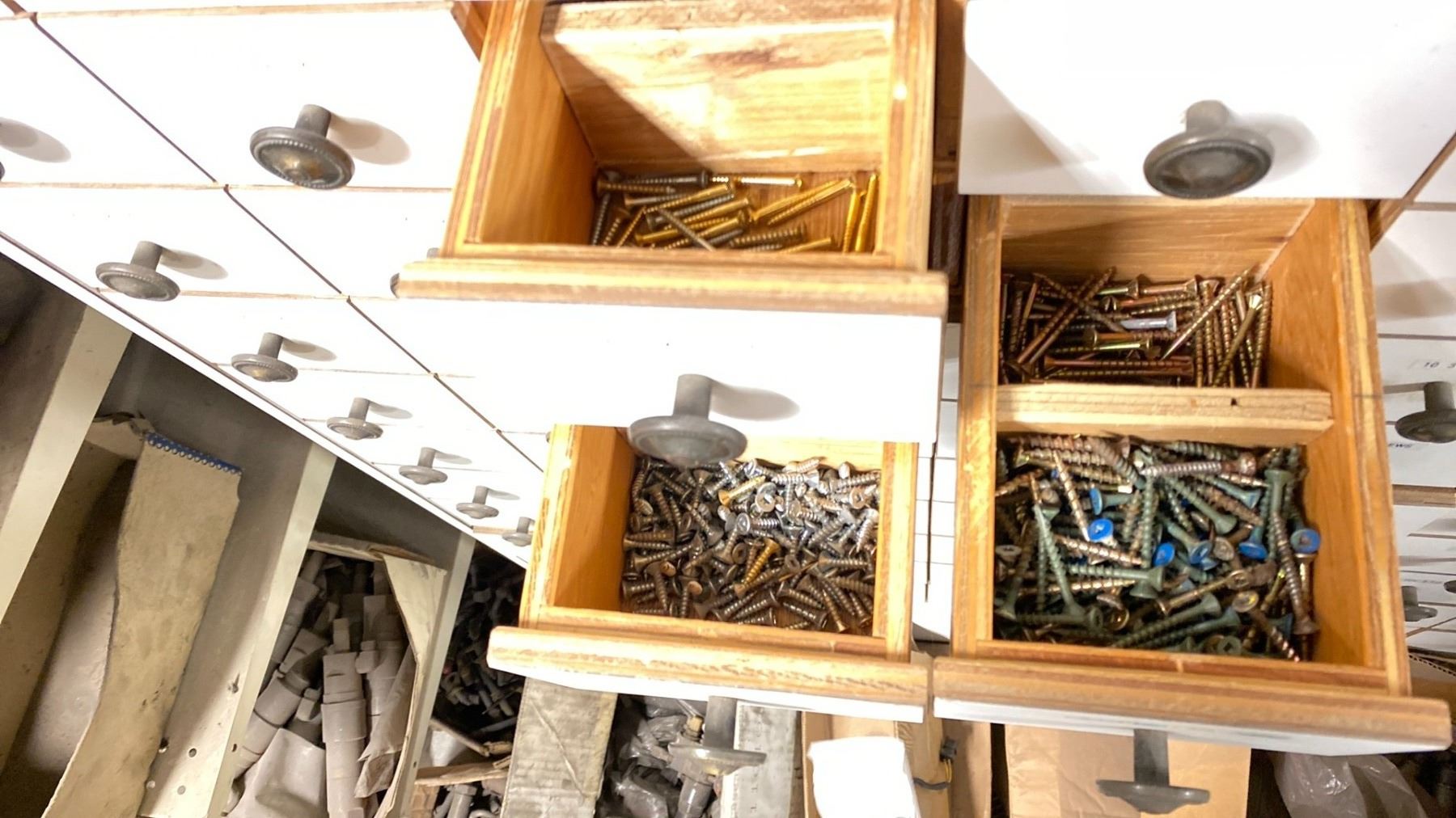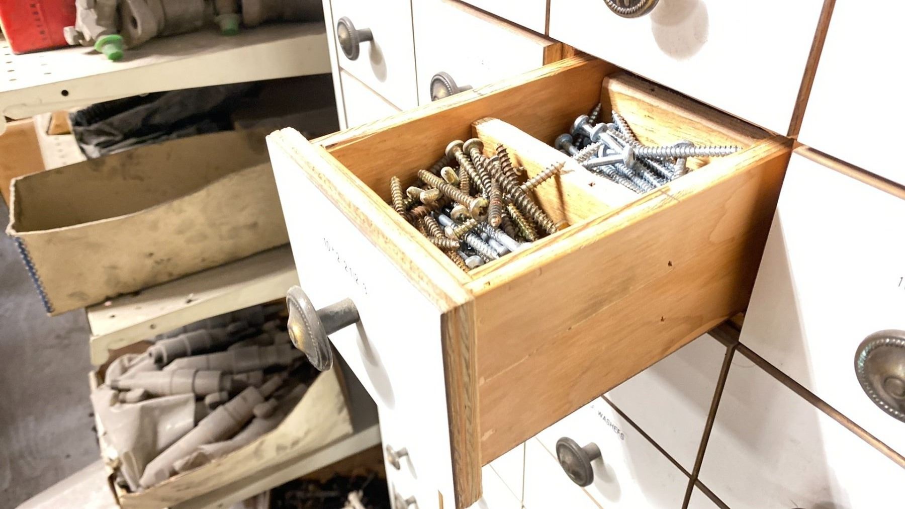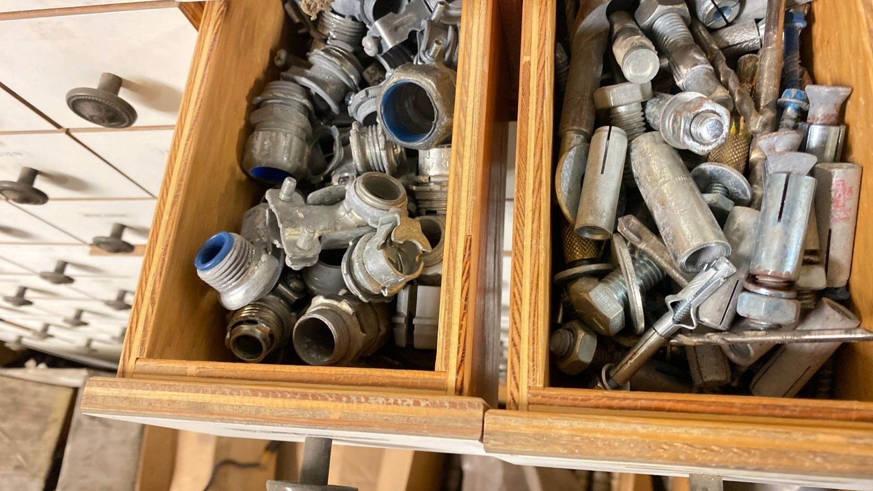 CUSTOM DRAWER UNIT WITH 150 DRAWERS. CONTENTS INCLUDED.