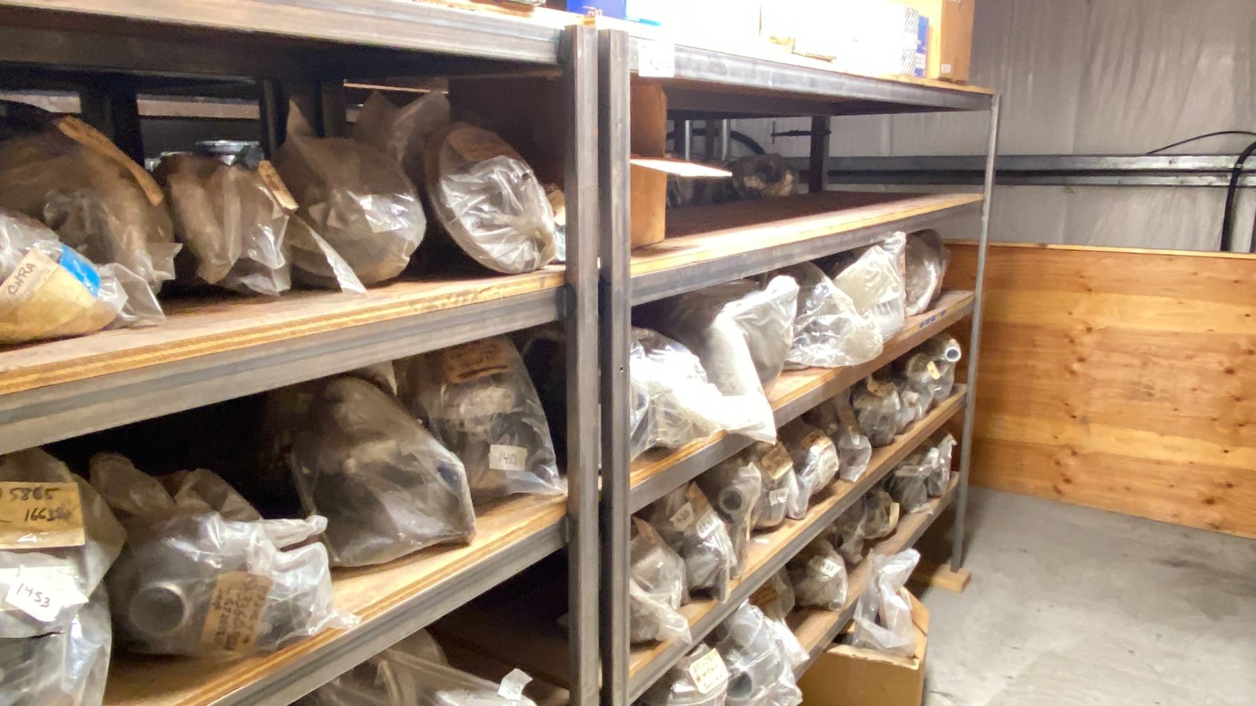 CUSTOM MADE HEAVY DUTY WELDED METAL SHELVING WITH PLYWOOD DECKS. 8'X26 X6'H. CONTENTS NOT