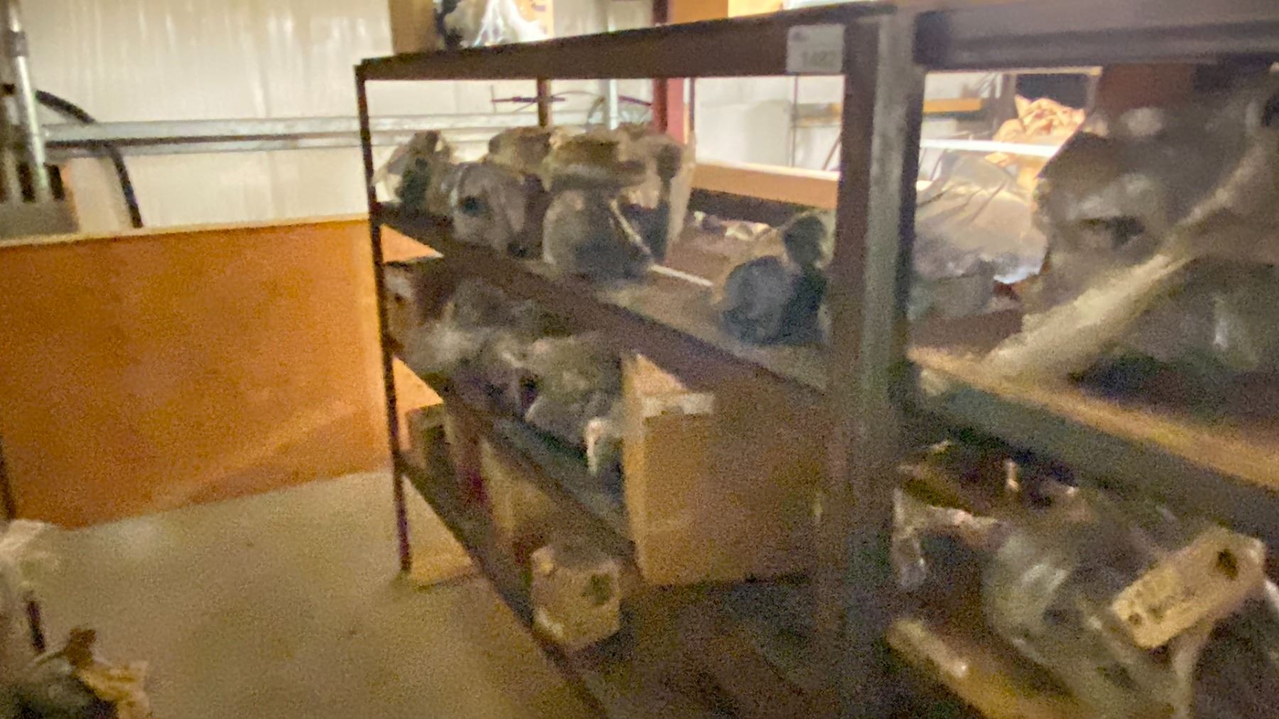 CUSTOM MADE HEAVY DUTY WELDED METAL SHELVING WITH PLYWOOD DECKS. 8'X26 X6'H. CONTENTS NOT