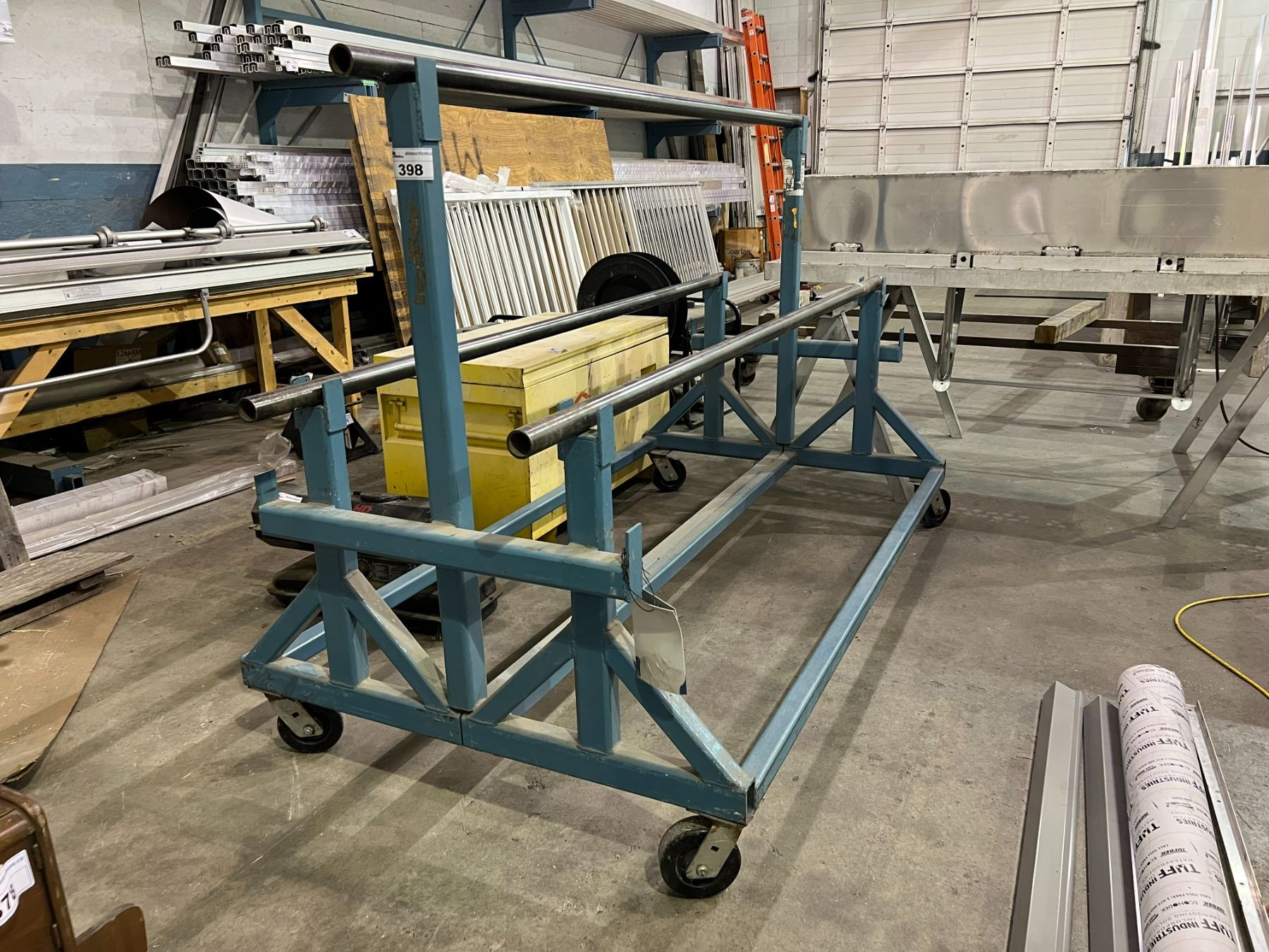 CUSTOM METAL DOLLY (7'6" X 4') 6" WHEELS - USED FOR ROLLS OF VINYL - CONTENTS NOT INCLUDED