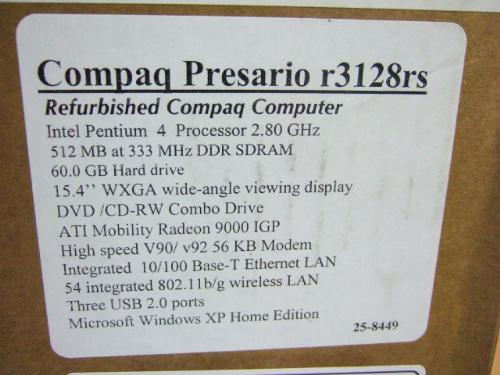 Compaq Presario Intel Pentium 4 Laptop, 2.80ghz, 512MB At 333Mhz DDR Ram, 60GB HD, 15.4" Widescreen Ati Mobility Radeon 9000, 802.11g Wireless Lan, Windows Xp Home