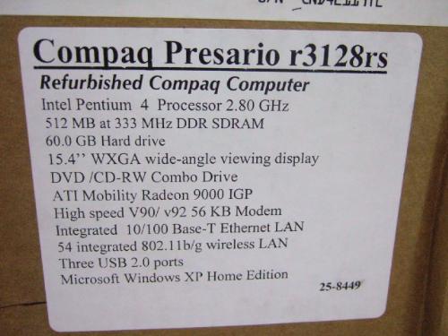 Compaq Presario Laptop, Intel Pentium 4, 2.8ghz 512MB DDR Ram At 333Mhz, 60GB HD, 15.4" Widescreen DVD / CDrw Combo Drive Ati Mobility Radeon 9000, 802.11g Wireless