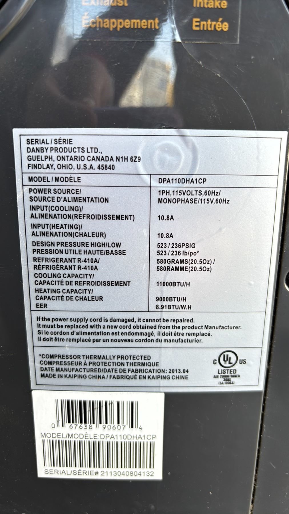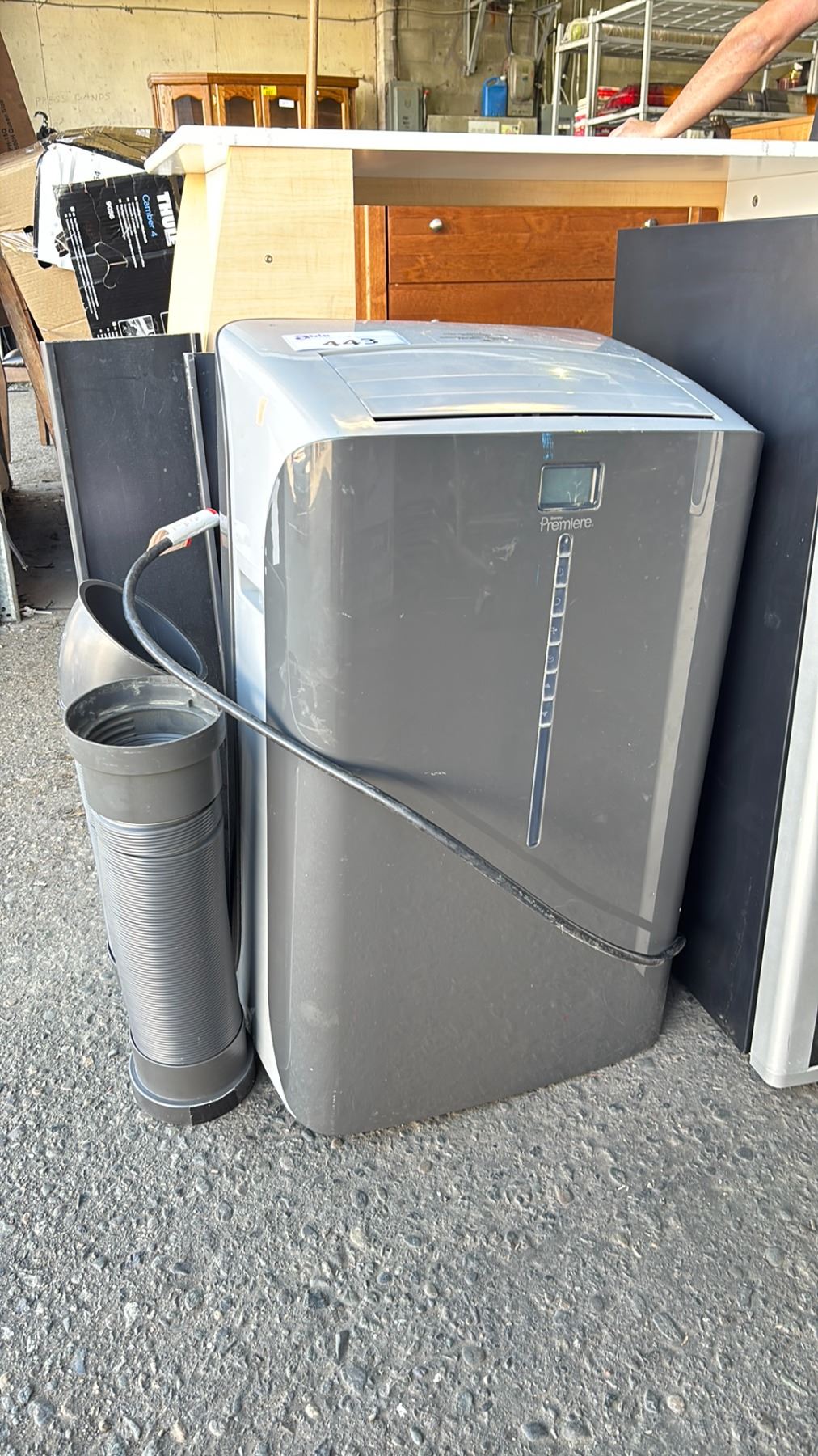 DANBY PREMIERE 11,000 BTU PORTABLE AIR CONDITIONER WITH HOSE (NO REMOTE, 1 WHEEL MISSING)