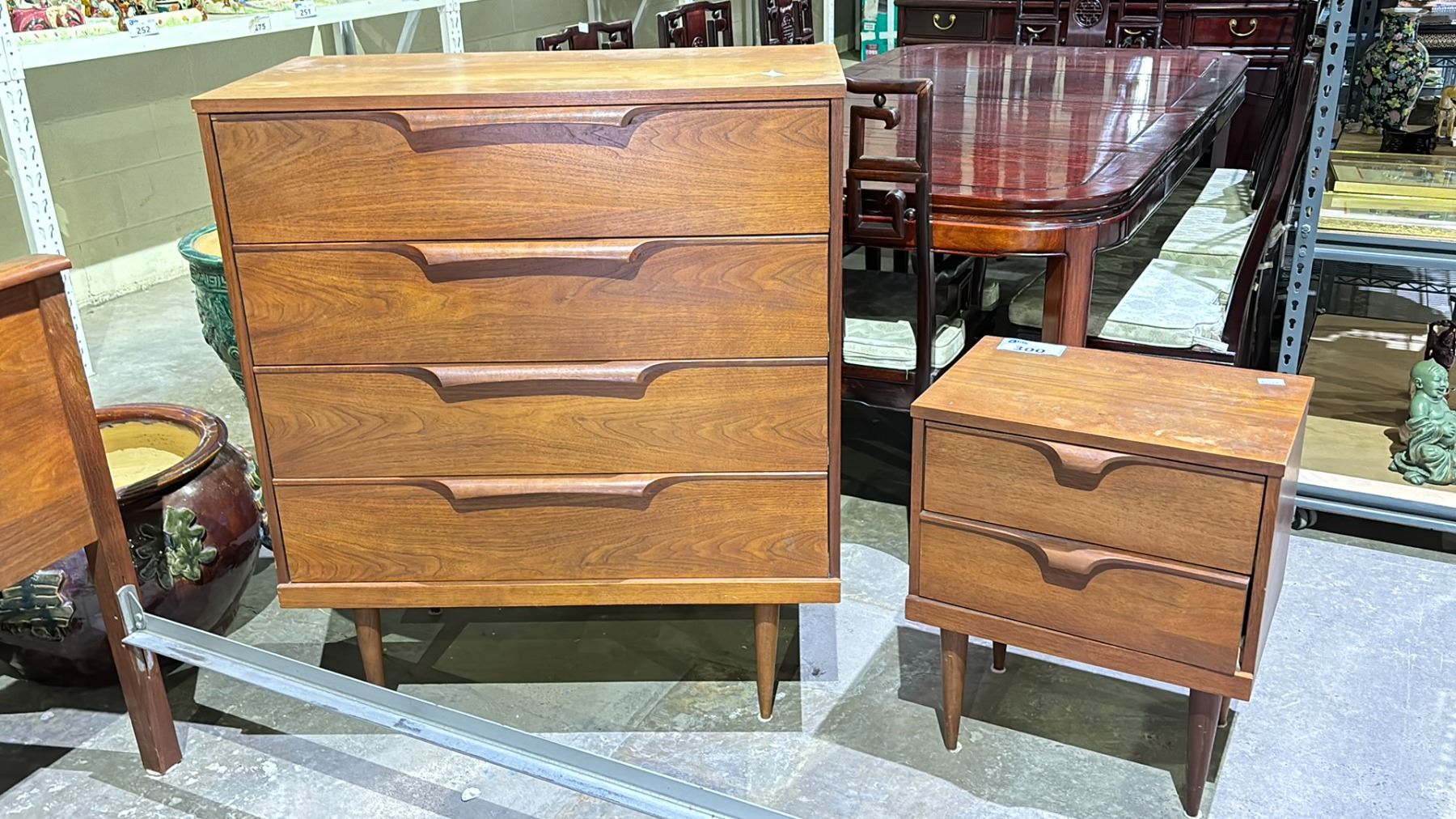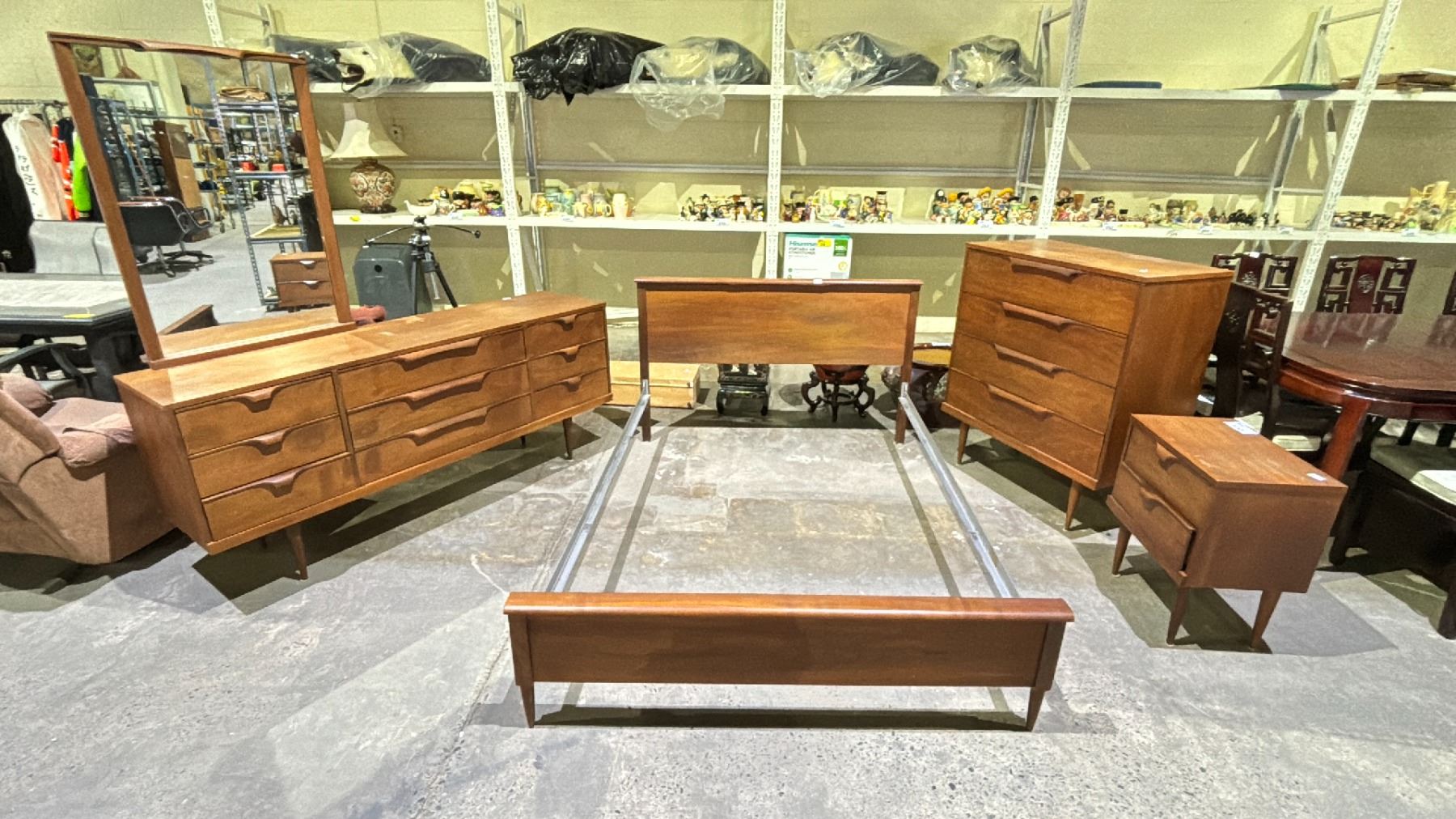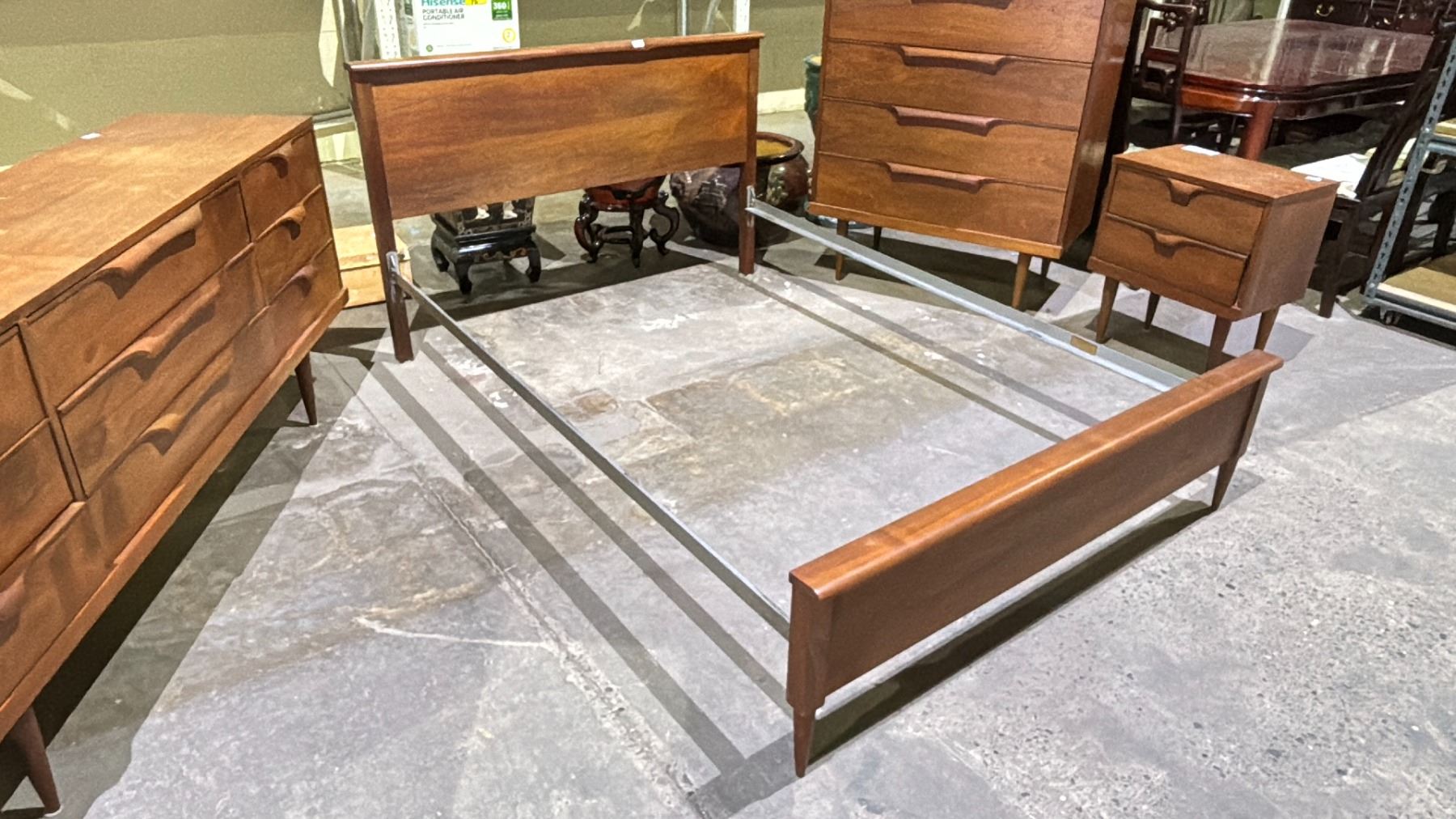 DANISH MODERN BEDROOM SET INCLUDING DRESSERS, SIDE TABLE AND BED FRAME