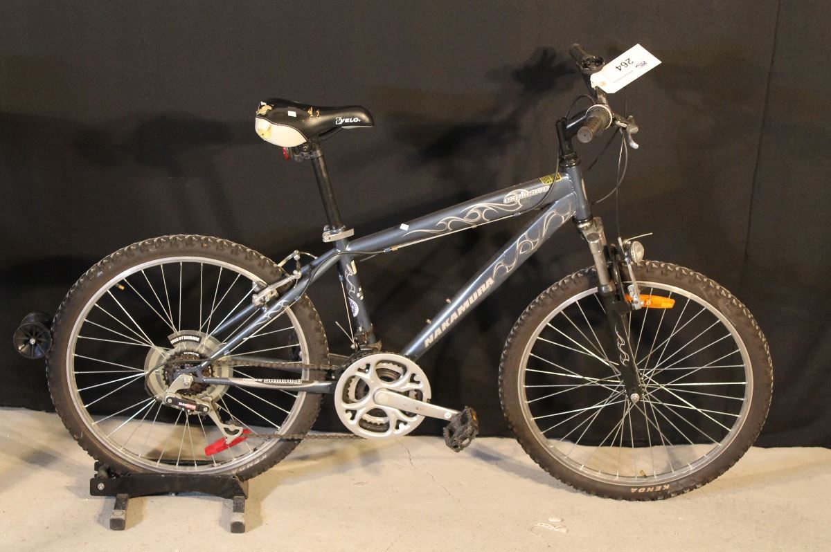 DARK BLUE NAKAMURA EXPLOSIVE 18 SPEED FRONT SUSPENSION MOUNTAIN BIKE WITH KICKSTAND