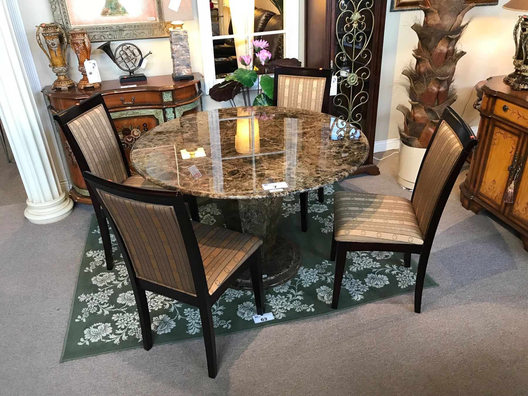 DARK BROWN 120 CM ROUND MARBLE TABLE WITH MARBLE BASE & 4 DARK WOOD FRAMED CHAIRS RETAIL - $ 6000