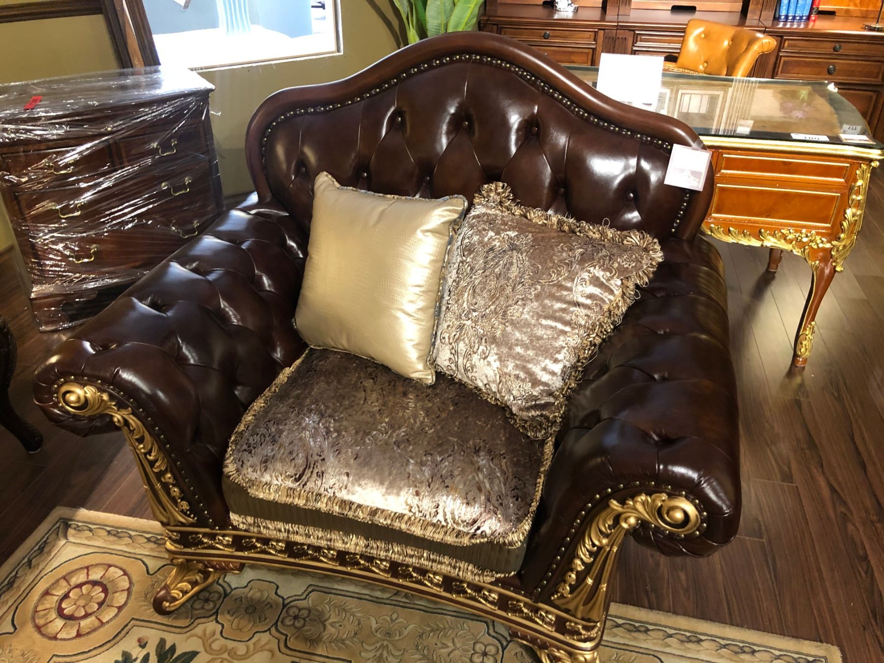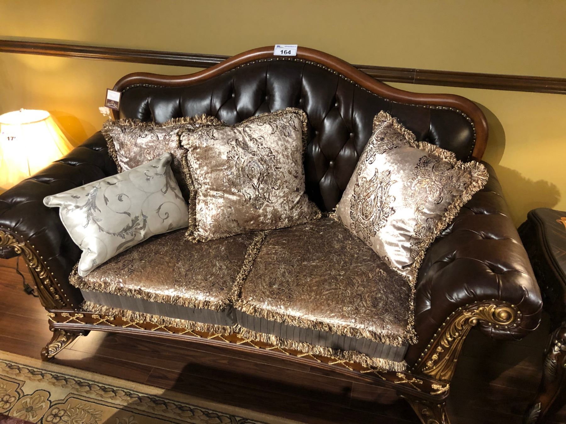 DARK BROWN LEATHER WITH WOOD FRAME LIVING ROOM SET INCLUDES SOFA AND CHAIR WITH THROW CUSHIONS. RETAIL $11,830.00