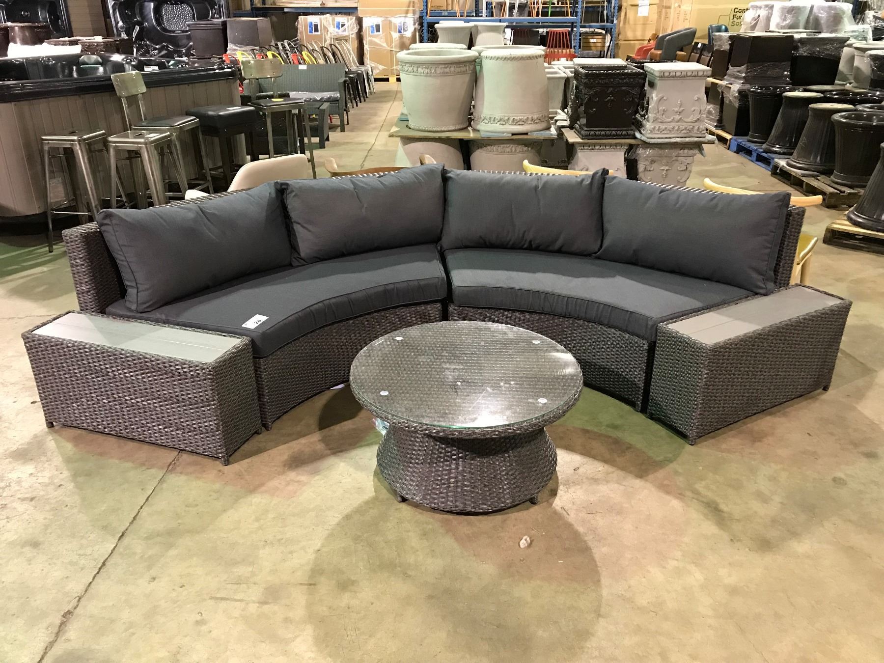DARK GREY VALE CURVED SOFA SET WITH OVERSTUFFED CUSHIONS. SET COMES WITH: 2 PC. CURVED SOFA, GLASS TOP COFFEE TABLE AND 2 SIDE TABLES