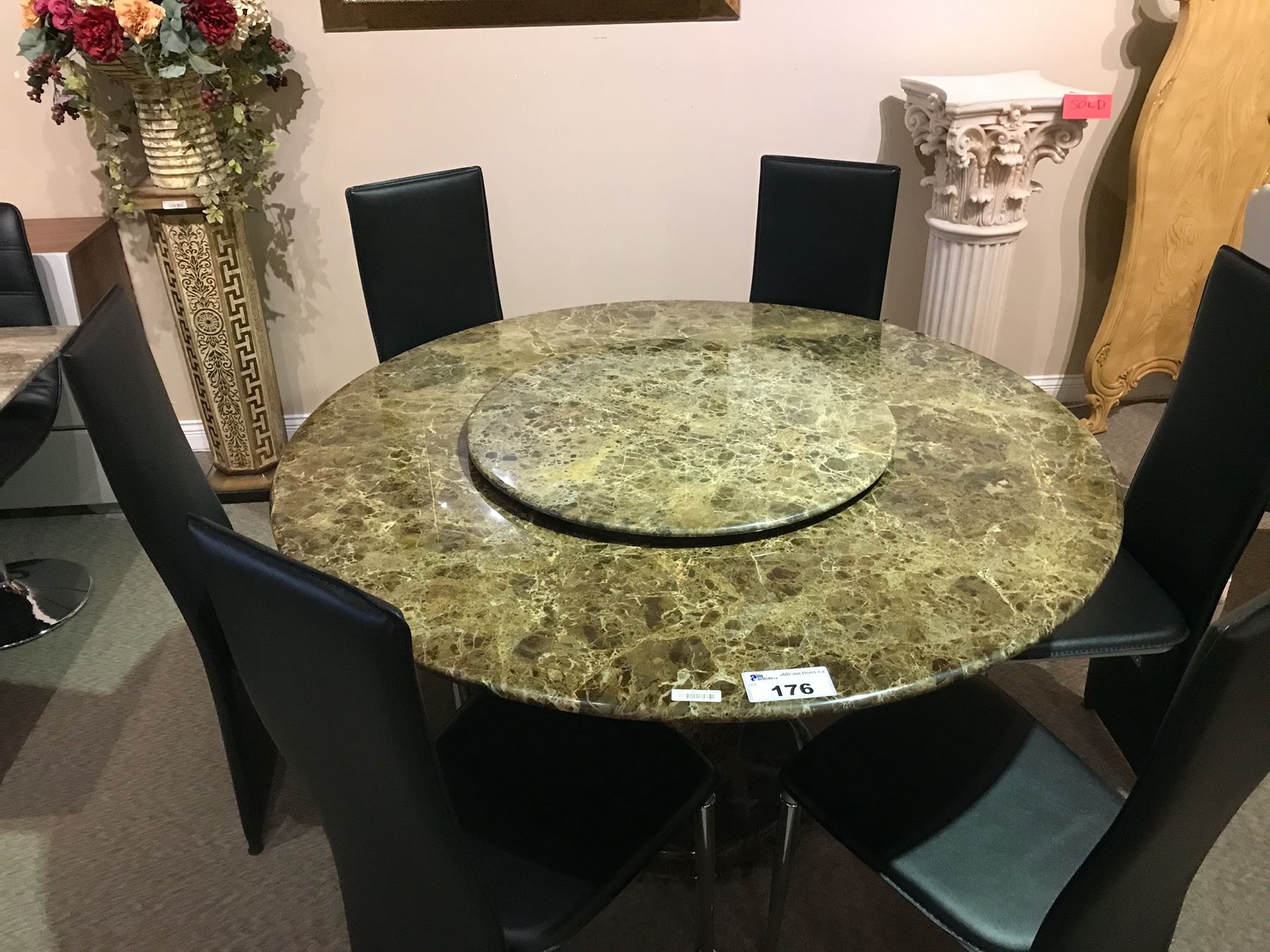 DARK MARBLE ROUND DINING TABLE WITH LAZY SUSAN AND 6 MATCHING BLACK LEATHER CHAIRS, EST. $14,000