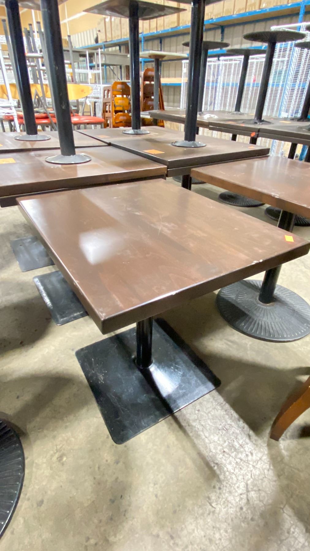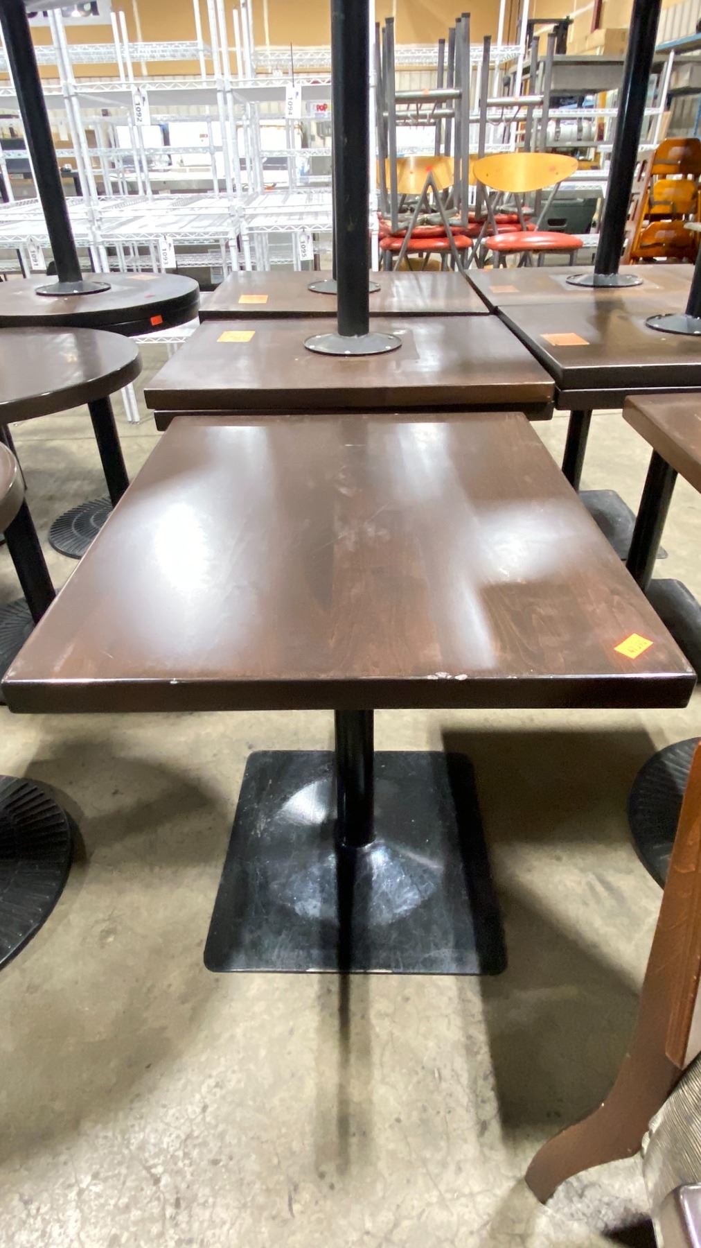 DARK WOOD 30 W X 25 D X 29 H BLACK METAL BASE SQUARE COMMERCIAL RESTAURANT TABLE